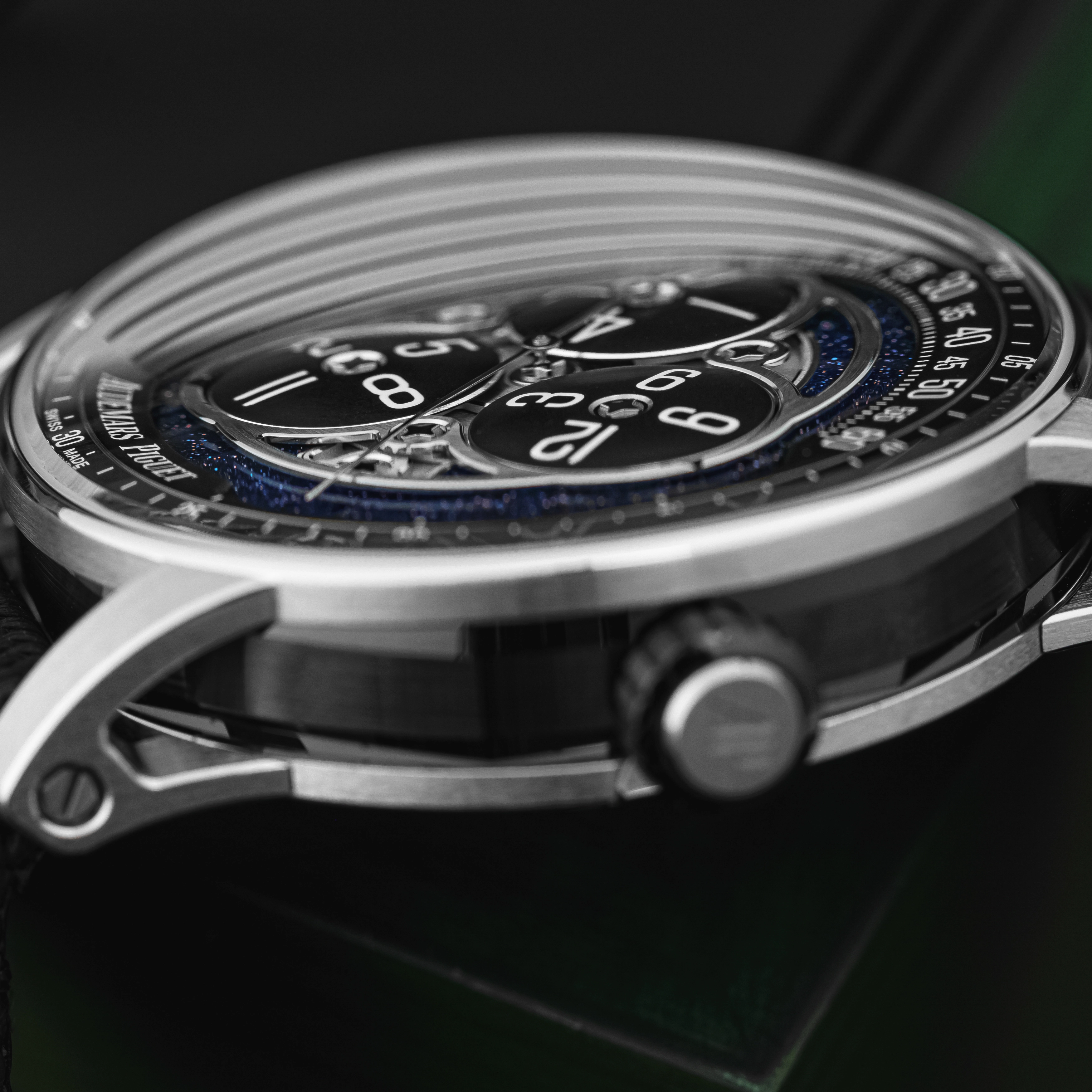 The details don’t end with the case. Audemars Piguet created a compound curve on the crystal surface with two different curve geometries, which creates extreme clarity when viewing the dial. This level of detail in a crystal is uncommon and creates additional visual interest when viewed from the side.