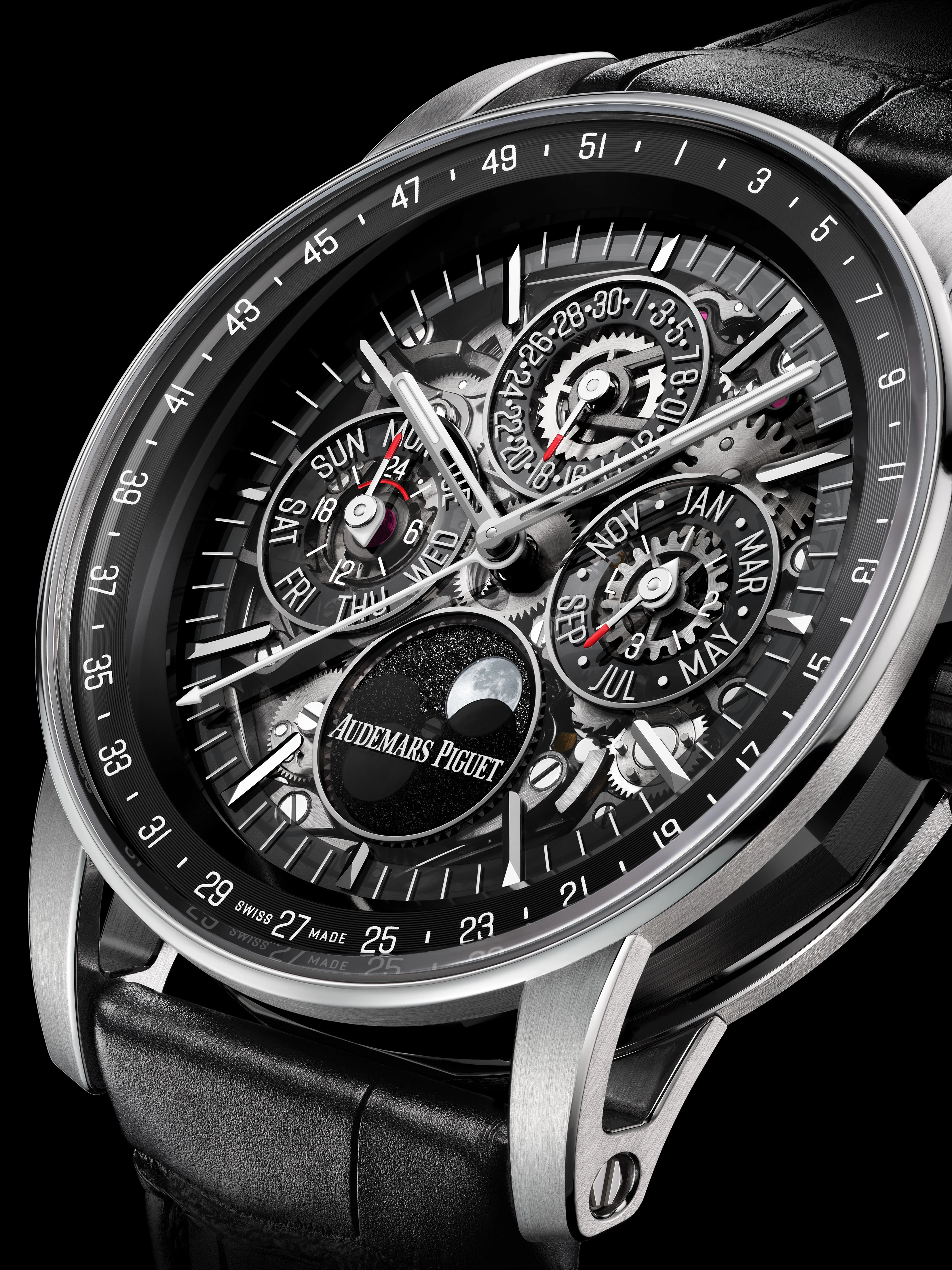 One of the most celebrated models in the collection is the Code 11.59 Perpetual Calendar, one of the most modern perpetuals on the market. On the version with an aventurine dial, the beautiful interplay between the sparkle of aventurine and a calendar complication with a moonphase makes this watch feel almost otherworldly. In recent collections, Audemars Piguet has included guilloché and openworked variants of the same perpetual base.