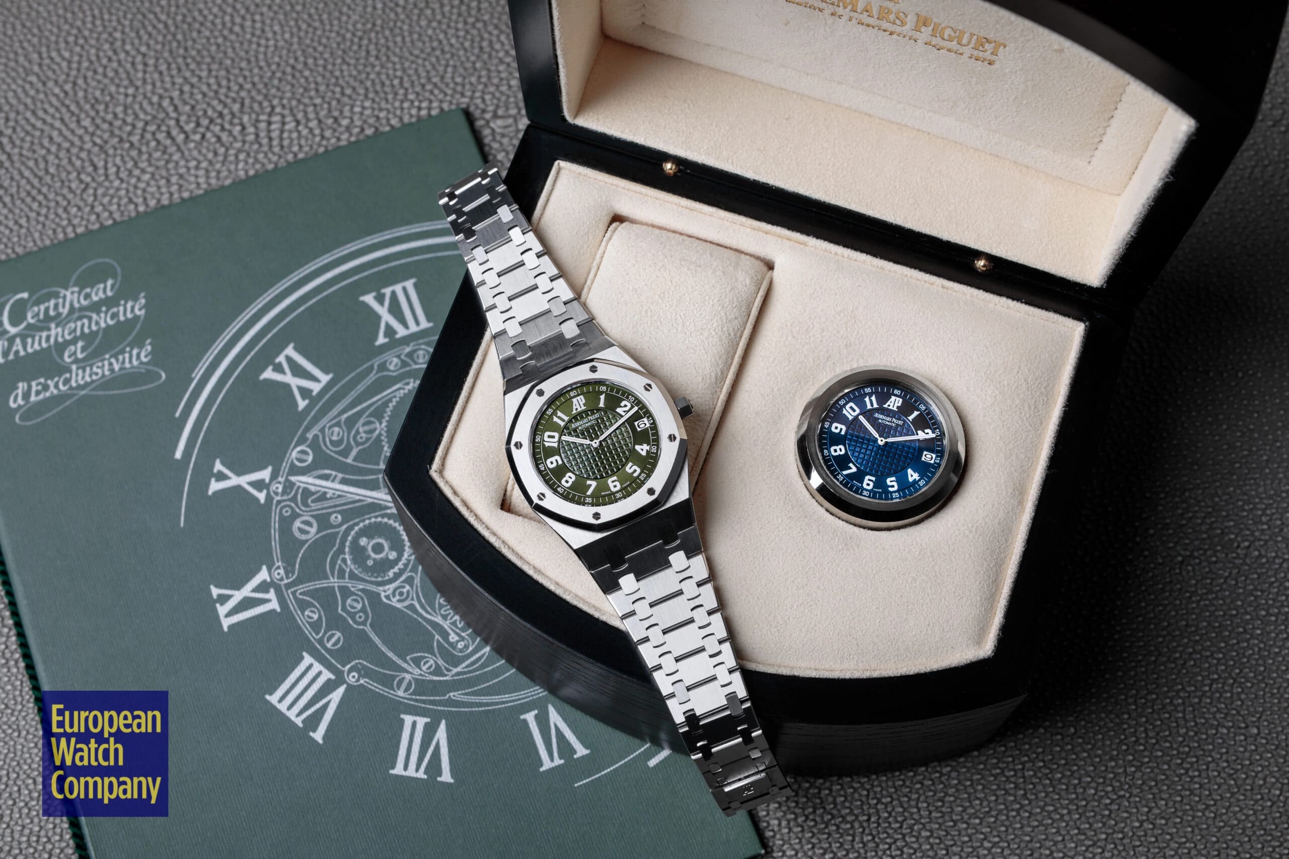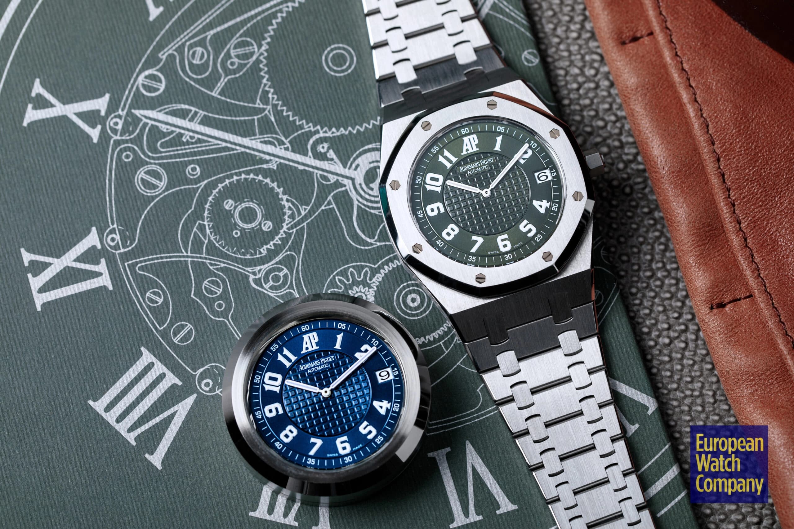 When the original Audemars Piguet Royal Oak was released in 1972, it was totally original. The angular, technical-looking stainless steel watch was a sculpture you could wear. Its price rivaled most precious metal watches from the era, and though it was a bit misunderstood initially, the Gerald Genta designed timepiece eventually solidified itself as a wristwatch legend. It's now one of the most sought-after watch models on earth and commands a huge premium on the second-hand market. However, the most popular version of the Royal Oak is the simple time and date standard production model. The watch we have here is much more special than that. This is the reference 15128ST. It's a very rare stainless steel Royal Oak released in the late 1990s that seldom comes up for sale, and when it does, it's usually at auction. The watch is one of just 50 examples made as an Italian tribute piece, and interestingly, it comes with not one but two unique dials.