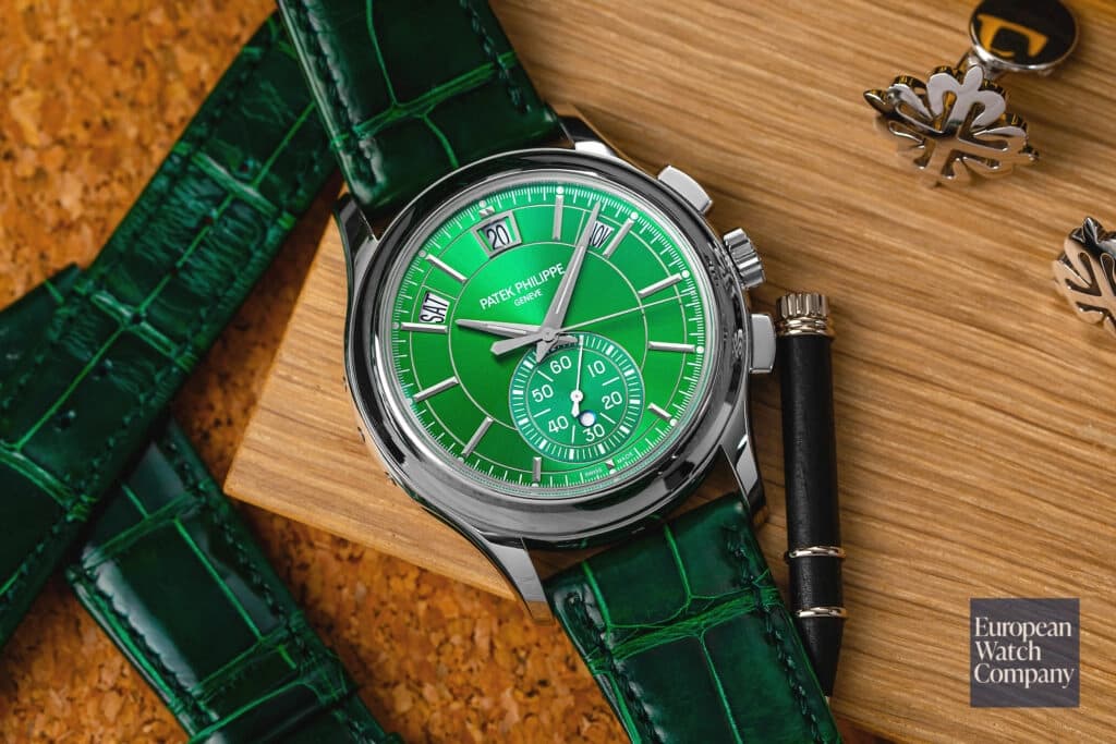 Upon first glance, the Patek Philippe Ref. 5905P-014 Weir & Sons looks just like any other 5905 annual calendar with flyback chronograph. But when you see the vibrant green dial this piece is outfitted with, you realize its something special. One of only 25 pieces made for Weir & Sons in Dublin, this exclusive edition was made to celebrate the retailer’s 150 year anniversary. The caseback is engraved with the anniversary, and Patek has decorated the box and matching cufflinks to celebrate Patek’s relationship with this historic retailer. It’s watches like the 5905P that are noticed by the most discerning collectors. Whether others recognize it or not, this watch is extremely rare, one of just 25 pieces. This is a true limited edition gem for Patek Philippe.