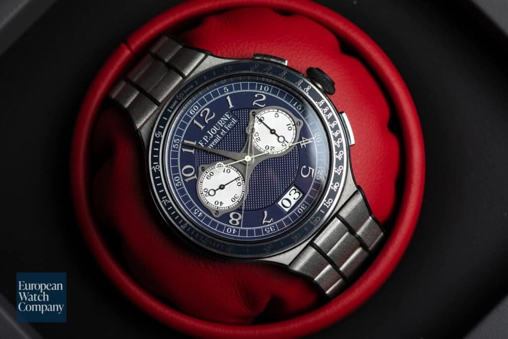 The F.P. Journe Octa Chronographe Ruthenium Edition, while discontinued, is one of Journe’s more subtle designs. The dial is well balanced between the time and the chronograph functionalities, and a large date is visible between 11 and 12 o'clock. This particular variant of the Octa Chronographe, limited to only 99 pieces, is especially valuable featuring a ruthenium coated dial and movement. The Octa Chronographe was Journe’s first chronograph (later replaced by the Centigraphe), but it remains one of our favorite Journe designs. It’s a shame this model is no longer made today!