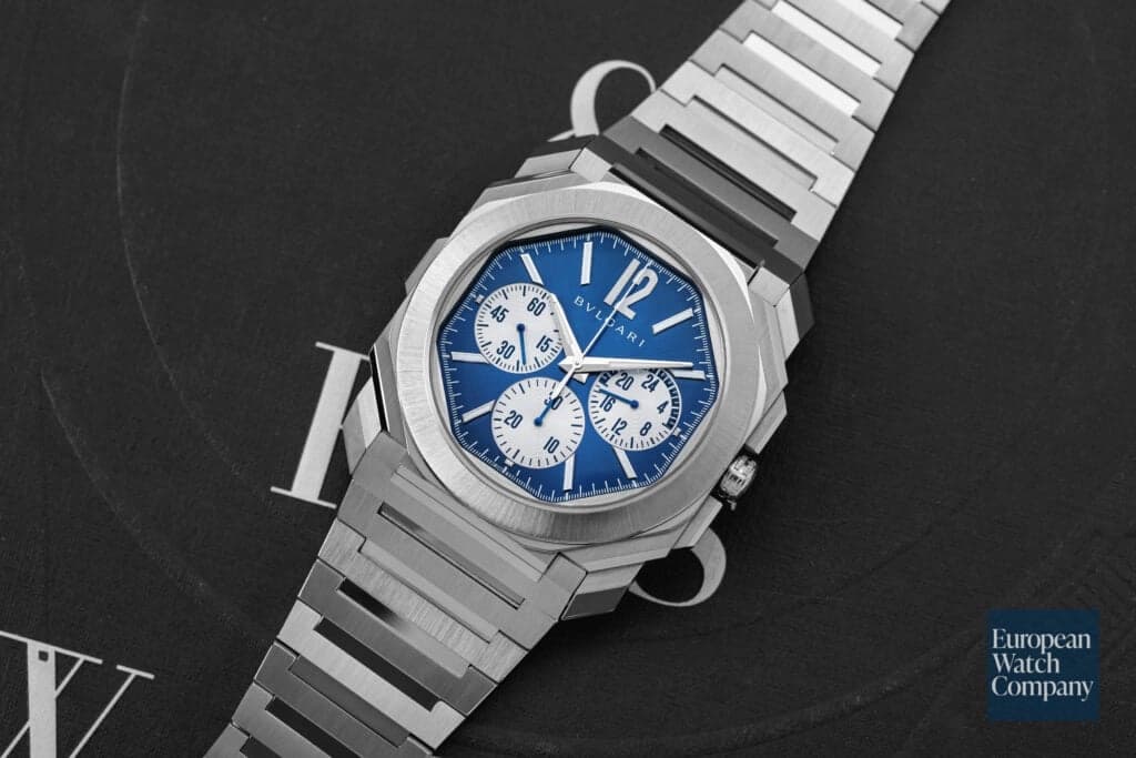 The Bulgari Octo Finissimo is perhaps the most lauded stainless steel sport watch to be introduced in the last ten years. Launched in 2014, the Genta-esque square design and ultra-thin case struck a chord with collectors worldwide. Since the Octo Finissimo's initial release, Bulgari has continuously built out the collection with tourbillons, skeletonized dials, and other complications. The Chronograph GMT seen here takes the standard Octo Finissimo stainless steel case and fits it with both chronograph and GMT functionalities. The ever-popular blue sunray dial brings some additional visual interest and makes it a compelling buy at a very reasonable price-point.
