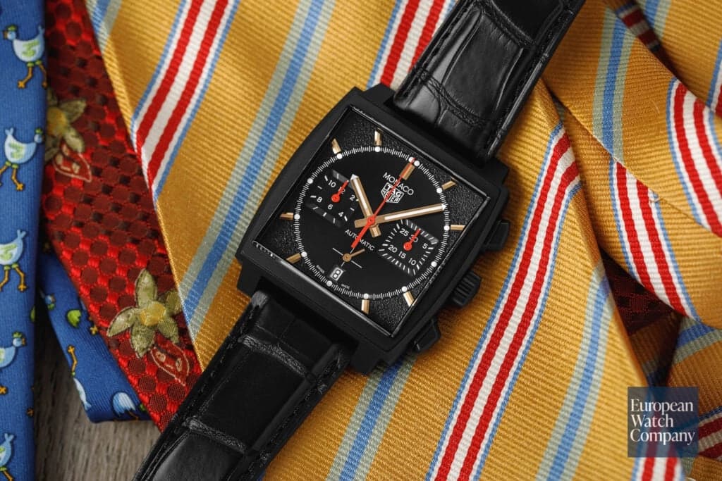 When it comes to modern chronographs with heritage that don't break the bank, the TAG Heuer Monaco is a great option. Launched in 1969, the Heuer Monaco gained fame when Steve McQueen prominently wore the watch in the 1971 film Le Mans. The limited edition ref. CBL2180 Monaco seen here pays tribute to a similarly blacked out vintage model known as the "Dark Lord". It takes the same chunky design we've come to love and modernizes it with a black DLC titanium case and rose gold indices and hands. At 39mm, the watch wears a bit larger because of its rectangular design, but this is negated somewhat by the shorter than normal lugs. The TAG Heuer Monaco is a great option for any motorsport enthusiast who is looking for their next chronograph.