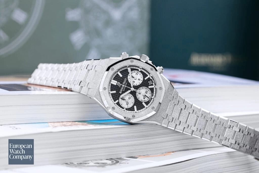 The final AP on our list is truly a class-defining chronograph: the ref. 26239BC Royal Oak Chronograph in "frosted" white gold. This piece's beauty shines not only in its complication, but even more so in the finish of its case and bracelet. While all Audemars Piguet watches have a reputation for exceptional case and bracelet finishing, this "frosted" gold variant takes the finishing detail to completely different level. First introduced in 2016, AP’s frosted finish is achieved by repeatedly hand-hammering the surface of the gold with a diamond-tipped tool. The resulting finish captures and reflects light unlike anything else with each piece being truly unique. You can keep your diamonds and sapphires, give us "frosted" white gold any day!