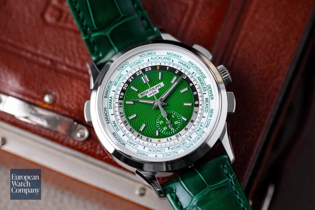 A combination of both a world time complication and a flyback chronograph, the 5930P is a contemporary Patek offering, released in 2021. The watch features a green center dial with circular hand-guilloche and chrono register, surrounded by a day-night indicator and concentric world time rings that enable the wearer to track different time zones. Patek Philippe has coupled the 5930 with an automatic winding caliber CH 28‑520 HU for convenience in daily wear and 48-hours of continuous power reserve. It is always exciting to see brands like Patek experiment with bolder colors like the green seen here that would have been considered unthinkable in the past.