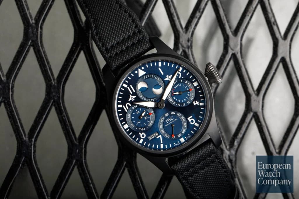 IWC is probably best known for its pilot watches, and while you might not expect to see a complication like a perpetual calendar in a big, utilitarian pilot watch, feast your eyes on the Big Pilot Perpetual Calendar IW503001. All 46.5mm of it! Mechanically programmed to accurately track the date for 500+ years, the IWC Big Pilot Perpetual Calendar "Rodeo Drive" LE is a bolder and more informal approach to the perpetual calendar, which is why we love it. With a mammoth 7-day power reserve, a moon phase display at 12 o'clock that shows both the northern and southern hemispheres (with little white airplanes to indicate which is which), and a four digit year aperture between 7 and 8 o’clock, the Ref. IW503001 is a great choice if you are looking for a bold and sporty perpetual.