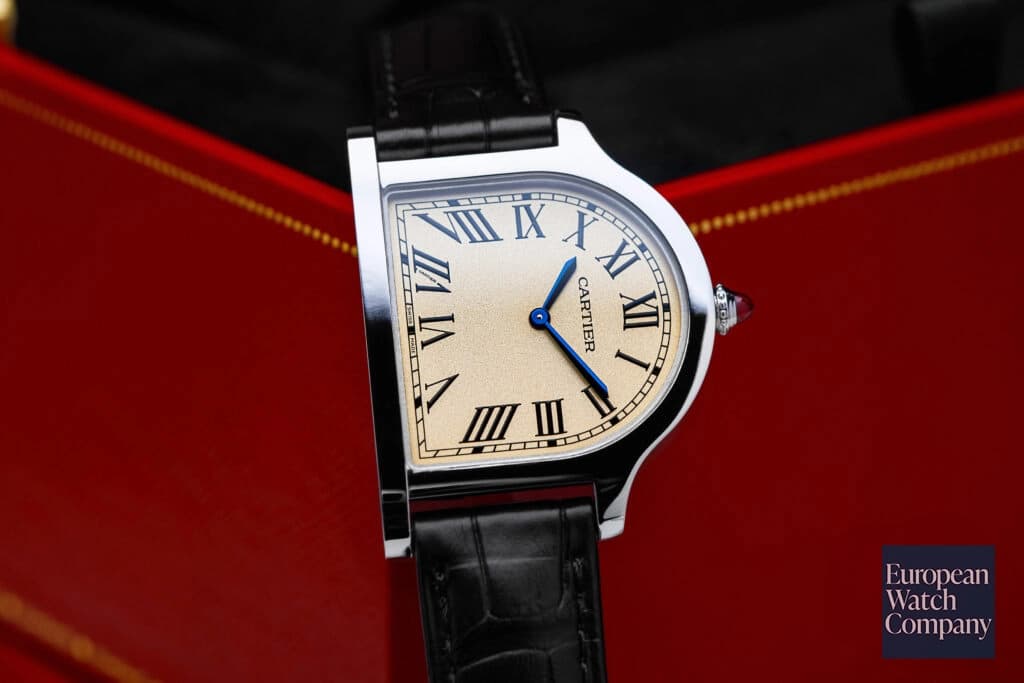It's easy for an ultra-thin watch to rely on its slender profile as its sole defining characteristic. That is very much not the case with Cartier's Cloche de Cartier. Inspired by a historical watch from the 1920s, the Cloche takes its name (and shape) from the French word for 'bell', and the design is nothing if not striking. Not only does the shaped case mix straight lines with curves, but the unusual layout, which sees the numerals rotated 90 degrees, is surprisingly legible.