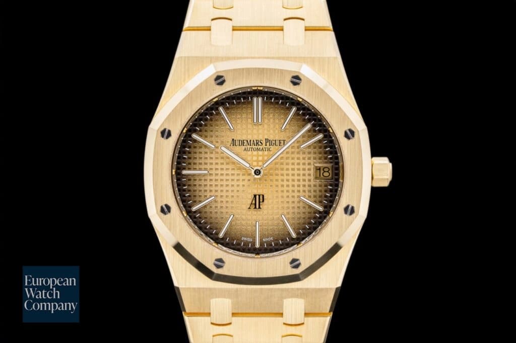 If you are looking to pick up a true grail piece with yellow (or yellow gold) dial, the Audemars Piguet Royal Oak Ref. 16202BA would be my pick. This watch is just special. And the true star of the show isn't the yellow gold case or bracelet, but the gradient dial. The dial not only includes AP's signature Grand Tapisserie pattern, but the pattern is a gradient. In the middle of the dial, it is a gold-yellow color, which darkens to black around the outside of the dial. It is truly stunning and will definitely be a conversation piece if you manage to pick one up.