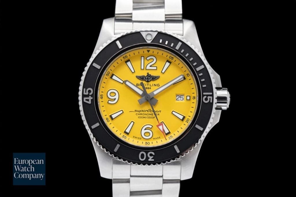 If you are looking for a solid tool watch without breaking the bank, you should definitely look at Breitling. From pilot's watches to divers, the brand is known for producing some very high quality watches at a more affordable price-point. And the SuperOcean Ref. A17367 is a no-frills diver that also happens to have a fun yellow dial. And this watch is a true diver. It boasts a whopping 1,000 meters of water resistance. So, if you want an affordable dive watch to accompany you on your next deep water dive, the SuperOcean Ref. A17367 is the perfect choice.