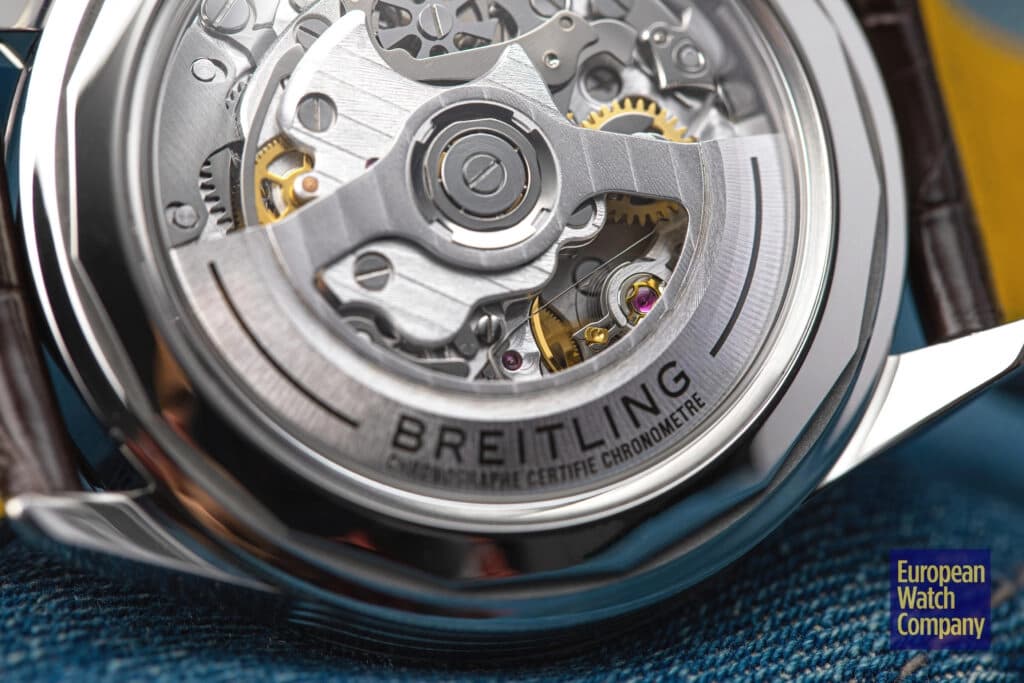 The caliber 25 is chronometer-certified in spite of the large array of complications, and is rhodium plated for resistance to corrosion. Breitling has applied Côtes de Genève to the automatic winding rotor and movement bridges, and perlage is visible on the baseplate.