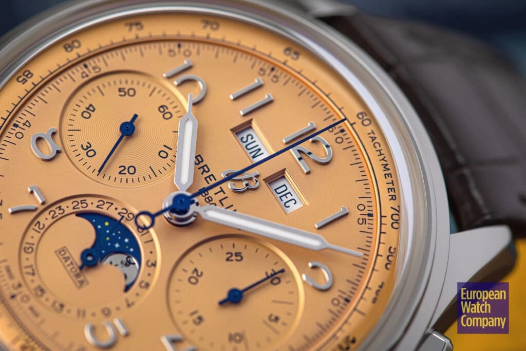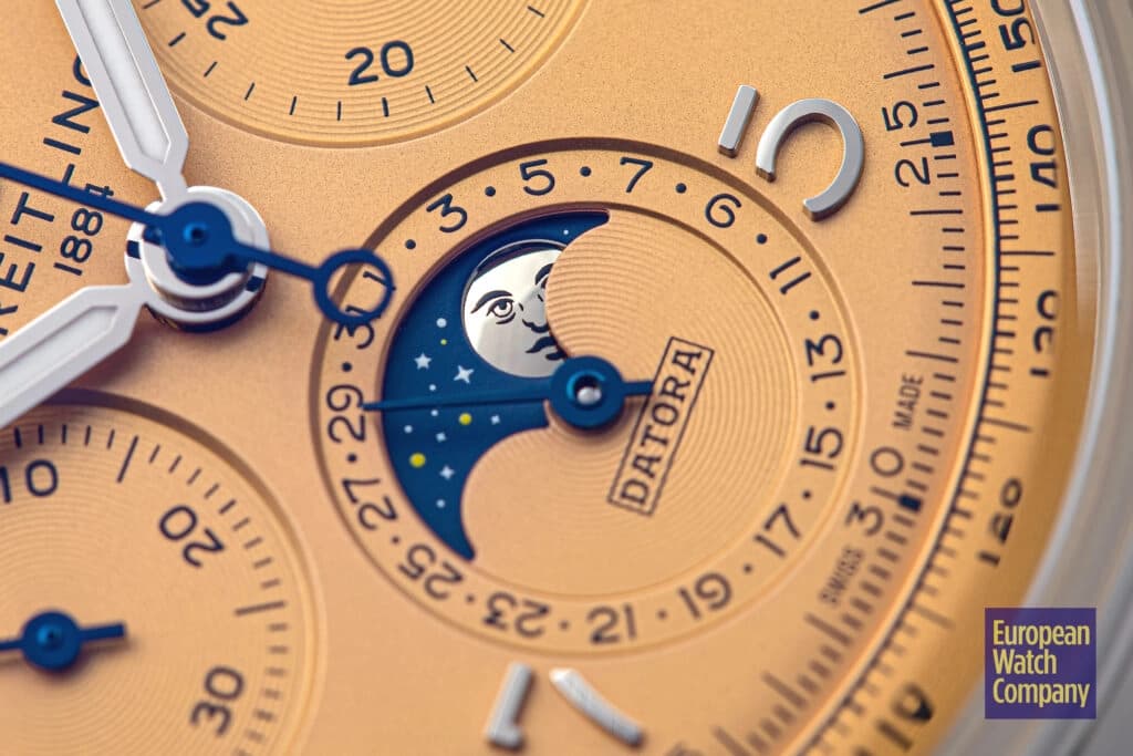 The Breitling Premier B25 Datora is riddled with details and refinements to the case and dial. From a topographical perspective, the dial has raised numerals, sunken day and month aperture windows, stepped chronograph registers, and double stepped coaxial date and moonphase. Each subsidiary display is snailed for further texture. Around the exterior of the dial, the tachymeter scale is set on a chapter ring running around the dial, further accentuating the dial’s dished three dimensionality. This watch is 15.3mm thick, but Breitling takes full advantage of this thickness to add visual interest to the dial’s depth in presentation.