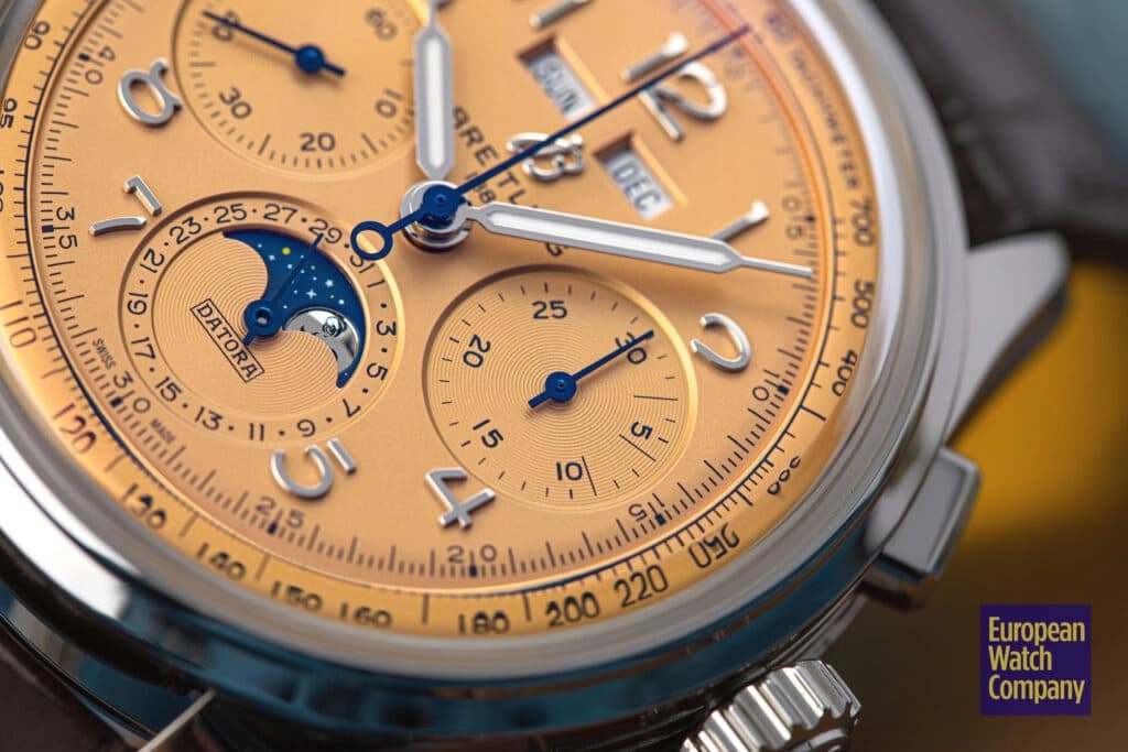 If vintage-inspired aesthetics aren’t a priority and you are looking for a salmon dialed timepiece, there are several modern releases to consider. First, Patek Philippe’s 5172 is a remarkably similar option, albeit without the triple calendar functions of the B25. The piece includes syringe hands, sunken sub registers and Arabic numerals just like the B25, but certainly features a better finished movement and more refined case profile. The lugs are stepped, the movement is manually wound, and the case is a much slimmer 11.45mm. If you are searching for a higher end chronograph to scratch a similar itch for salmon dial and vintage inspiration, this is where you would look.