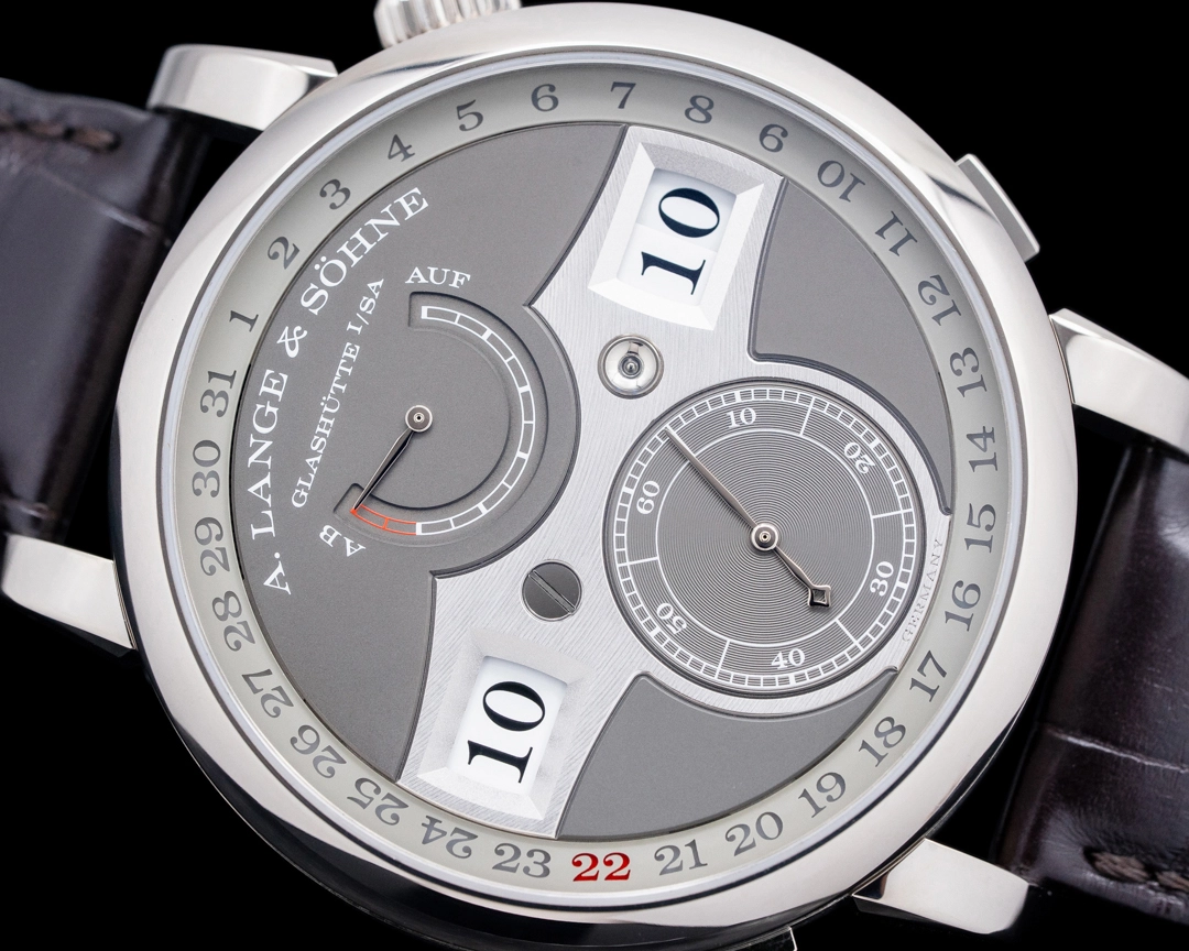 The Zeitwerk already broke one rule by displaying time digitally through mechanical means. Adding a date could have been disastrous. Instead, Lange pushed the date outward to the periphery of the dial. A subtle ring, punctuated in red, marks the date beneath the sapphire. It’s visible without being dominant, present without being invasive.