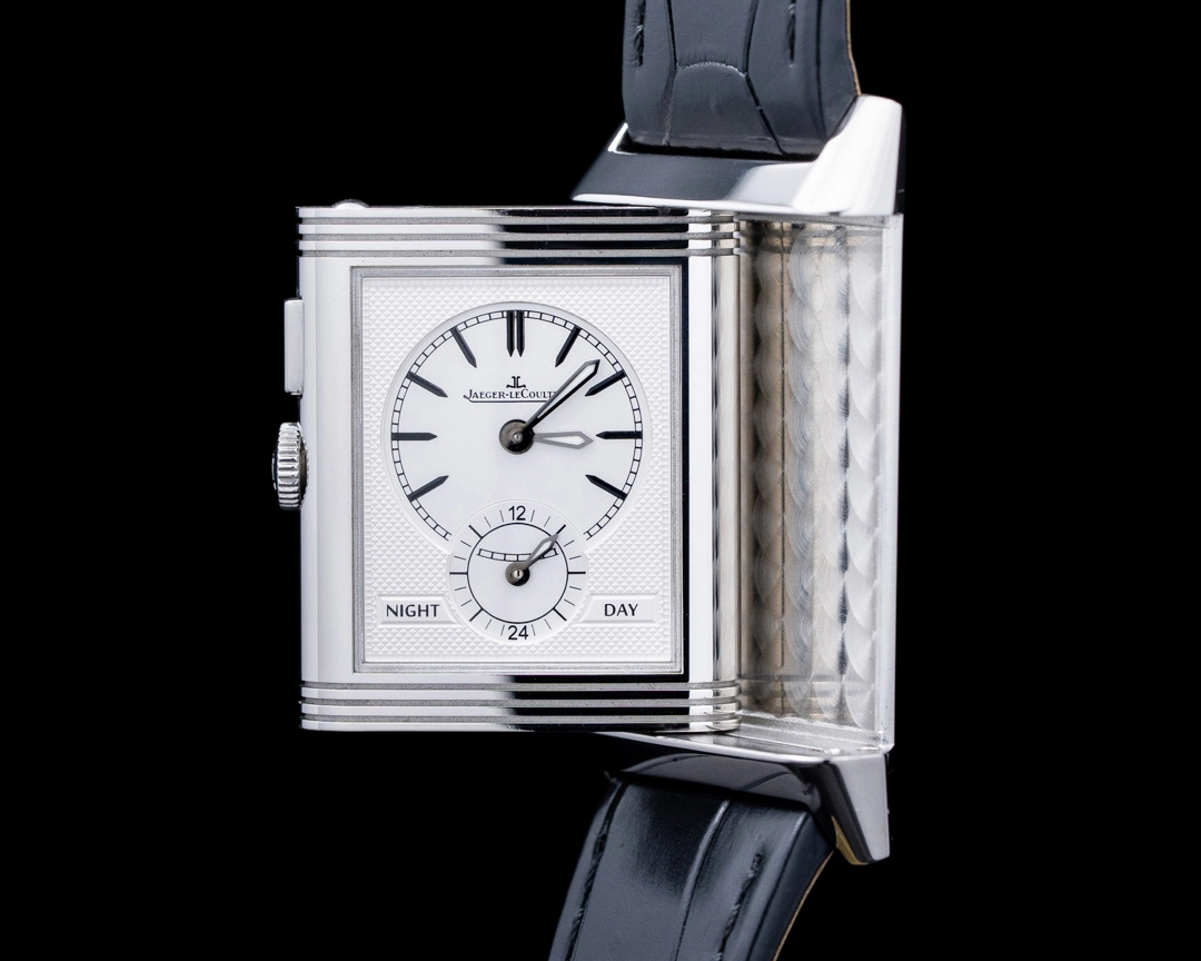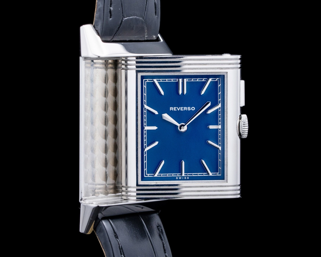 Symmetry can be intoxicating. On the main dial, the time-only display allows the lacquered blue dial and classic Reverso case to do all the talking, while the second time zone displayed on the second dial on the reverse is interrupted only by a perfectly symmetrical 24-hour day/night indicator. All the information the wearer needs is available with the flip of the swiveling mid-case. The absence of a date isn’t a compromise; it’s intentional.