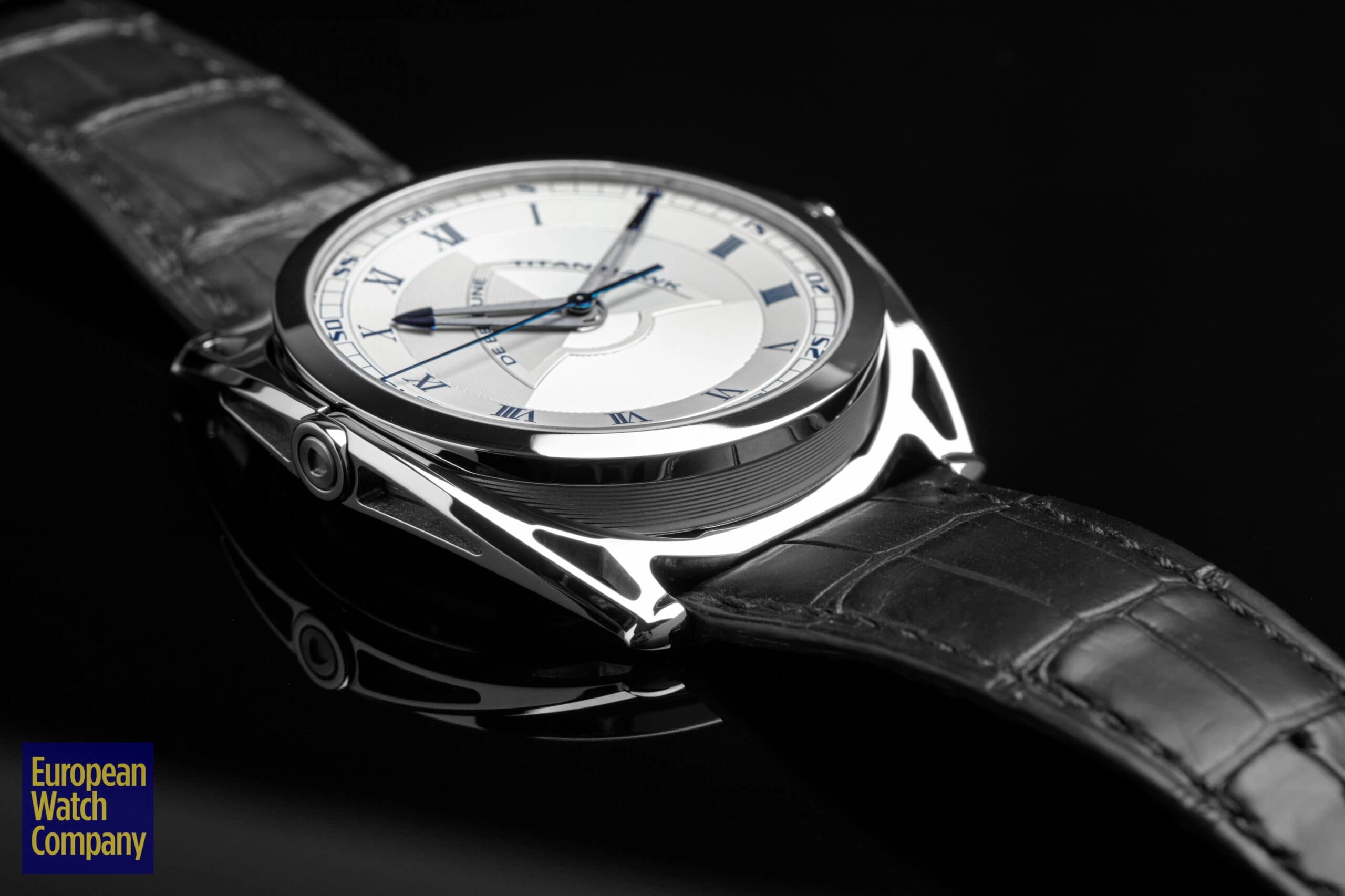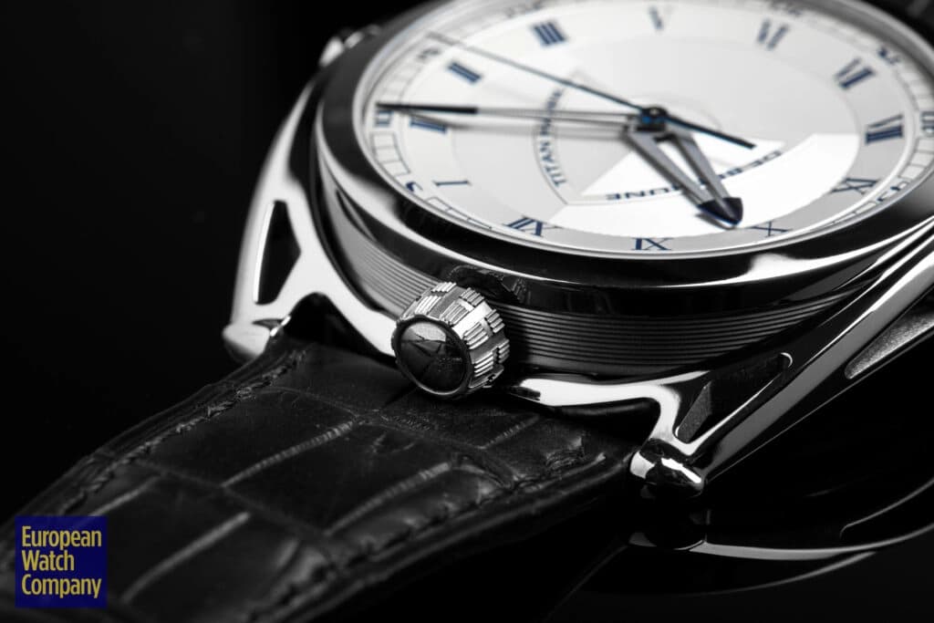 Let’s start here with those changes on the dial. For the V2, we lost the date indicator from the V1, but the memory of it is there in the central design on its guilloche dial. Here is that modified Starfleet insignia again. It’s bold, due to its size, but also subtle. In contrast to other references where this “logo” appears in the form of movement bridgework, the raised application on the dial is prominent, but still subtle on account of the monochromatic finish. You can’t help but see it, but it’s not jumping out at you.