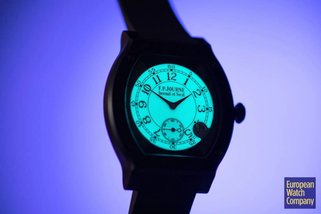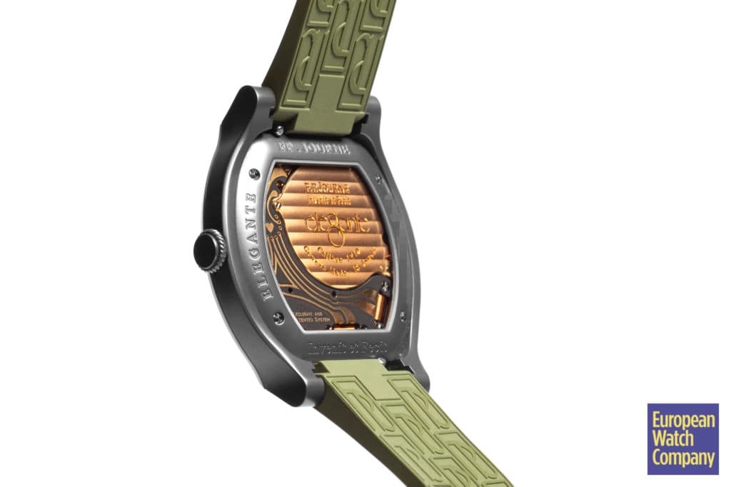Introduced in 2014 as a sporty ladies watch, the Élégante took the Vagabond tortue case design and shrunk it down to 40x35mm and just 7.35mm thick. The Élégante's popularity subsequently inspired a men's version measuring at a slightly larger 48x40mm and 7.95mm thick. This watch here is the men's version but with an exceptionally robust case finish, the Élégante 48mm "Titalyt." The Élégante Titalyt is encased in grade five titanium that has undergone an exclusive Titalyt treatment. This means the metal has been subjected to electro-plasma oxidation, which increases the materials hardness as well as its resistance to corrosion. The Titalyt model can be distinguished from the standard titanium Élégante by its darker grey coloring. This treatment not only gives the watch a new look but further emphasizes the timepieces role as a sports watch. Add to that its fully luminous dial, and you've got a sports watch that stands out from its cohort quite nicely. When you factor in the ergonomic design, elegant style, water-resistance of 30m/100ft, and the robustness of the movement and case, the Élégante is among the most versatile watches Journe makes and strikes a great balance between sporty and chic.