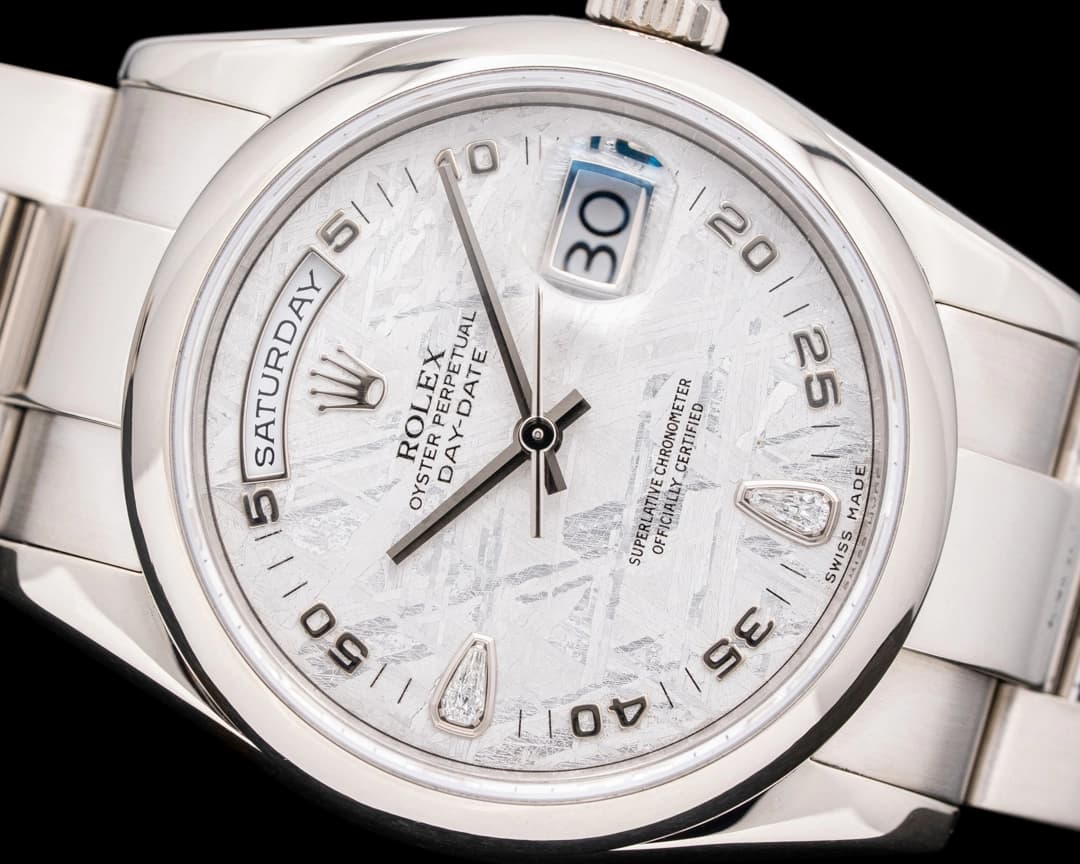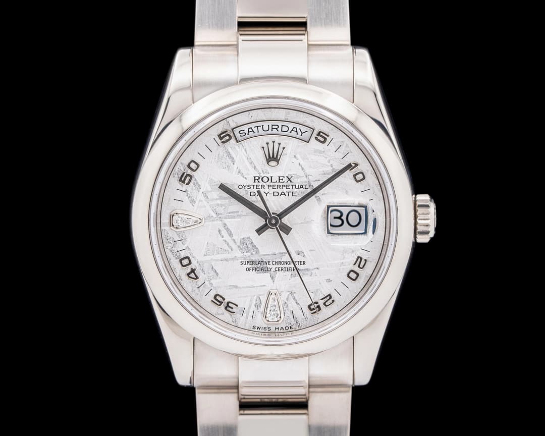 If you want your date to feel presidential, this might be the model for you. This Rolex Day-Date in 18K white gold with a President bracelet and a meteorite dial makes a subtle yet powerful statement with Arabic numerals and diamond accents. It features not only a date display, but also the day of the week, and it’s powered by Rolex’s automatic caliber 3155, which provides solid reliability, always a plus on date night.