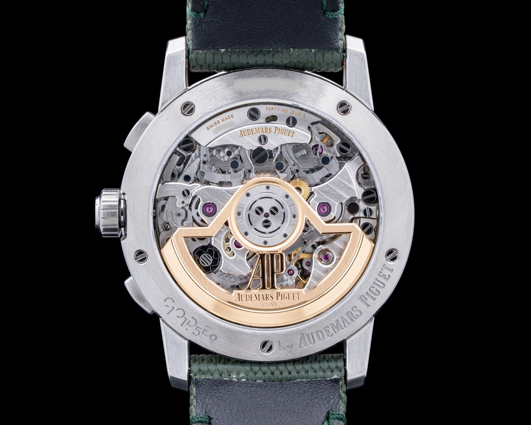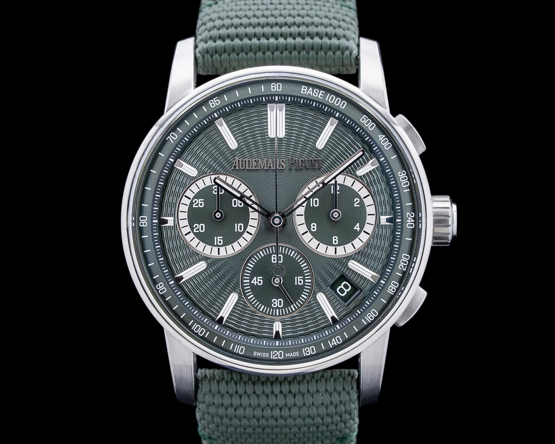 The Audemars Piguet Code 11.59 has evolved since its launch in 2019 to span a range of options, with everything from a time-only option to complicated versions. (Read an in-depth guide to the Code 11.59 here.) This 26393ST Code 11.59 chronograph model, with a deep green textured dial and tonal green inner bezel, is a demonstration of this line at its best. It’s powered by the brand’s in-house automatic Calibre 4401, visible through the exhibition caseback, with both date and small seconds displays and a flyback chronograph. It also features the hallmarks of the Code 11.59 design, with its distinctive octagonal midcase and compound curved crystal, which is double glareproofed for even more crystal-clear legibility when reading the dial. Some say it’s not easy being green, but this sporty yet contemporary timepiece in its dark green hue will make it feel effortless.
