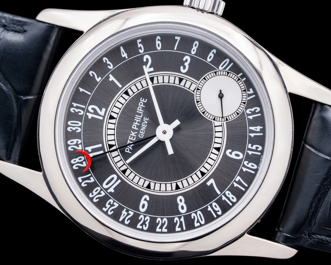 The Calatrava is one of the models where Patek Philippe can show off its mastery of unique displays, and this 6000G Calatrava in 18K white gold is an excellent example. With an anthracite gray sunray dial and date display that is on the outer track, highlighted by a hand tipped with a crescent in bold red, the time and date are incredibly easy to discern with a quick glance. In a very wearable 37mm case size, it’s powered by the brand’s in-house automatic caliber 240, and the movement and its gold micro-rotor are visible through the exhibition caseback. The combination of elegance, functionality, and legibility make this piece an all-around winner.