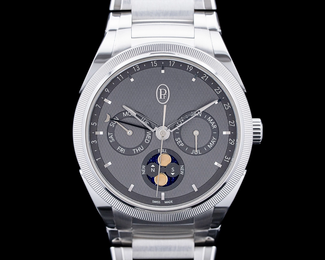 Parmigiani Fleurier’s Tonda line is beloved by collectors, from its time-only form up to and including complicated pieces. This Tonda PF Gregorian Annual Calendar, ref. PFC907-1020001-100182, is a stunning example of many of the things collectors love about the brand, such as the grain d’Orge hand-guilloched gray dial, the thoughtful proportions, and the expert execution of a functional complication. In a 42mm case that measures only 11.1mm in thickness, it will slide effortlessly under a cuff, and the stainless steel case and bracelet with knurled platinum bezel make it comfortable and easy to wear with any attire. It’s powered by Parmigiani’s in-house automatic PF339 movement, which has an annual calendar and retrograde date function and a power reserve of 50 hours. The blue aventurine on the moonphase display adds the perfect shimmering touch to an already beautiful dial.