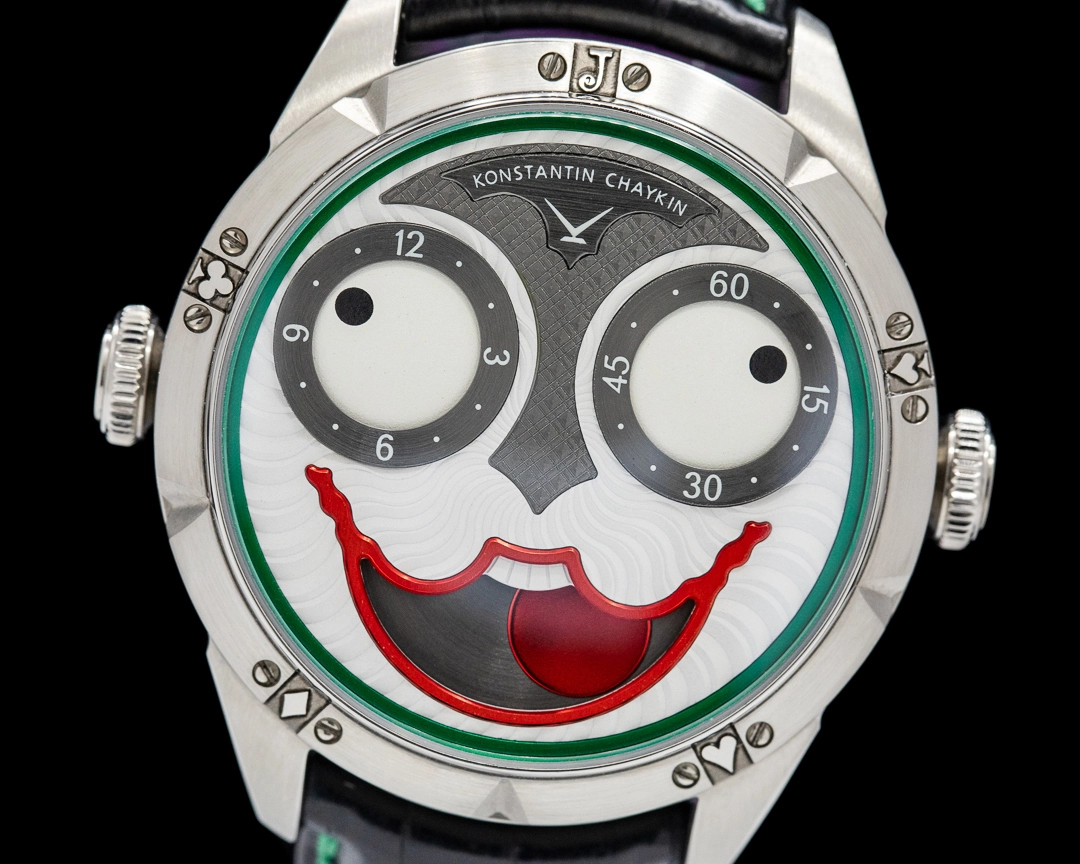 The most whimsical time display of the week goes to this Konstantin Chaykin Joker Limited Edition. Chaykin’s distinctive Joker design is unique in watchmaking, with the disc-based time displays showing the hours through the left eye of the Joker’s face and the minutes on the right eye, and a clever display of the moonphase as the tongue in its grinning mouth. This particular piece, with a titanium case, is part of a limited edition of 250 pieces, and features a guilloche wave pattern on the white dial as well as a bezel adorned with playing card symbols. It’s impossible not to smile back at this watch when glancing at your wrist.
