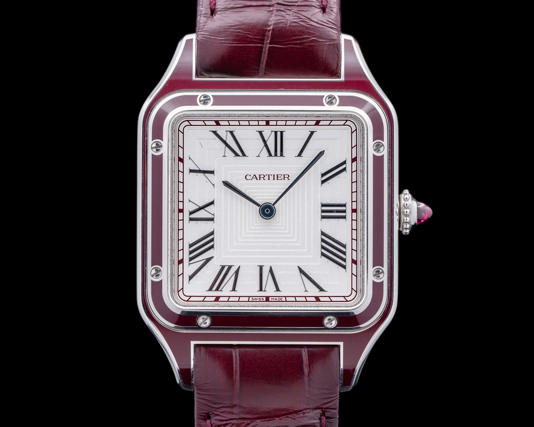 Bold in both design and color, this limited edition Cartier Santos-Dumont has many things to like: a platinum case framed by a burgundy enamel bezel, a silver dial with Roman numerals, the signature cabochon on the crown, and the signature of Alberto Santos-Dumont on the caseback. Louis Cartier originally designed the brand’s first wristwatch for Santos-Dumont, a legend in aeronautics, in 1904, and the collection continues to be a popular one to this day. Limited to only 150 pieces, this 2022 model is in like new condition and comes with box and papers.