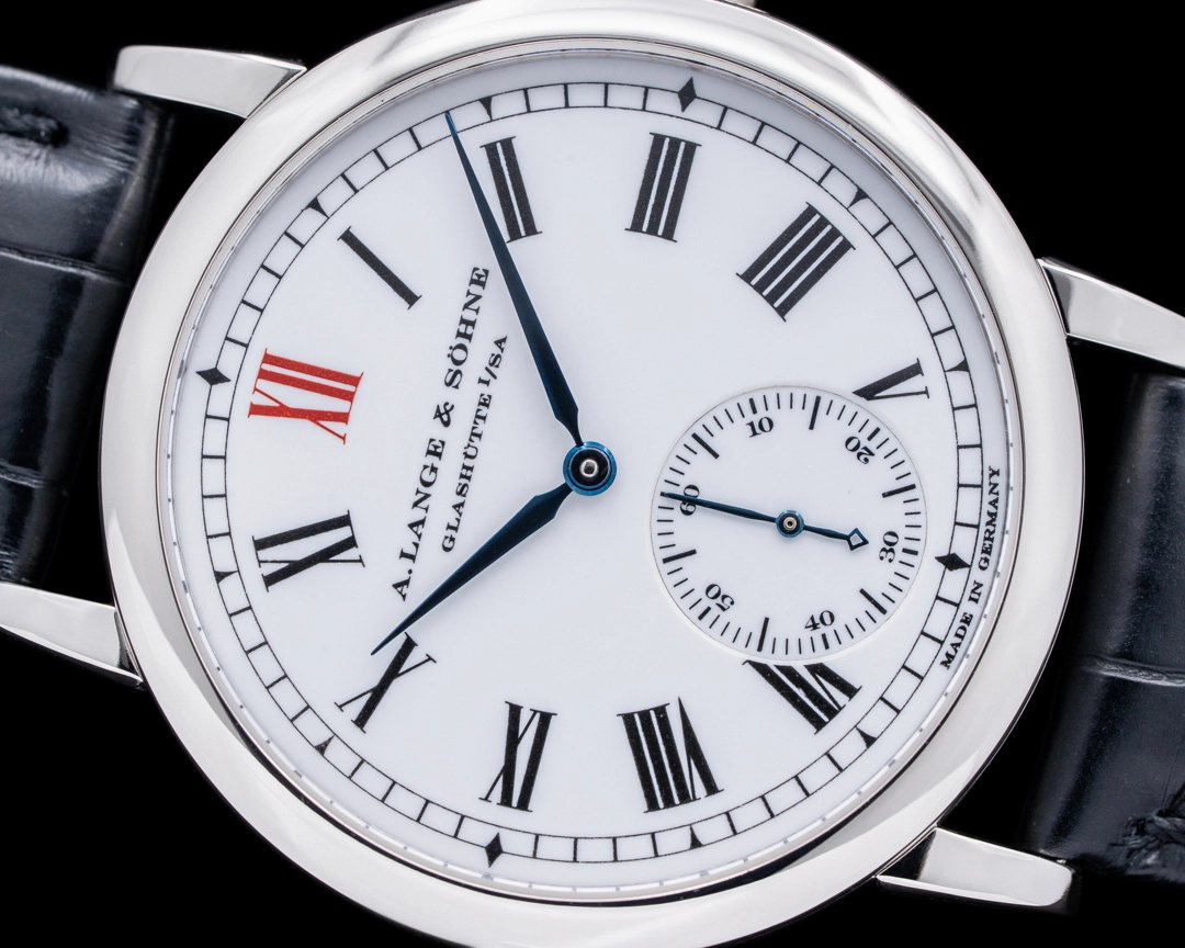 Continuing with another piece from a legendary Glashütte-based brand, this A. Lange & Söhne Jubiläums Anniversary Langematik has an incredibly striking white enamel dial contrasted with deep black painted Roman numerals, with the exception of the red 12 (XII). It has an automatic in-house caliber with the proprietary Sax-o-mat system that resets the seconds hand to the zero position when the crown is pulled out to set the watch, allowing for extreme precision in setting the time. It features a display back so that the wearer can admire the movement construction and incredible finishing for which A. Lange & Söhne is renowned.