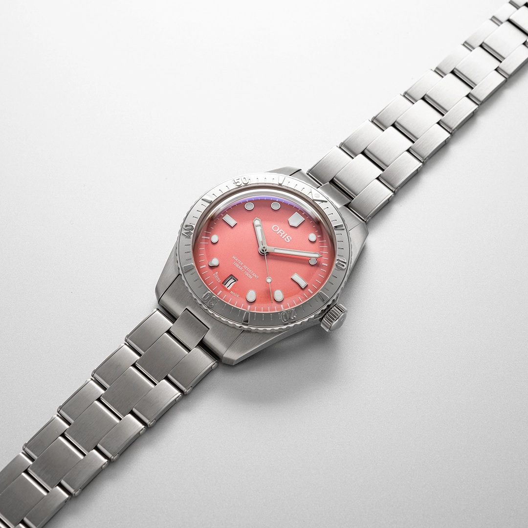 The aptly-named series brings a trio of pastel colors to the vaunted Divers Sixty-Five series, an ideal pairing especially with color-matched Perlon straps. None are overwhelming in their tones. The blue is the sharpest of the bunch, the green has blue and white undertones in its hue, and the pink works especially well on a steel bracelet. If you plan to put the Divers Sixty-Five through its 100-meter resistance, it helps to have a watch that feels at home among the coral reefs. “We have seen good results with pastel dials over the past few years,” says V.J. Geronimo, CEO of Oris Americas. “They can be polarizing at times…..you either love them or you don’t.”