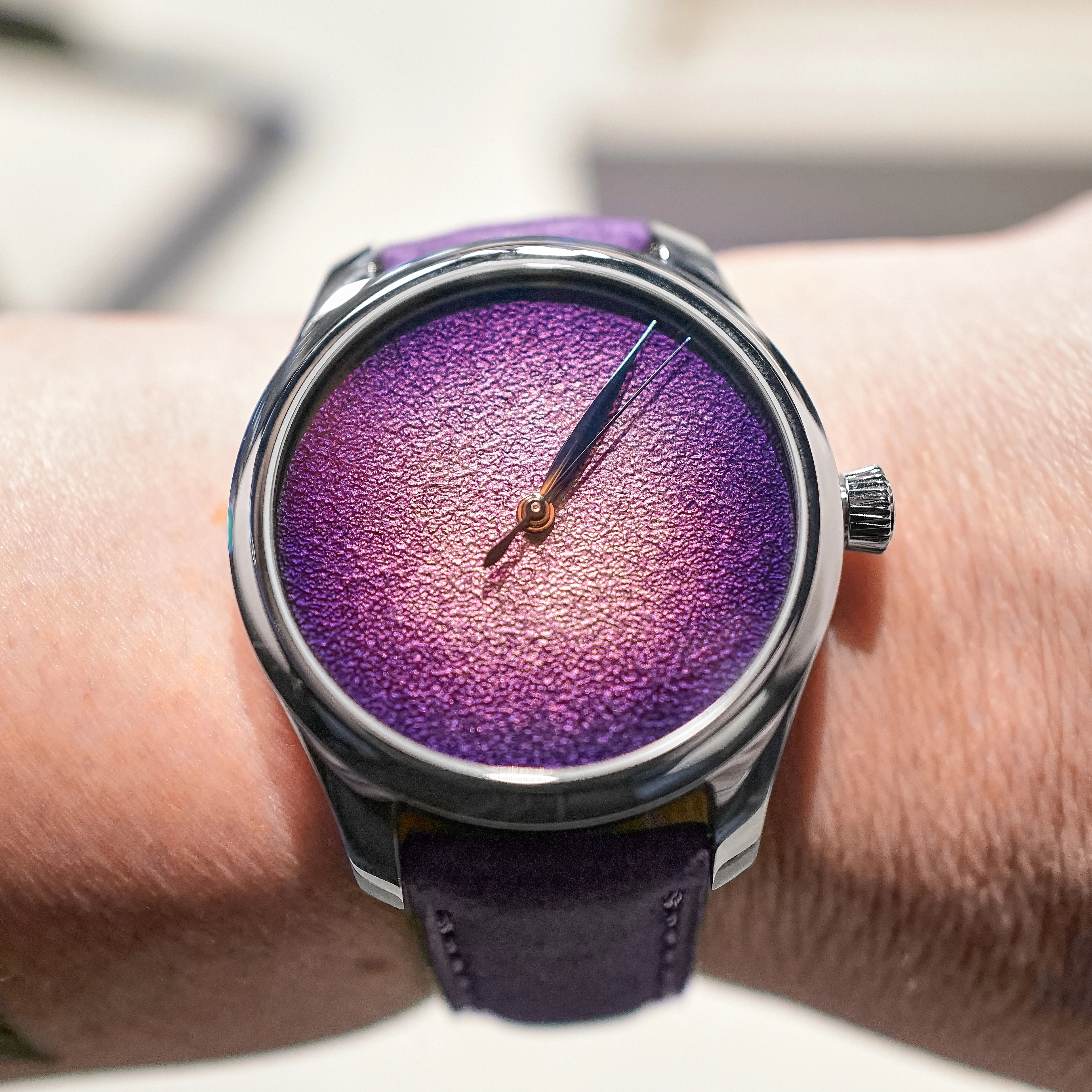 Avant-garde, wily, often tongue-in-cheek and never predictable, H. Moser & Cie. used its minimalist Endeavour line to showcase its skills in fumé dialwork. The Centre Seconds Concept Purple Enamel is the standout here, set in a deep Purple Haze with the brand’s distinct lack of a logo on the dial to get in the way of that beautiful, textured, three-dimensional and gradient-filled Grand Feu enameling.