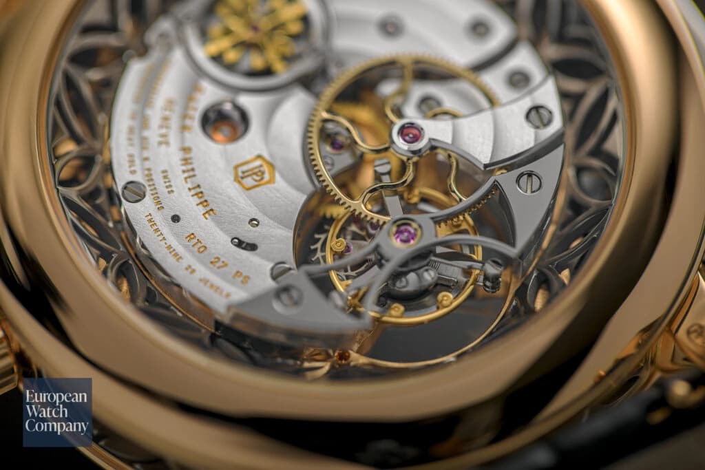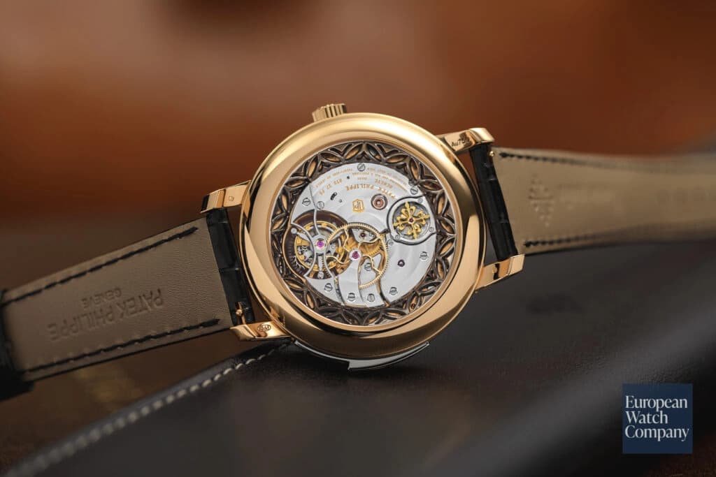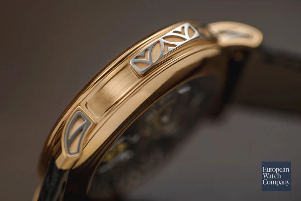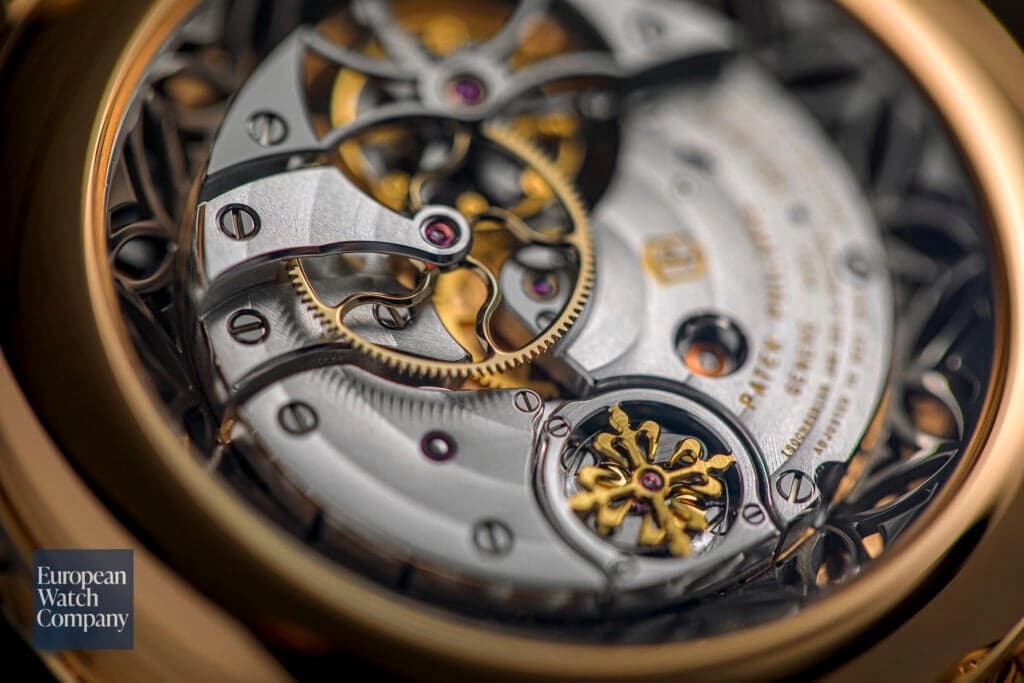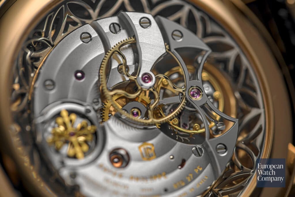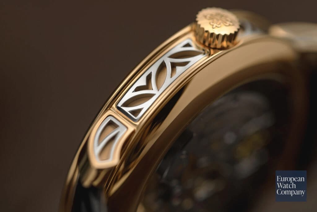 Before getting into the technical details of why Patek did this, take a look at the intricate bit of what I’d almost call latticework that surrounds the otherwise compact caliber on its backside. One could easily write this off as purely decorative — especially seeing that the leaf pattern carries onto the case flank and lugs — but that doesn’t tell the full story. The reverberations of the repeater gongs echo through the cavernous chambers of the rose gold case, but also through this additional bit of hardware. It’s form meeting function, in the most elegant of ways.