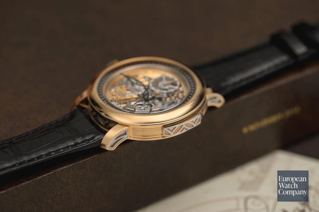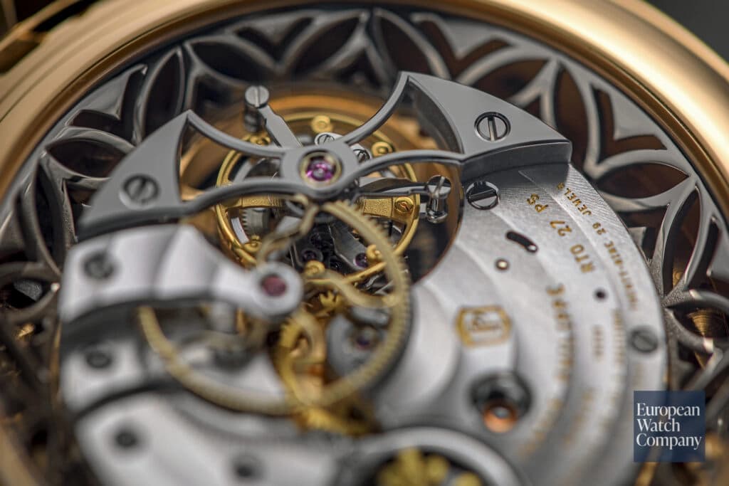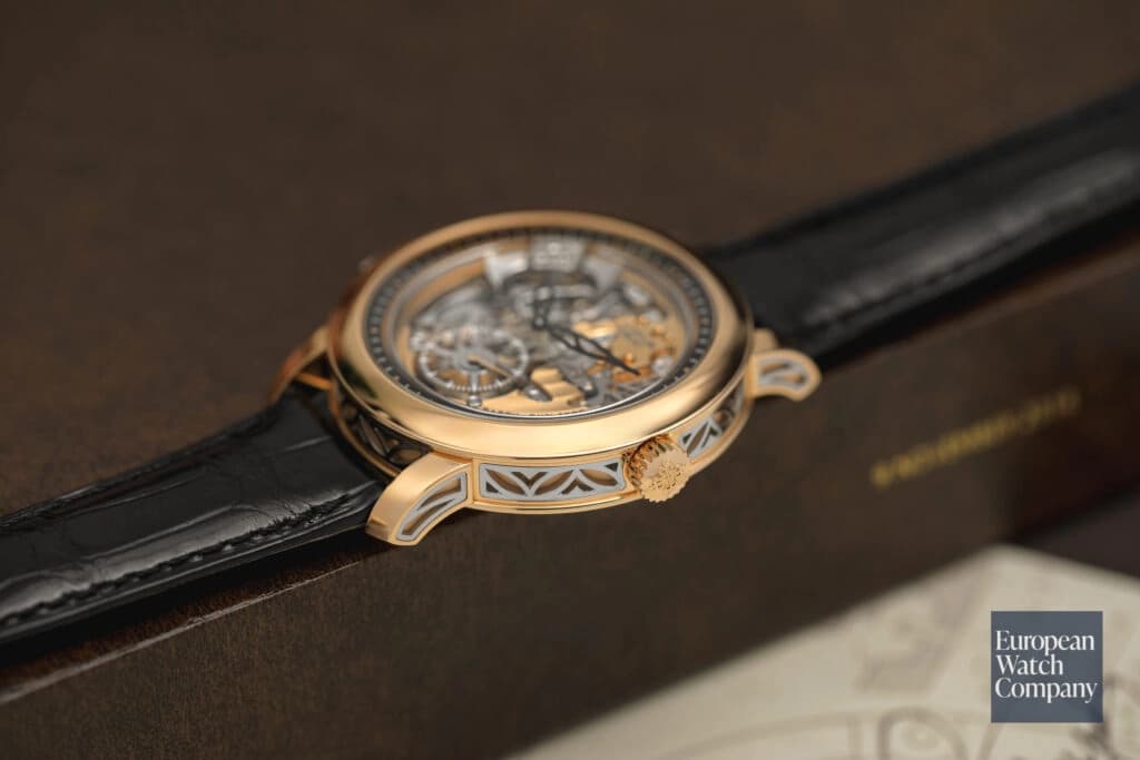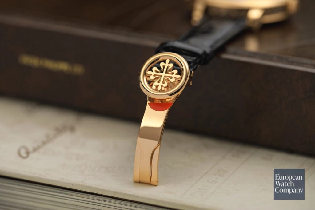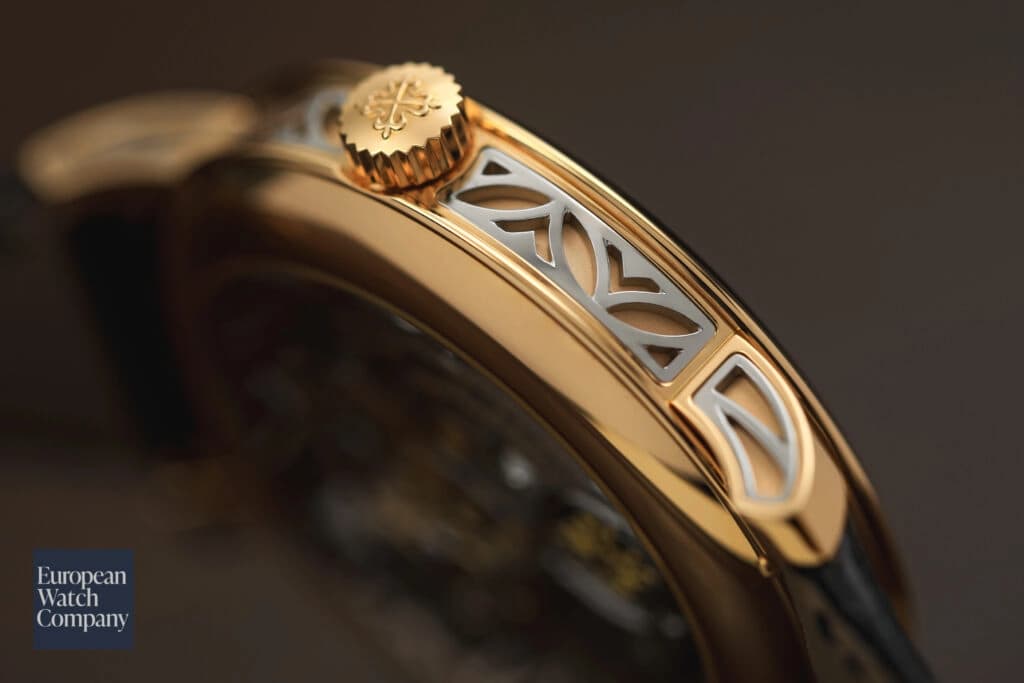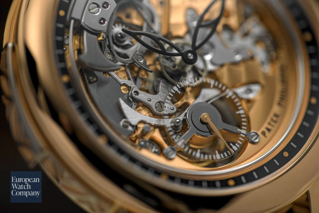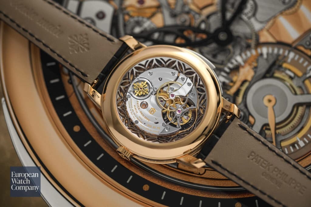 Before getting into the technical details of why Patek did this, take a look at the intricate bit of what I’d almost call latticework that surrounds the otherwise compact caliber on its backside. One could easily write this off as purely decorative — especially seeing that the leaf pattern carries onto the case flank and lugs — but that doesn’t tell the full story. The reverberations of the repeater gongs echo through the cavernous chambers of the rose gold case, but also through this additional bit of hardware. It’s form meeting function, in the most elegant of ways.