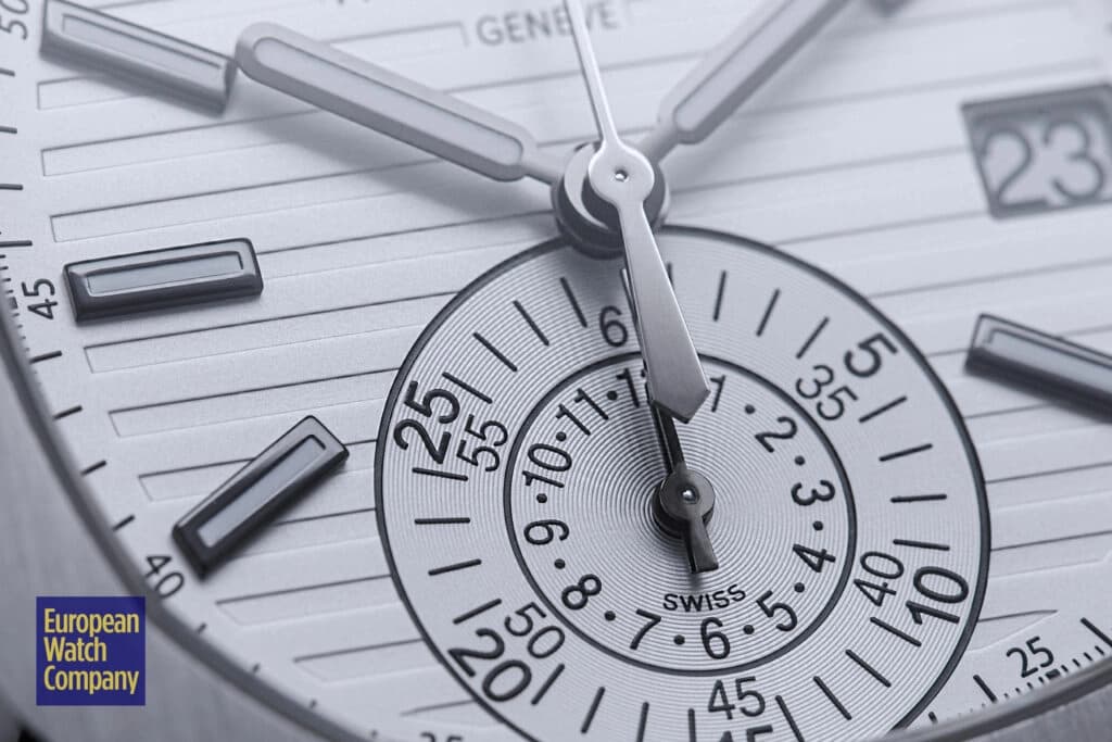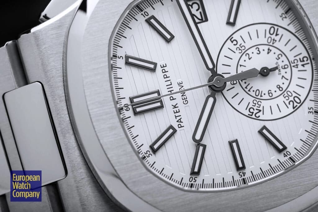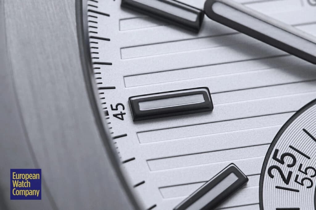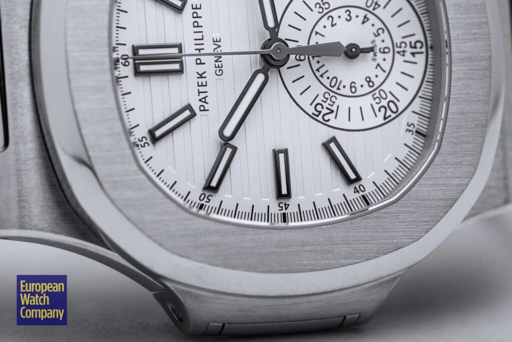 The white dial is for sure the stand-out design detail; it has a hint of silver in it that sort of soaks up the surrounding tones, and it goes very nicely with the color of the lustrous steel case. In fact, it doesn't just go well with the steel case, it's perfect, and it brings real harmony to the overall design. This is an integrated bracelet watch, so the whole theme is "oneness," but this model, with its monotone look, exemplifies that better than any other Nautilus. Even the integration of the chronograph pushers and subdials is done so seamlessly that they almost go unnoticed at first. The pushers have a rounded rectangular shape to them, and they fit nicely over the ears of the case. The subdial houses both hours and minutes for the chronograph, and it really simplifies things while still displaying the information easily.