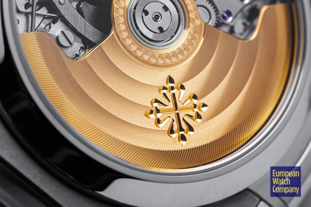 Powering this watch and visible through the display caseback is the Patek Philippe in-house caliber 28-520 C. This is a flyback chronograph movement, and it's the first automatic chronograph ever produced by Patek Philippe. The movement shares some architecture with the 5960 annual calendar movement, and because of that, the date is adjusted with a pusher, which I normally don't like, but I feel it adds to this watch's oddball charm. The movement is automatic winding with a straight-line lever escapement and includes Patek's proprietary Spiromax silicon balance spring and Gyromax balance ensuring optimal efficiency and resistance to magnetism. It's rhodium plated with Côtes de Geneve decoration, a 21k yellow gold rotor, and the Patek Philippe seal of quality.