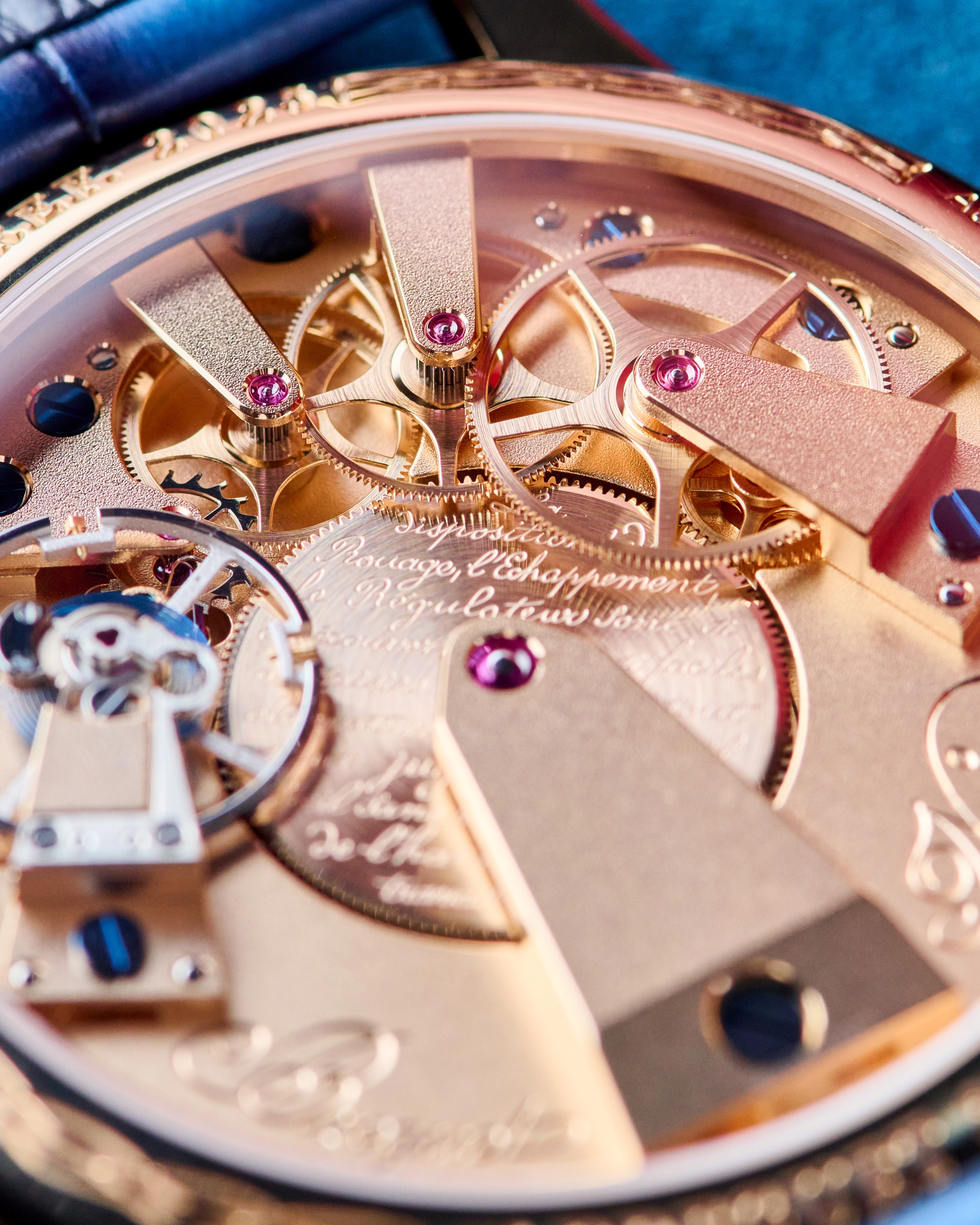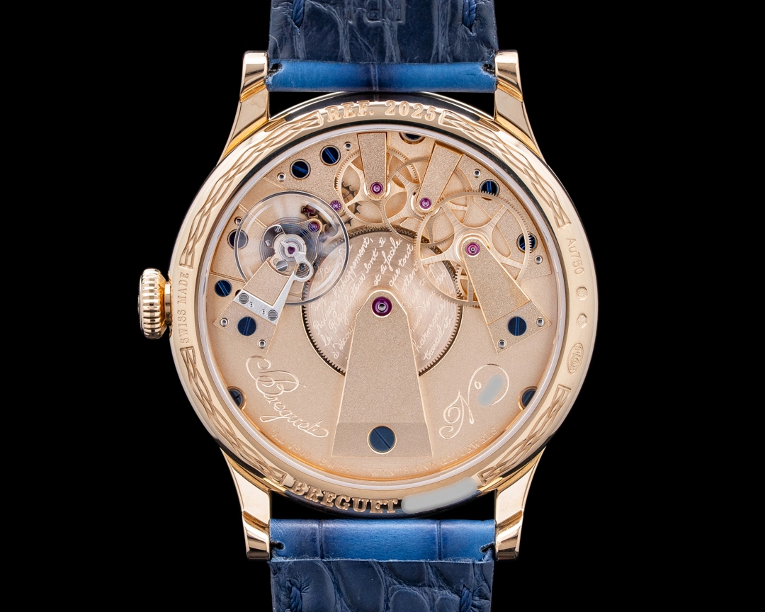 This piece doesn’t only stand out for its dial, however. The case, in the brand’s proprietary Breguet gold, is made from a unique blend of copper, gold, silver, and palladium, which forms a beautiful blonde rosy hue. The new caliber VS00 movement, visible through the caseback, is fashioned from gilded brass to match the tone of the case, and mimics the structural aesthetics and technology of Breguet's first souscription watches.