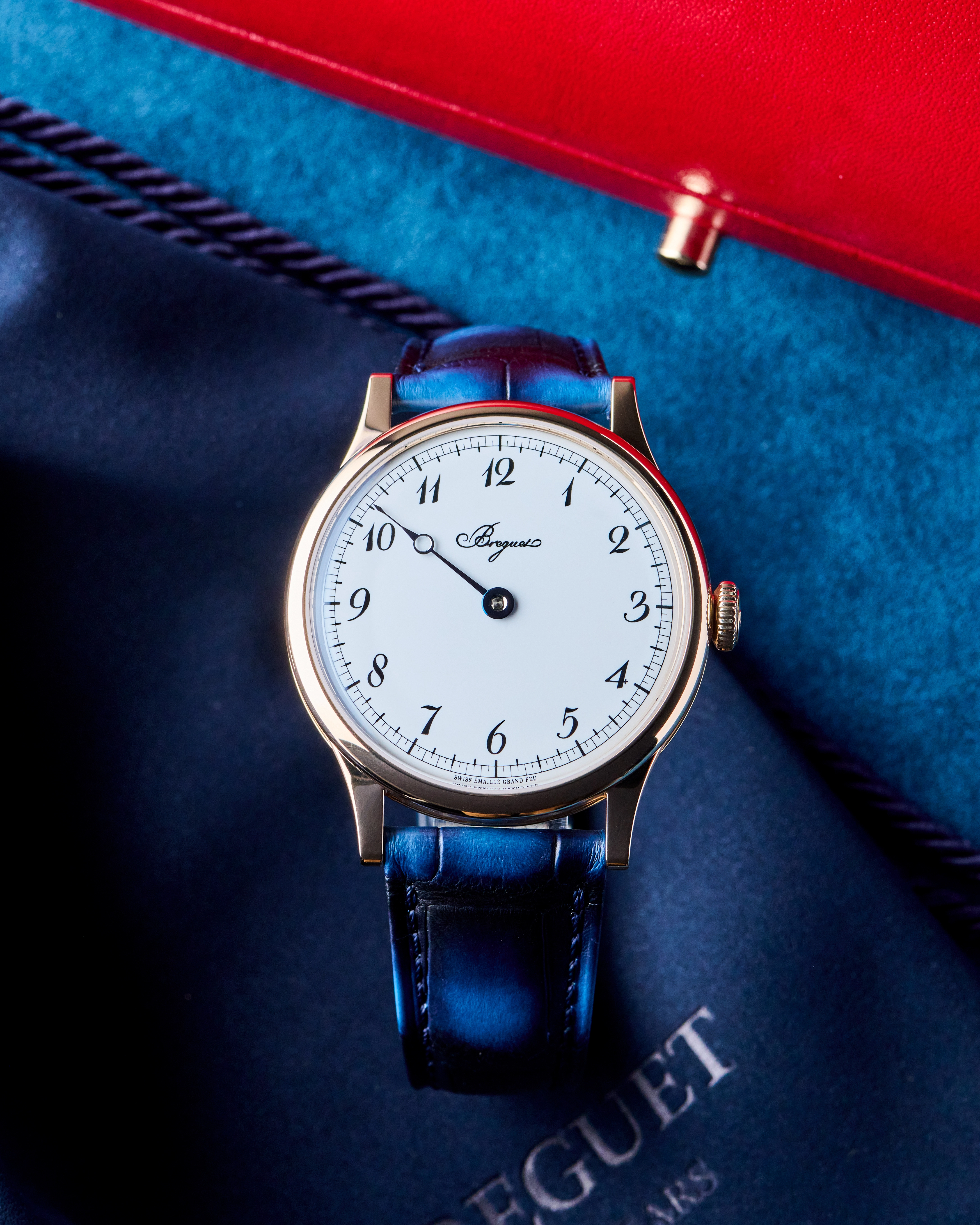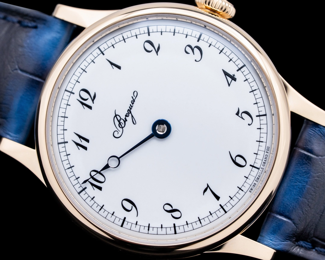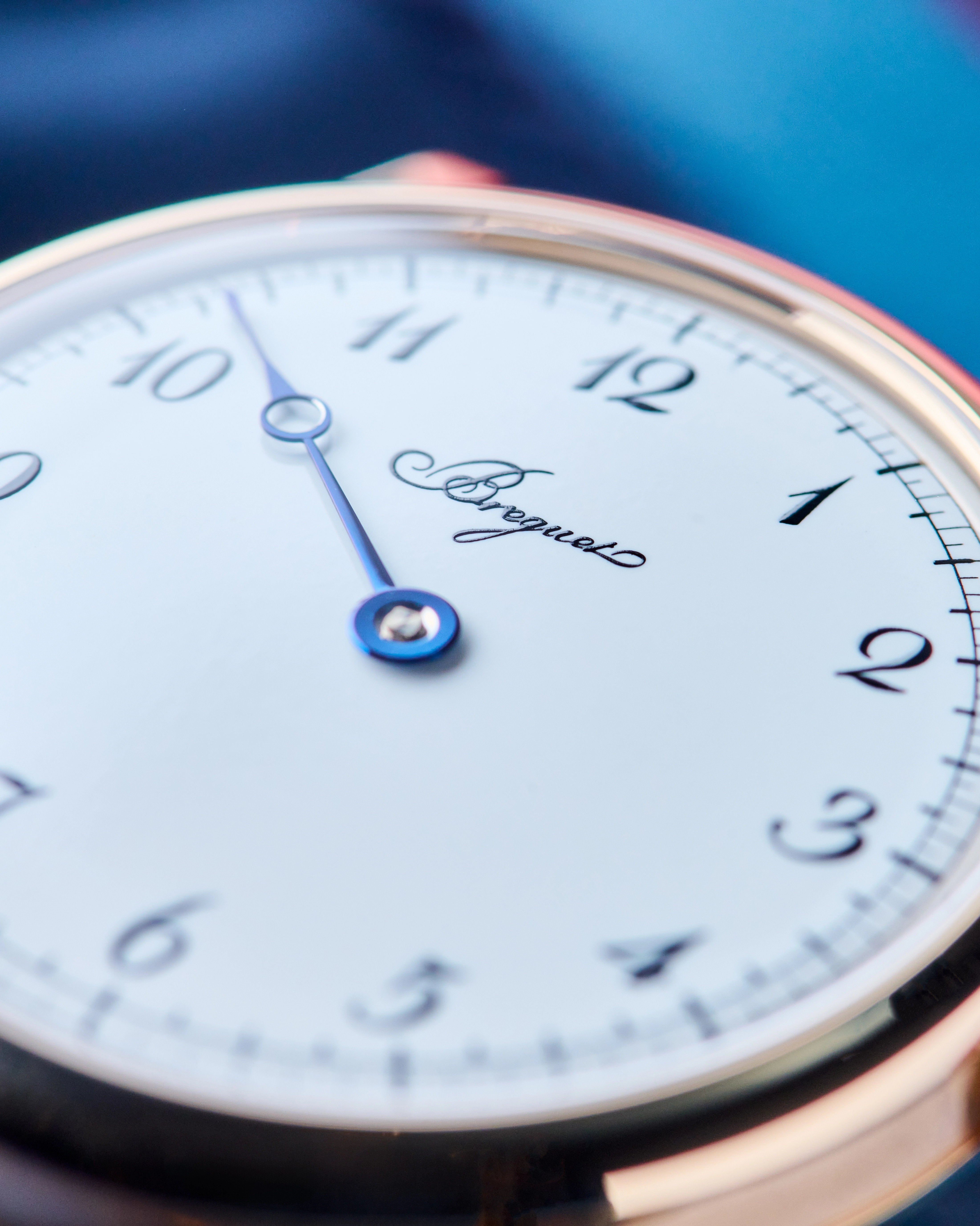The 2025 winner of the Grand Prix d’Aiguille d’Or, the Classique Souscription couples incredible design with technical sophistication to form one of the coolest watches in recent Breguet history. Based on Breguet’s famous souscription one-handed pocket watches, the Classique Souscription pays tribute to historical pieces in its dial print, layout, handset format, and vintage feel. Specifically, the Classique Souscription tells the time with just one flame-blued steel hand that is hand shaped and finished. This beautiful blue coloring contrasts with the creamy white enamel dial, harkening back to the brand’s early models.