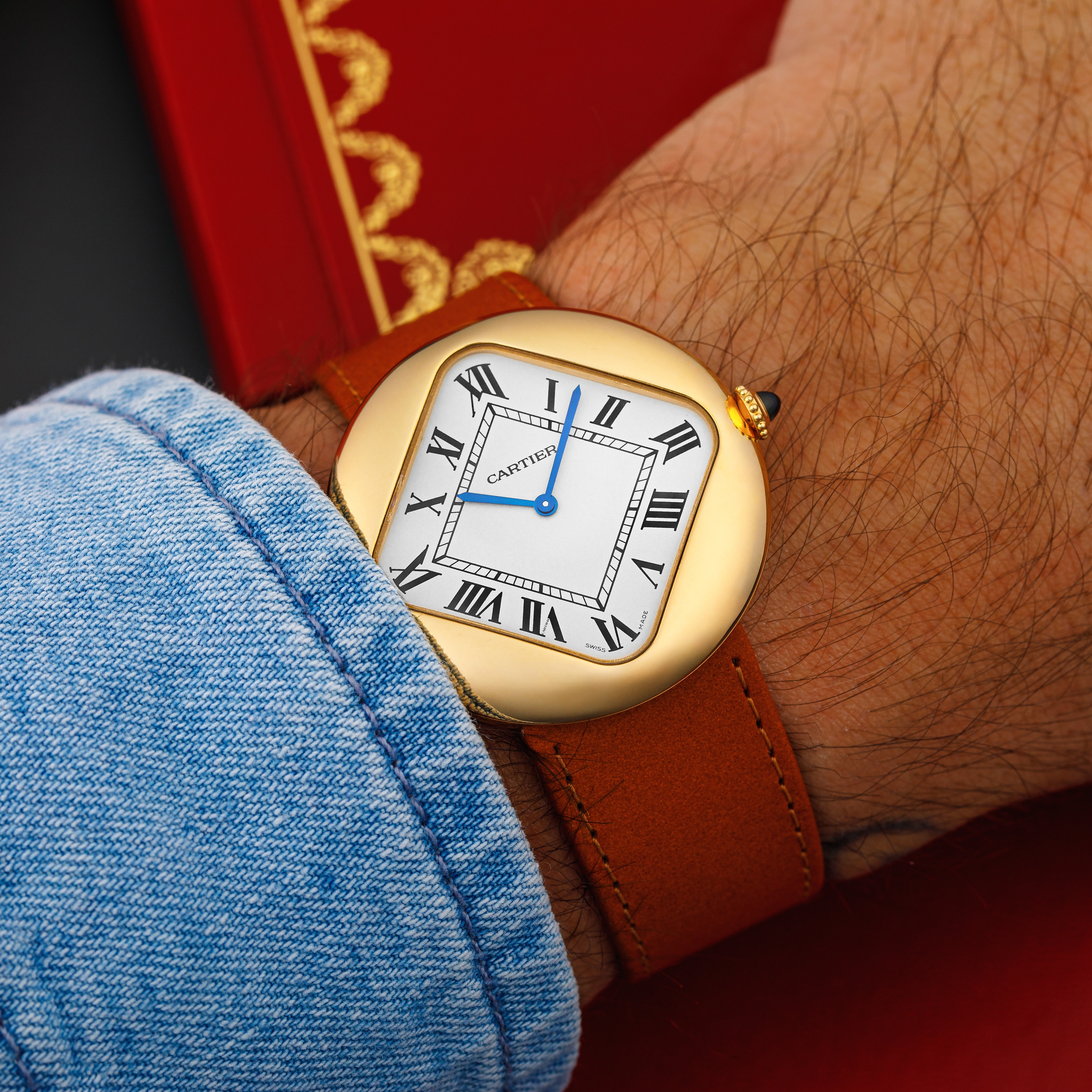 What makes the Pebble so important? In addition to its rarity, most notably, the Pebble has one of the most unique designs on the market. Its smooth, domed case frames a rotated, diamond-shaped dial set within the case’s soft curves. The juxtaposition of beautiful curves and strong lines perfectly encapsulates the aesthetics of the Swinging Sixties, and is just another manifestation of Cartier’s mastery of watch design. The dial flaunts an eggshell finish with blued steel hands and classic black Roman numerals, topped off with a railroad minute track. From the case to the dial, this piece has a decidedly vintage feel that lets this 2022 timepiece feel and look like a watch you’ve been wearing for 50 years or more.