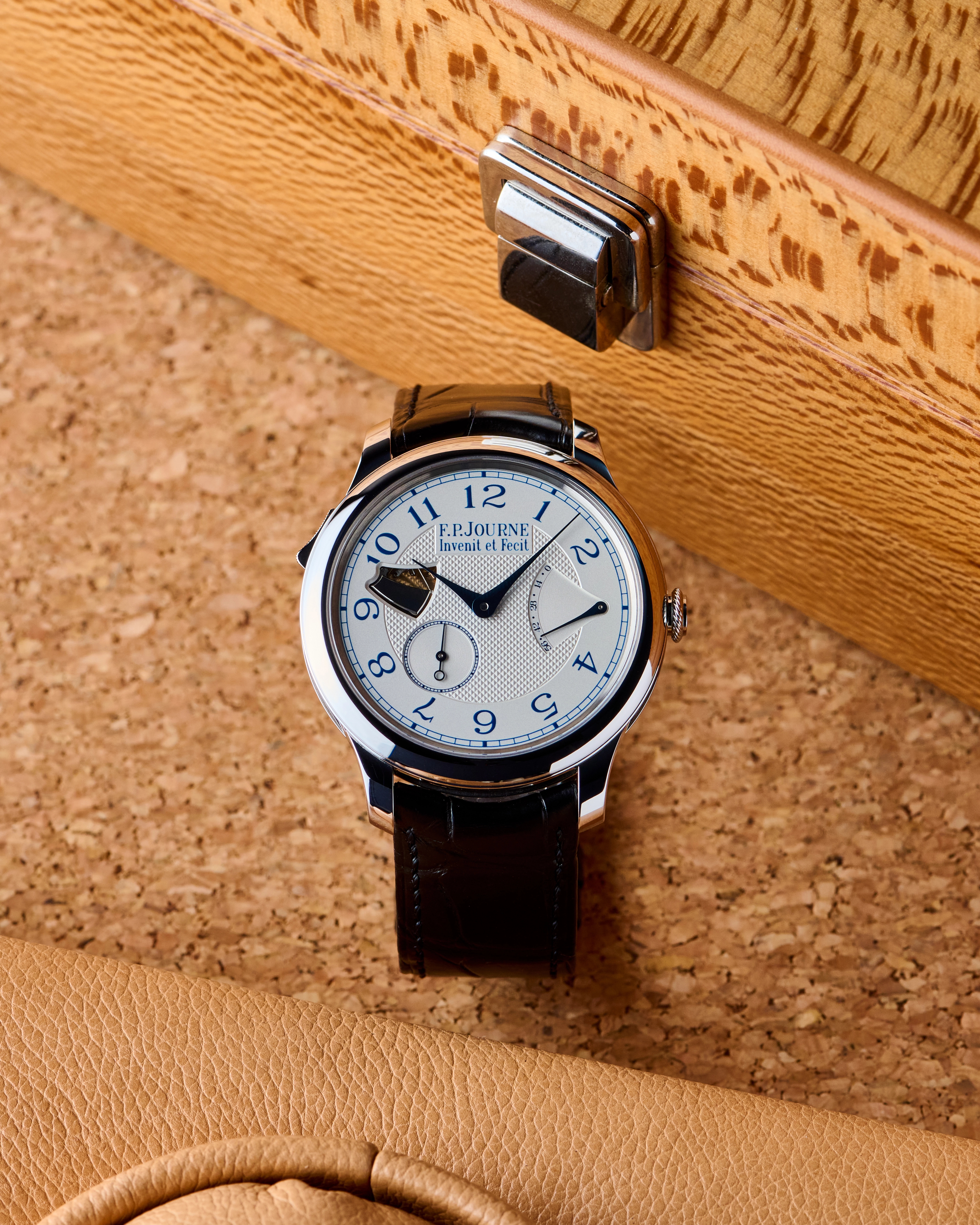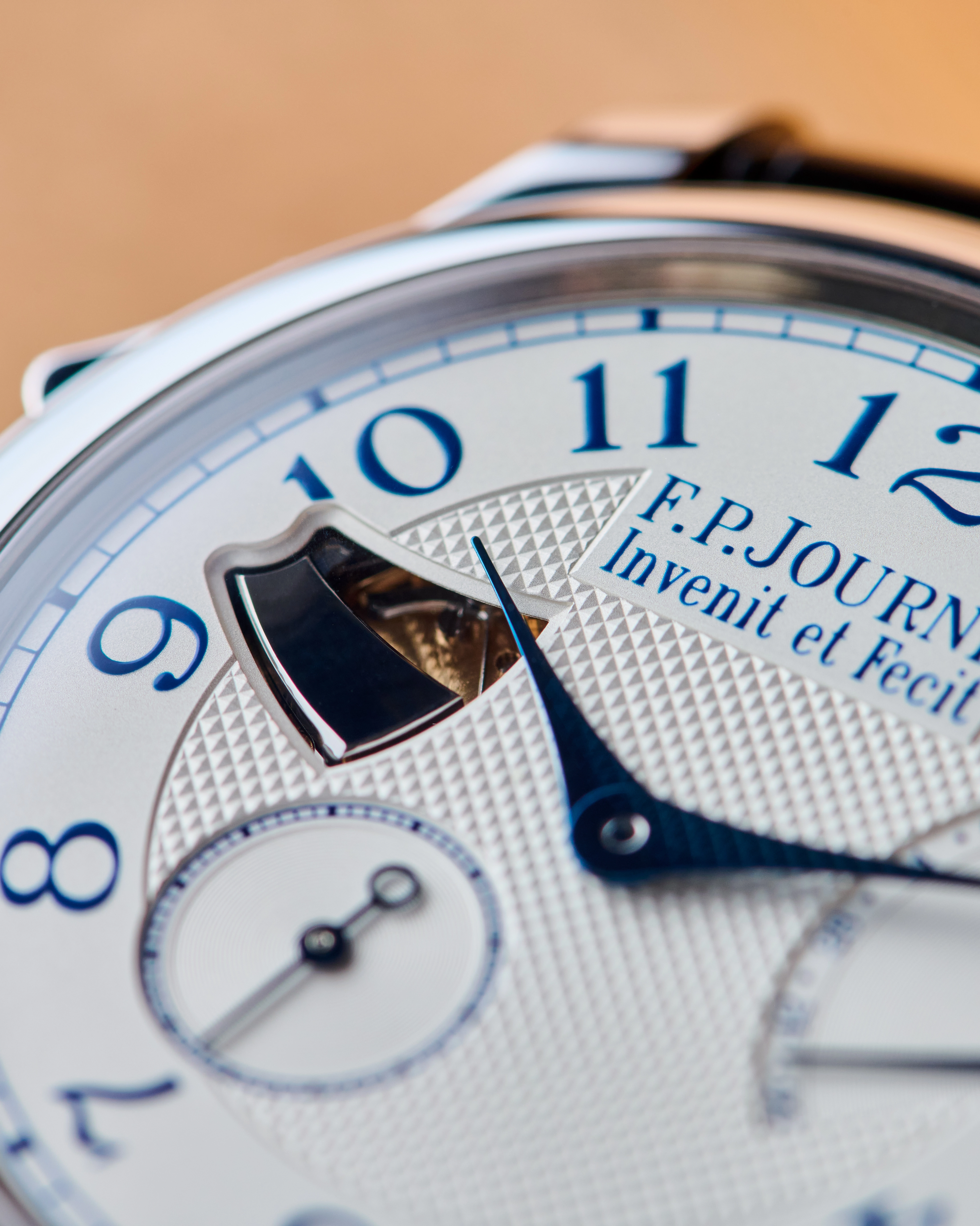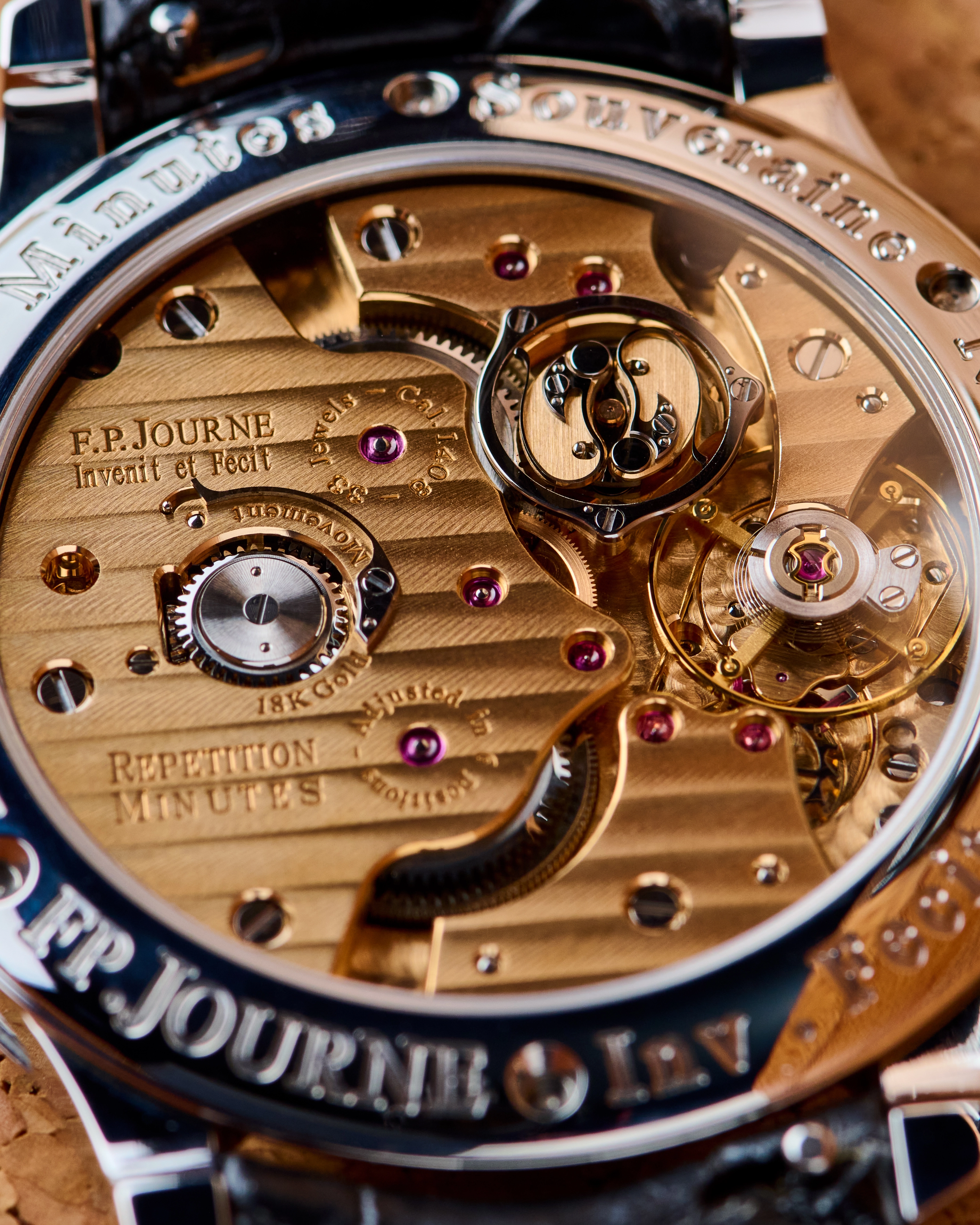 Rather than replicating traditional minute repeaters, F.P. Journe completely redesigned the traditional minute repeater with wearability, sound clarity, and robustness as his major priorities. First, rather than utilizing a traditional gong, Journe opted for a flat gong system positioned just below the dial surface to create a cleaner and louder sound. Second, Journe rebuilt the striking racks and selection mechanisms of traditional repeaters to slim the watch down even further, achieving a thickness of only 8.5mm. Furthermore, these enhancements were executed while also making the minute repeater less delicate and fragile in use. In a sense, the goal was to democratize the minute repeater as an everyday wearable complication from Journe.