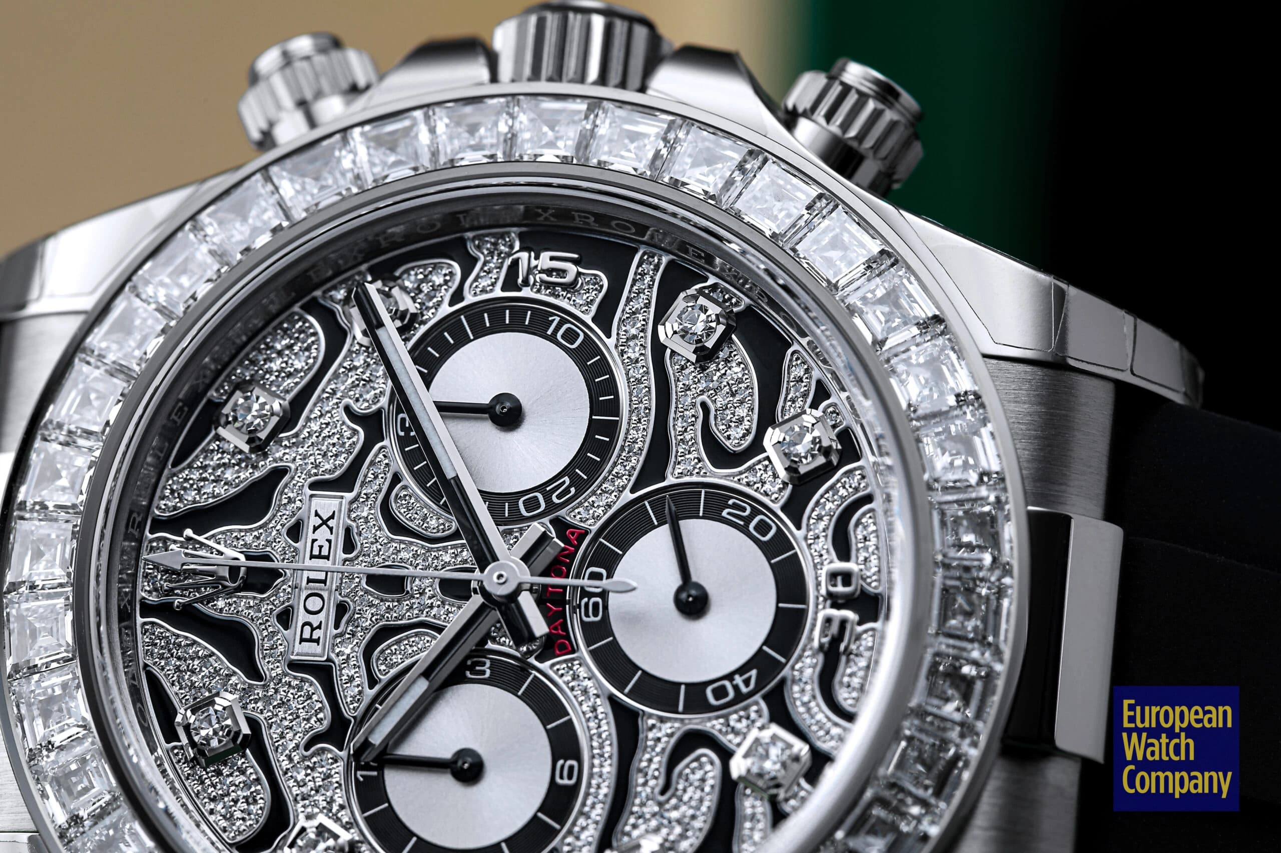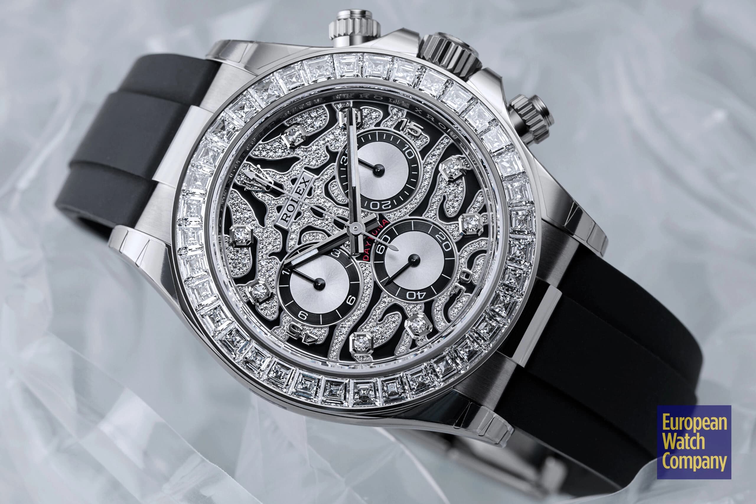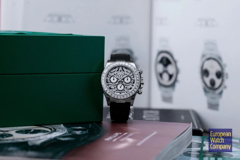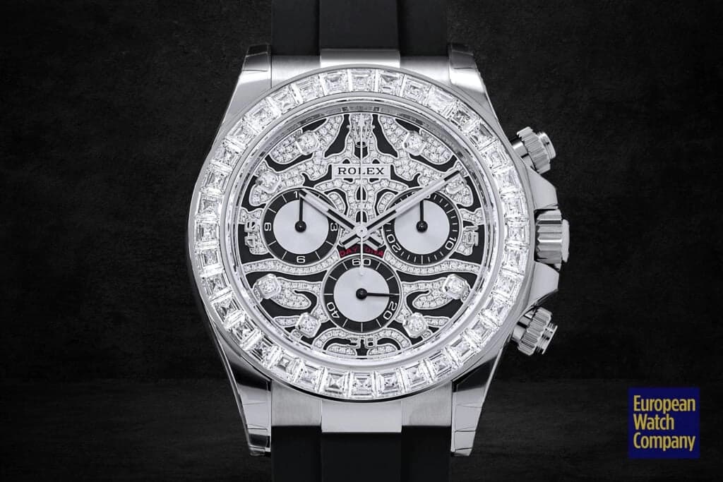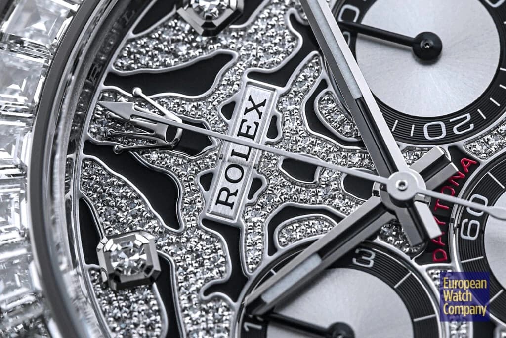 Conversely, if you want a mega-exclusive, gem-encrusted Daytona that isn’t inspired by a large jungle cat, then the Rolex Daytona 116595RBOW “Rainbow” may be the perfect timepiece for you. Arguably the single most famous off-catalog Rolex model, the ref. 116595RBOW makes an even bigger statement on the wrist due to its rainbow gradient sapphire bezel, diamond-set lugs, and matching rainbow colored baguette hour markers.