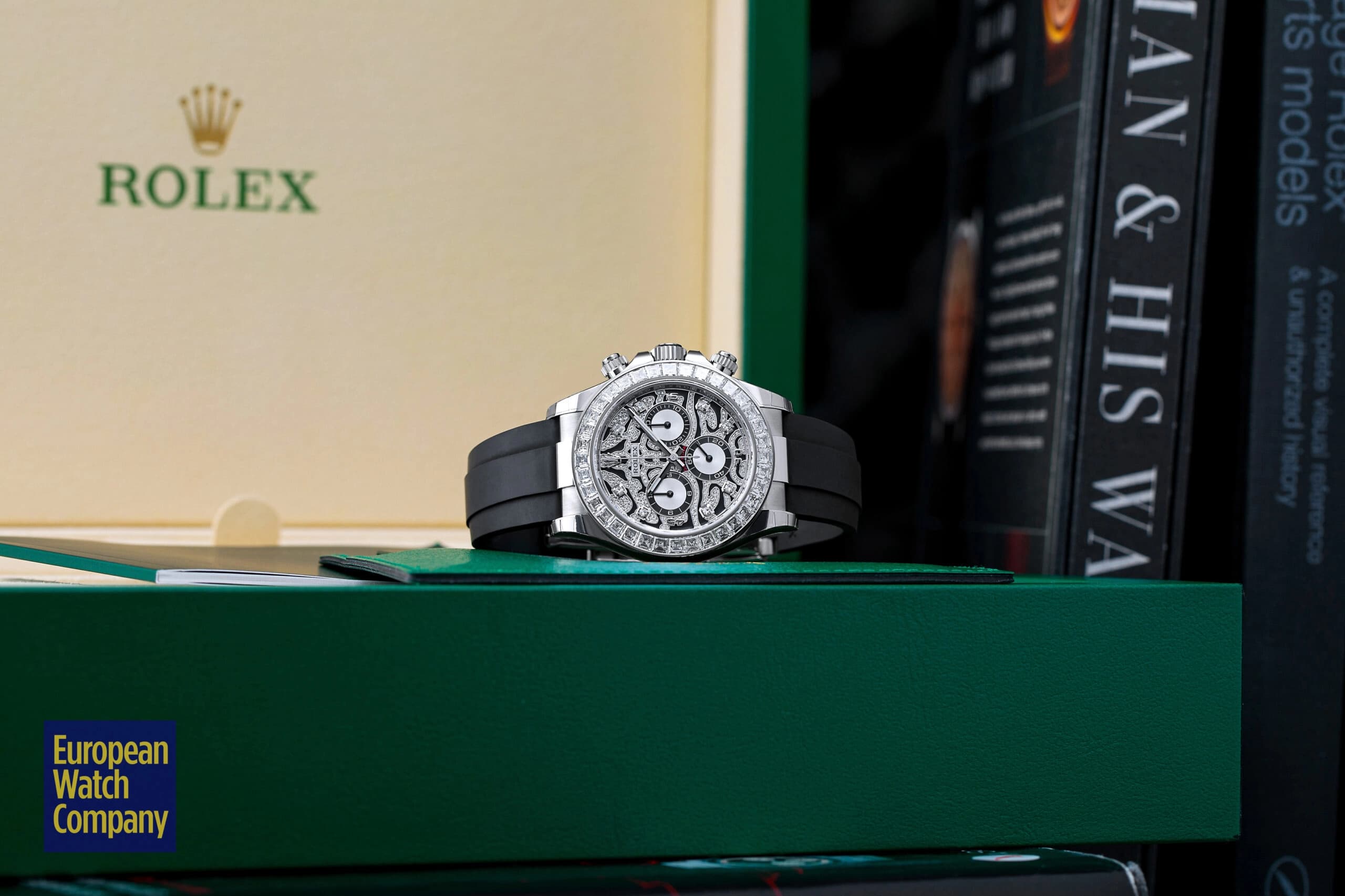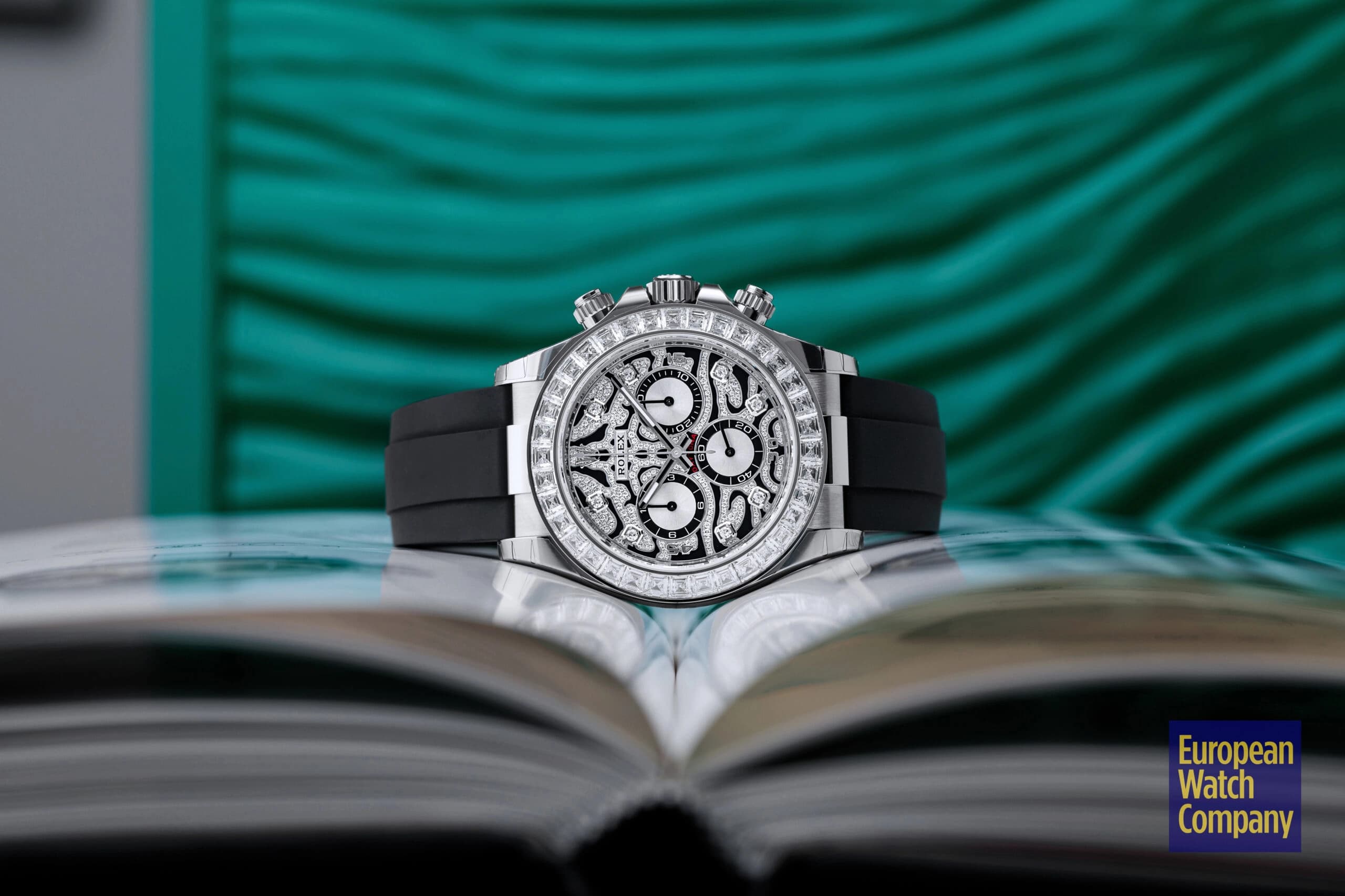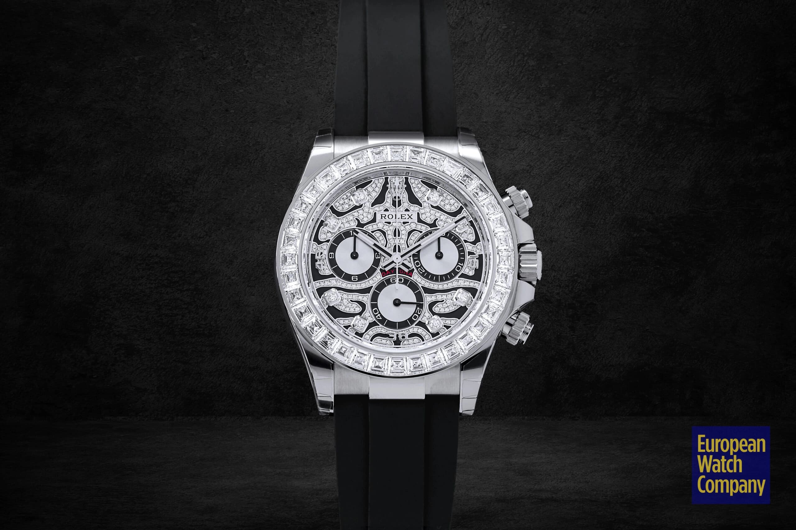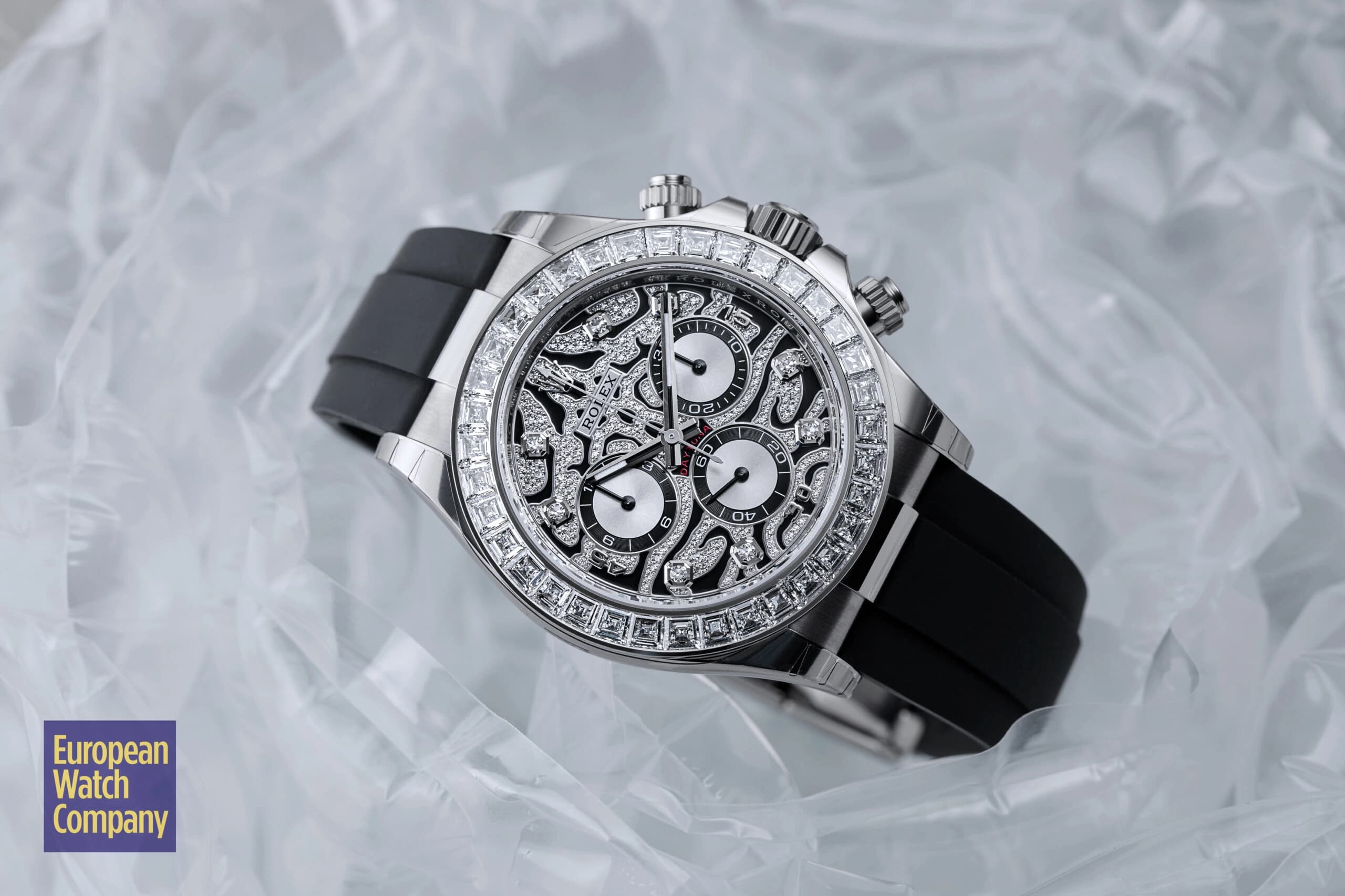 Conversely, if you want a mega-exclusive, gem-encrusted Daytona that isn’t inspired by a large jungle cat, then the Rolex Daytona 116595RBOW “Rainbow” may be the perfect timepiece for you. Arguably the single most famous off-catalog Rolex model, the ref. 116595RBOW makes an even bigger statement on the wrist due to its rainbow gradient sapphire bezel, diamond-set lugs, and matching rainbow colored baguette hour markers.