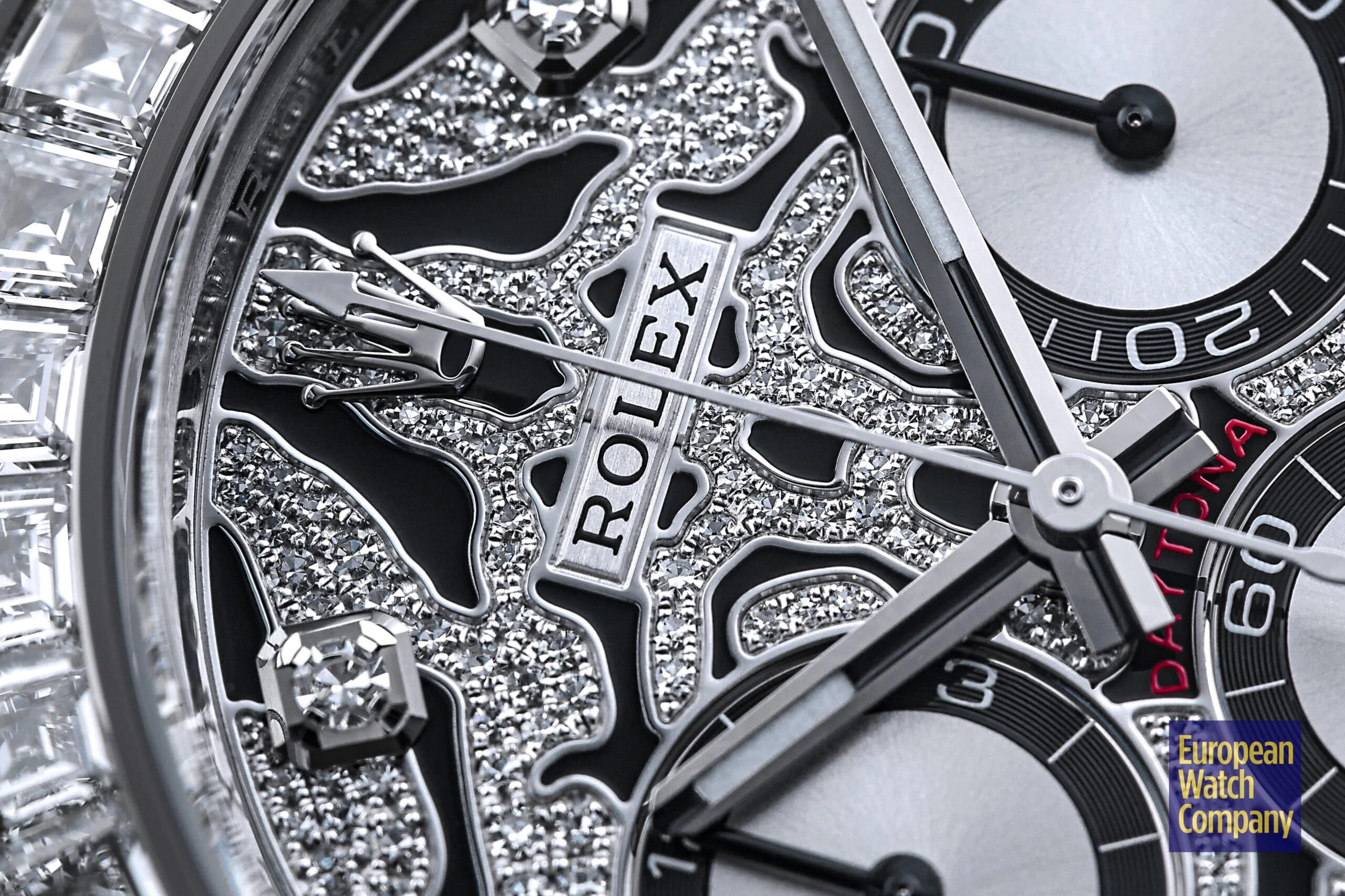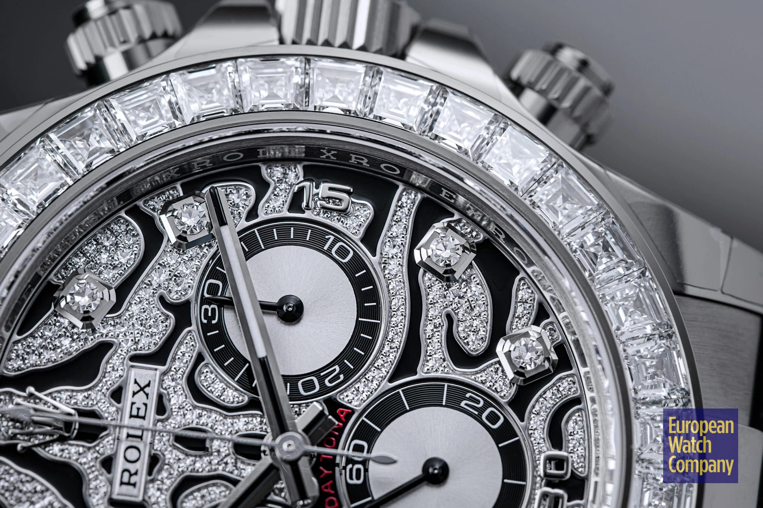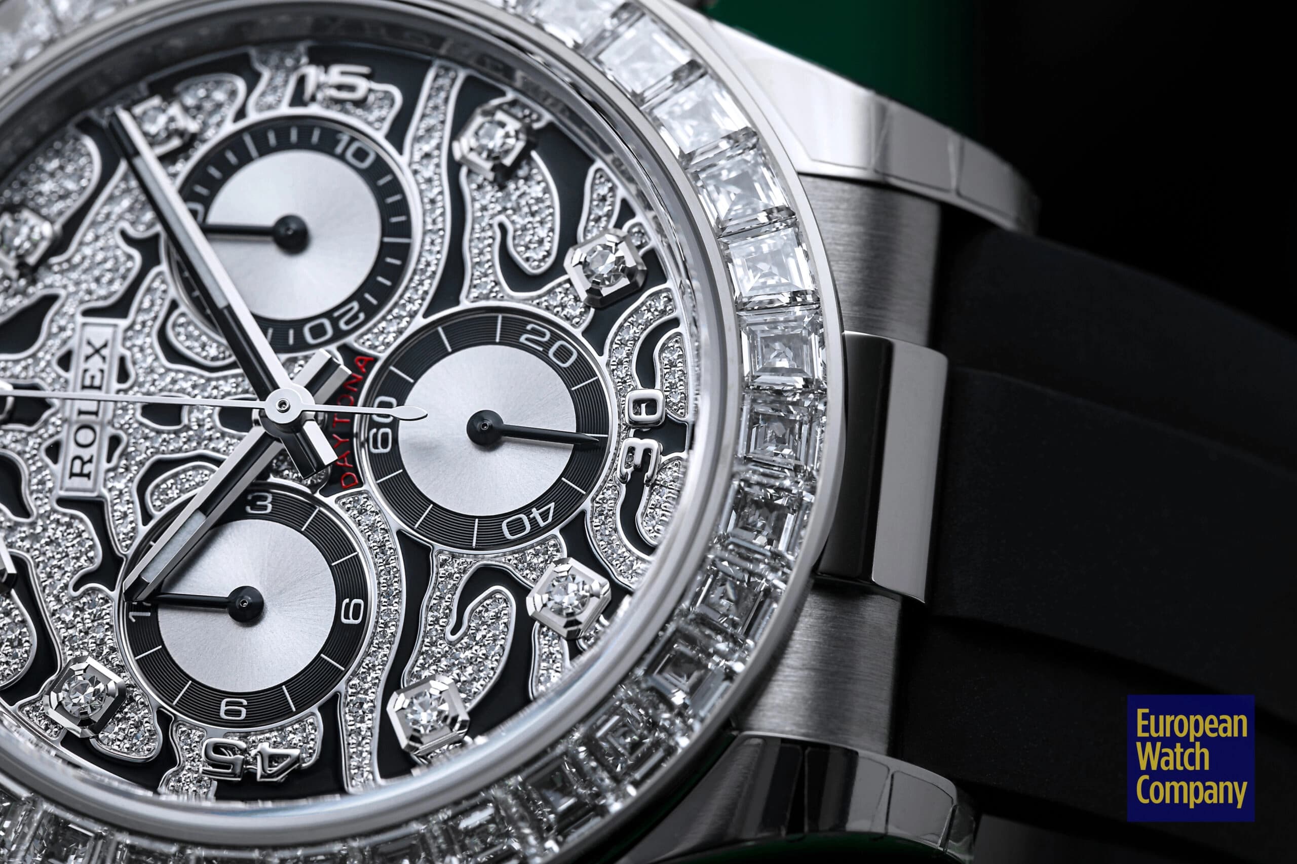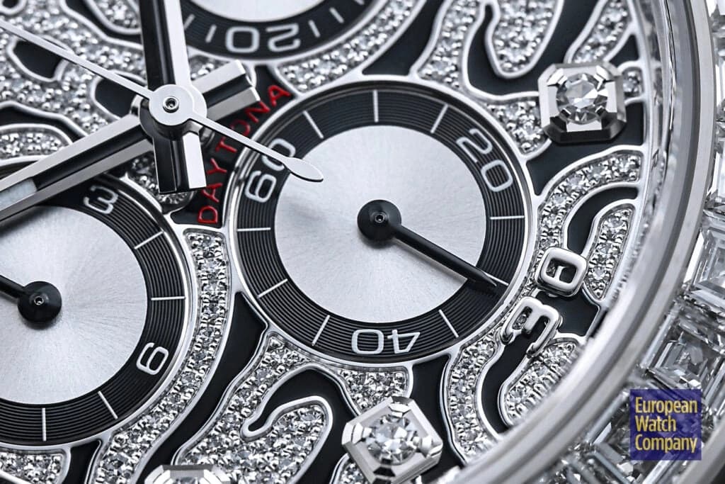 However, this is more or less where the visual similarities to the standard-production models end, and the dial and bezel fitted to the reference 116589TBR are unlike anything else you will find within Rolex’s current lineup. The “Eye of the Tiger” nickname comes from the watch’s dial, which features a striking motif consisting of a diamond-paved surface punctuated by black lacquer tiger stripes. The silver colored sub-dials feature black contrasting rings and remain largely unadorned, while the hour markers themselves are represented by additional brilliant-cut diamonds, with applied white gold Arabic numerals at the 15, 30, and 45 minute markers. Additionally, unlike the the normal Rolex Daytona models, the reference 116589TBR swaps out the usual tachymeter scale bezel for one that is set with 36 flawless trapeze-cut diamonds, and this immediately gives it an ultra-lavish appearance that is further elevated by its unmistakably opulent tiger stripe diamond dial.