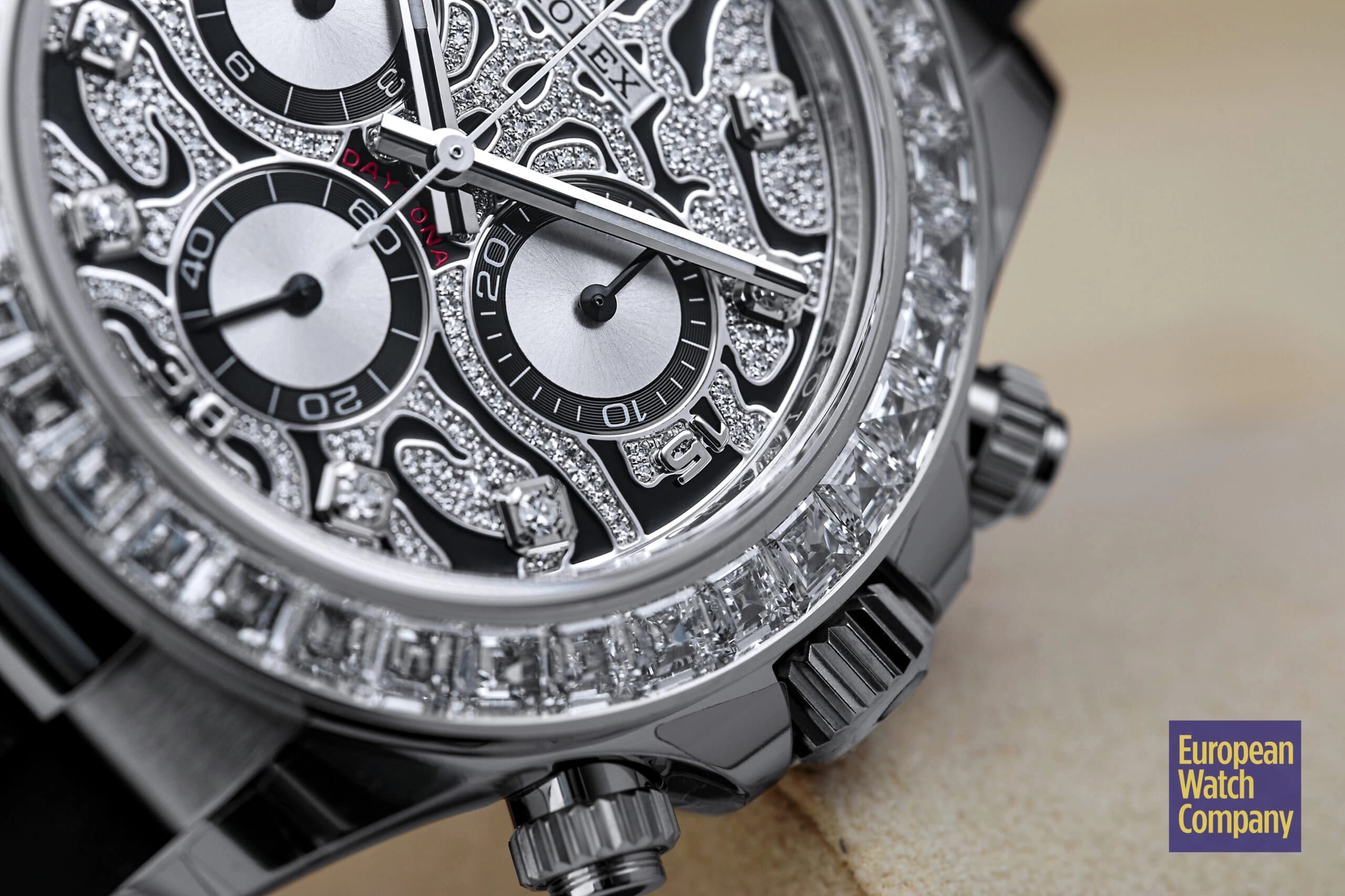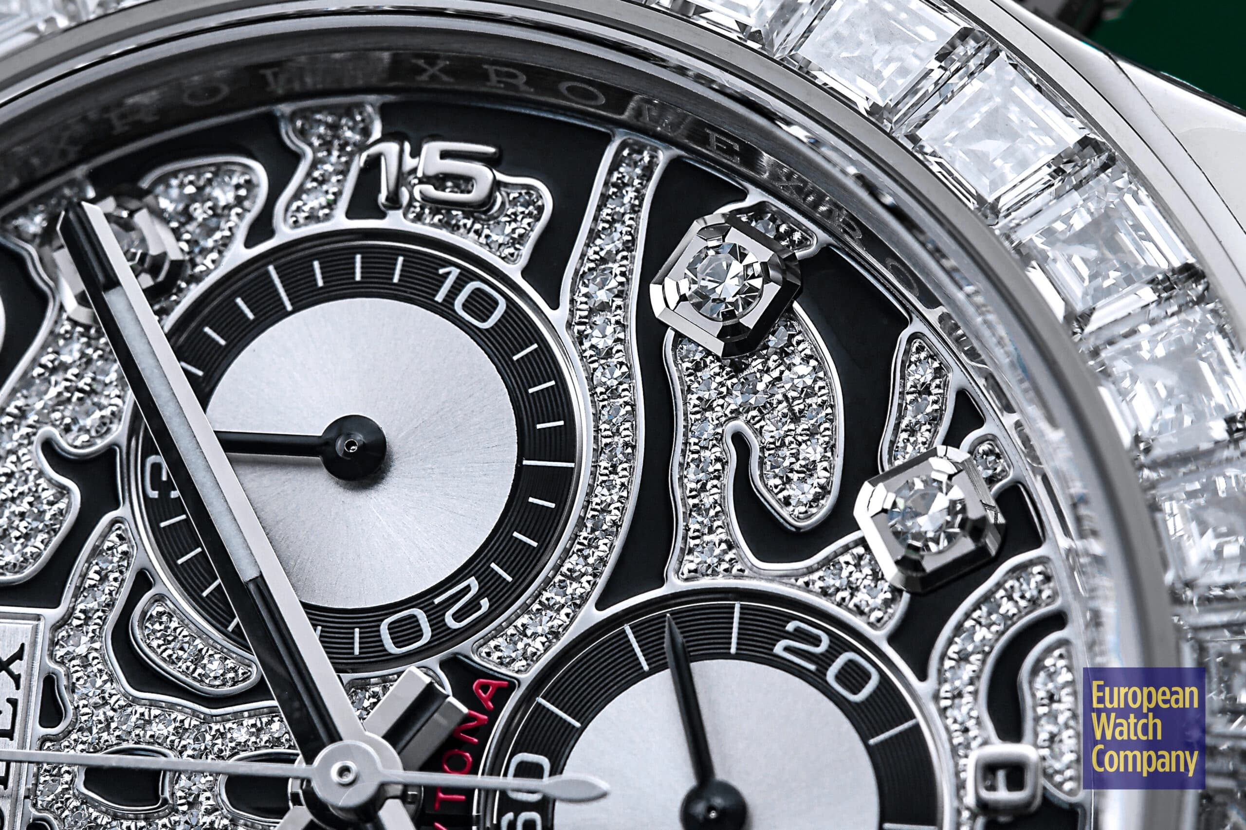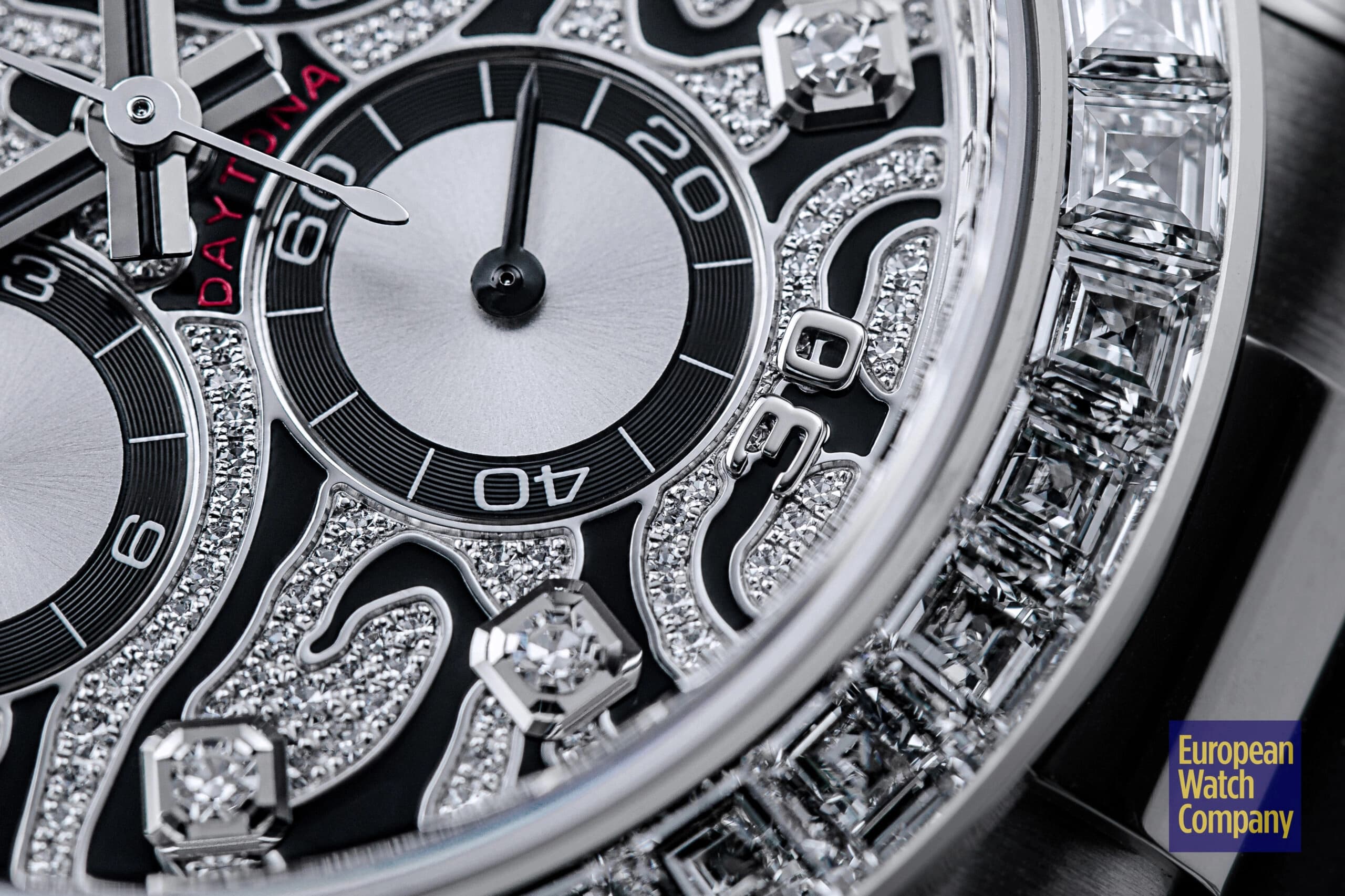 However, this is more or less where the visual similarities to the standard-production models end, and the dial and bezel fitted to the reference 116589TBR are unlike anything else you will find within Rolex’s current lineup. The “Eye of the Tiger” nickname comes from the watch’s dial, which features a striking motif consisting of a diamond-paved surface punctuated by black lacquer tiger stripes. The silver colored sub-dials feature black contrasting rings and remain largely unadorned, while the hour markers themselves are represented by additional brilliant-cut diamonds, with applied white gold Arabic numerals at the 15, 30, and 45 minute markers. Additionally, unlike the the normal Rolex Daytona models, the reference 116589TBR swaps out the usual tachymeter scale bezel for one that is set with 36 flawless trapeze-cut diamonds, and this immediately gives it an ultra-lavish appearance that is further elevated by its unmistakably opulent tiger stripe diamond dial.