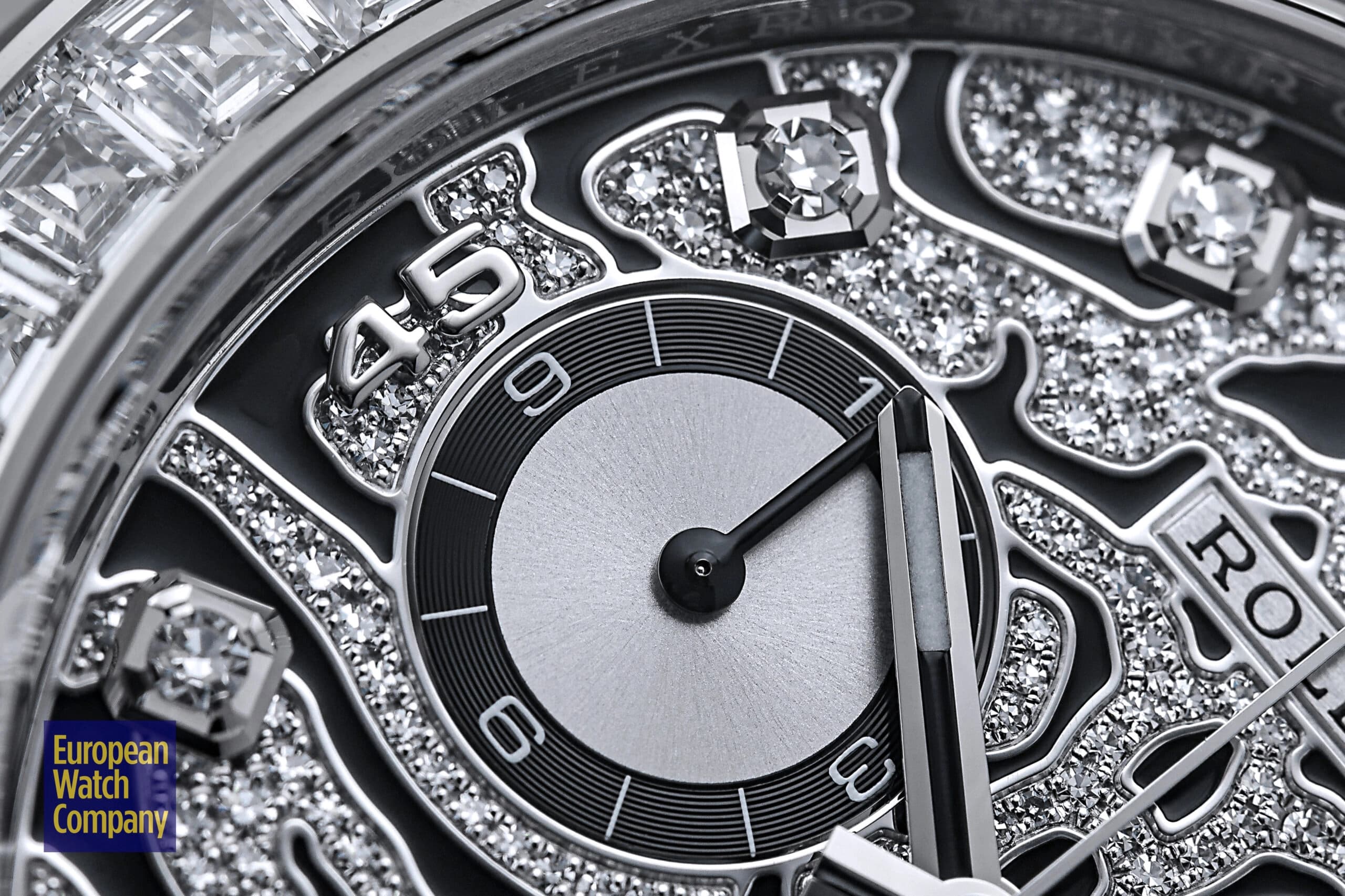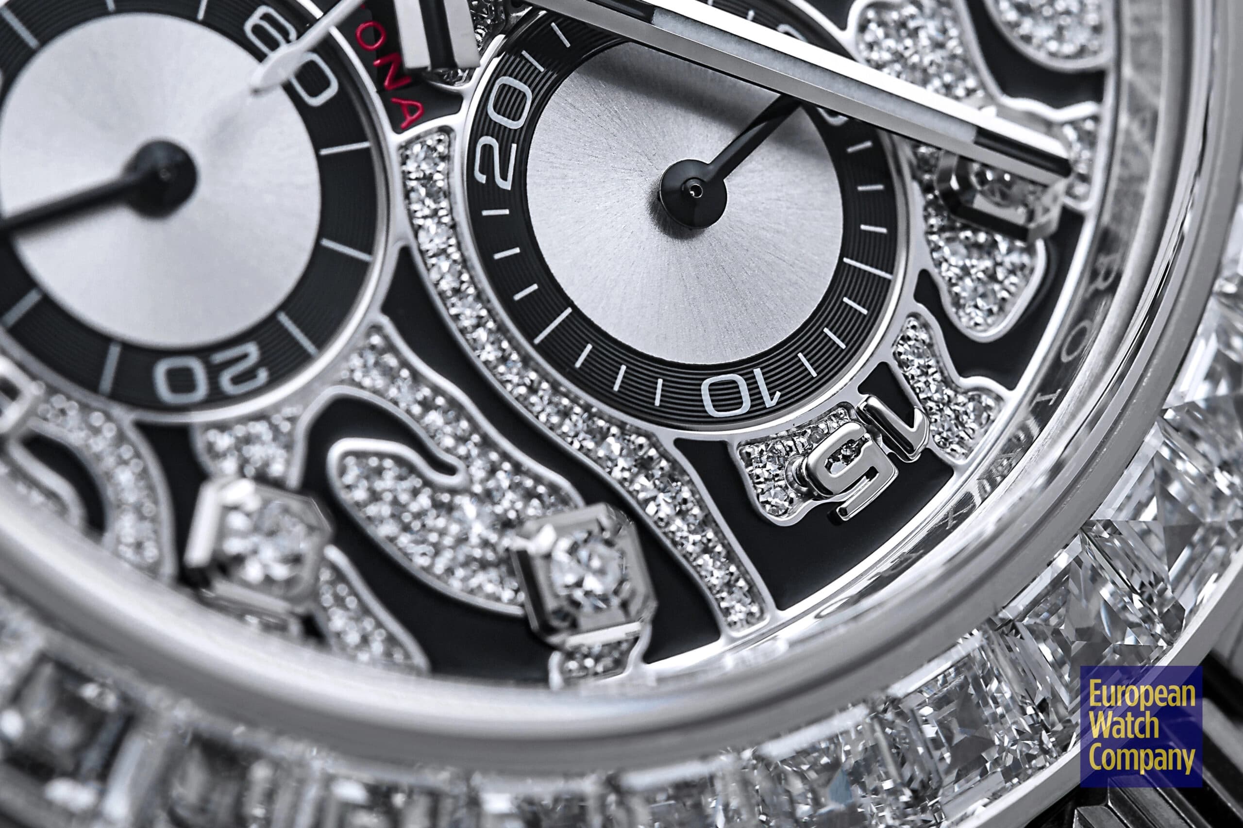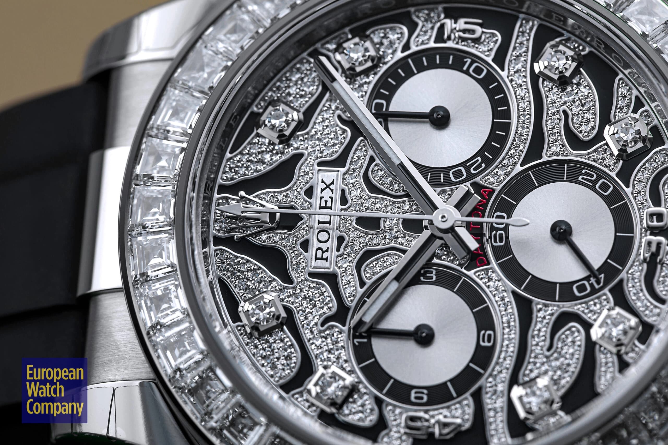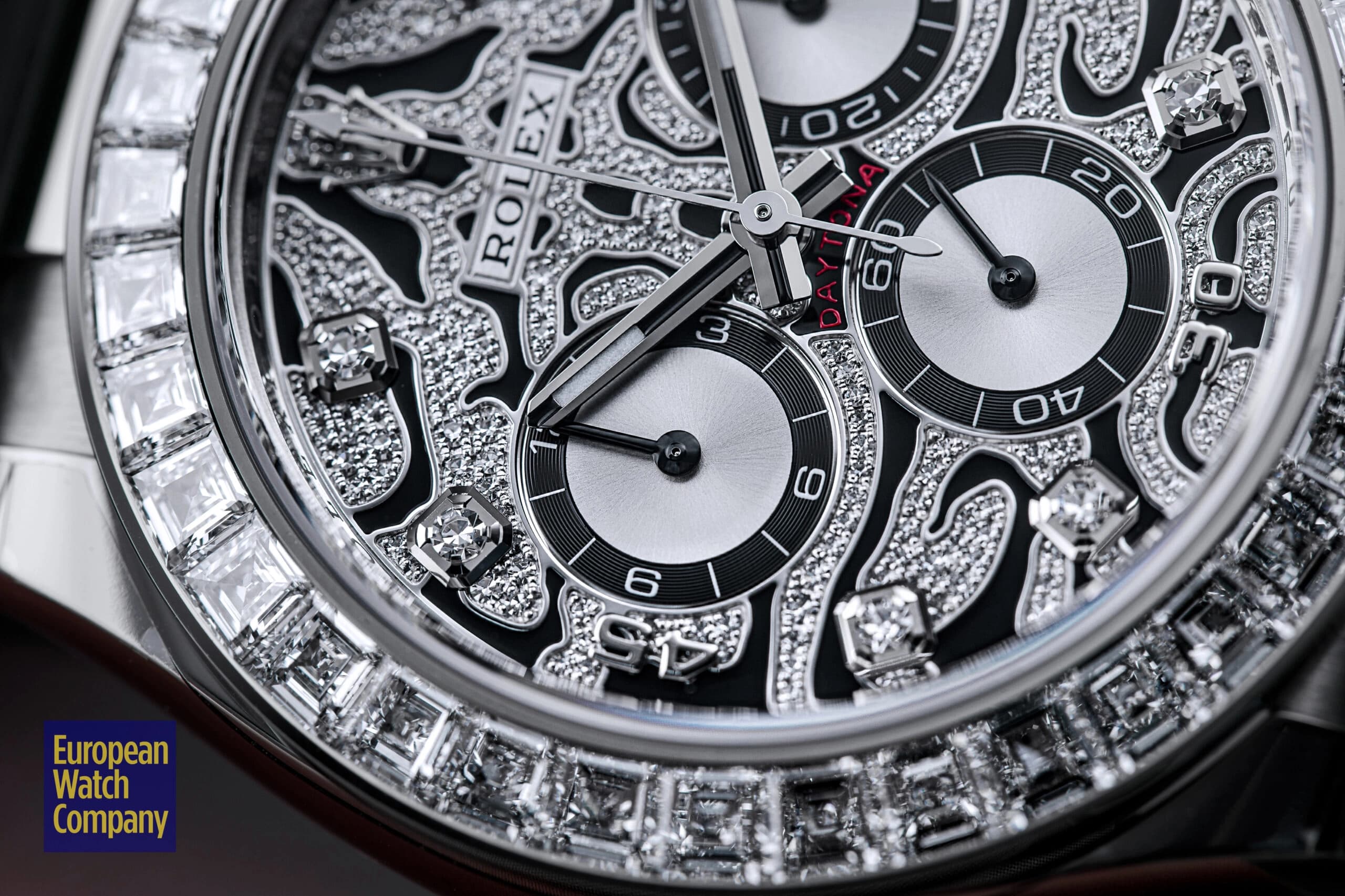 However, this is more or less where the visual similarities to the standard-production models end, and the dial and bezel fitted to the reference 116589TBR are unlike anything else you will find within Rolex’s current lineup. The “Eye of the Tiger” nickname comes from the watch’s dial, which features a striking motif consisting of a diamond-paved surface punctuated by black lacquer tiger stripes. The silver colored sub-dials feature black contrasting rings and remain largely unadorned, while the hour markers themselves are represented by additional brilliant-cut diamonds, with applied white gold Arabic numerals at the 15, 30, and 45 minute markers. Additionally, unlike the the normal Rolex Daytona models, the reference 116589TBR swaps out the usual tachymeter scale bezel for one that is set with 36 flawless trapeze-cut diamonds, and this immediately gives it an ultra-lavish appearance that is further elevated by its unmistakably opulent tiger stripe diamond dial.