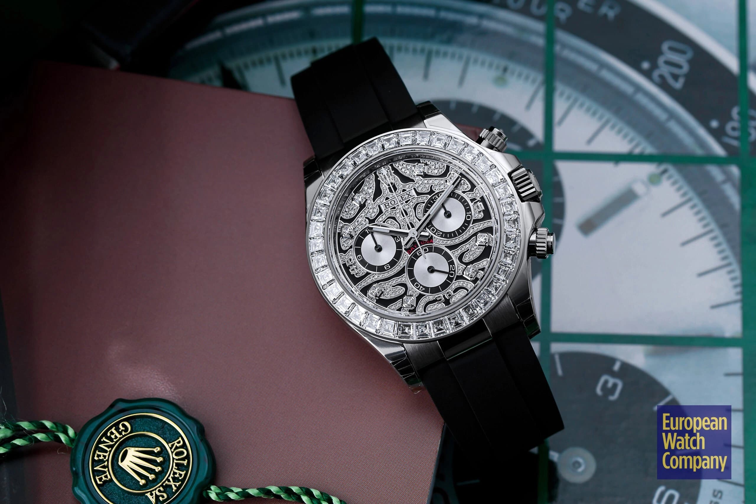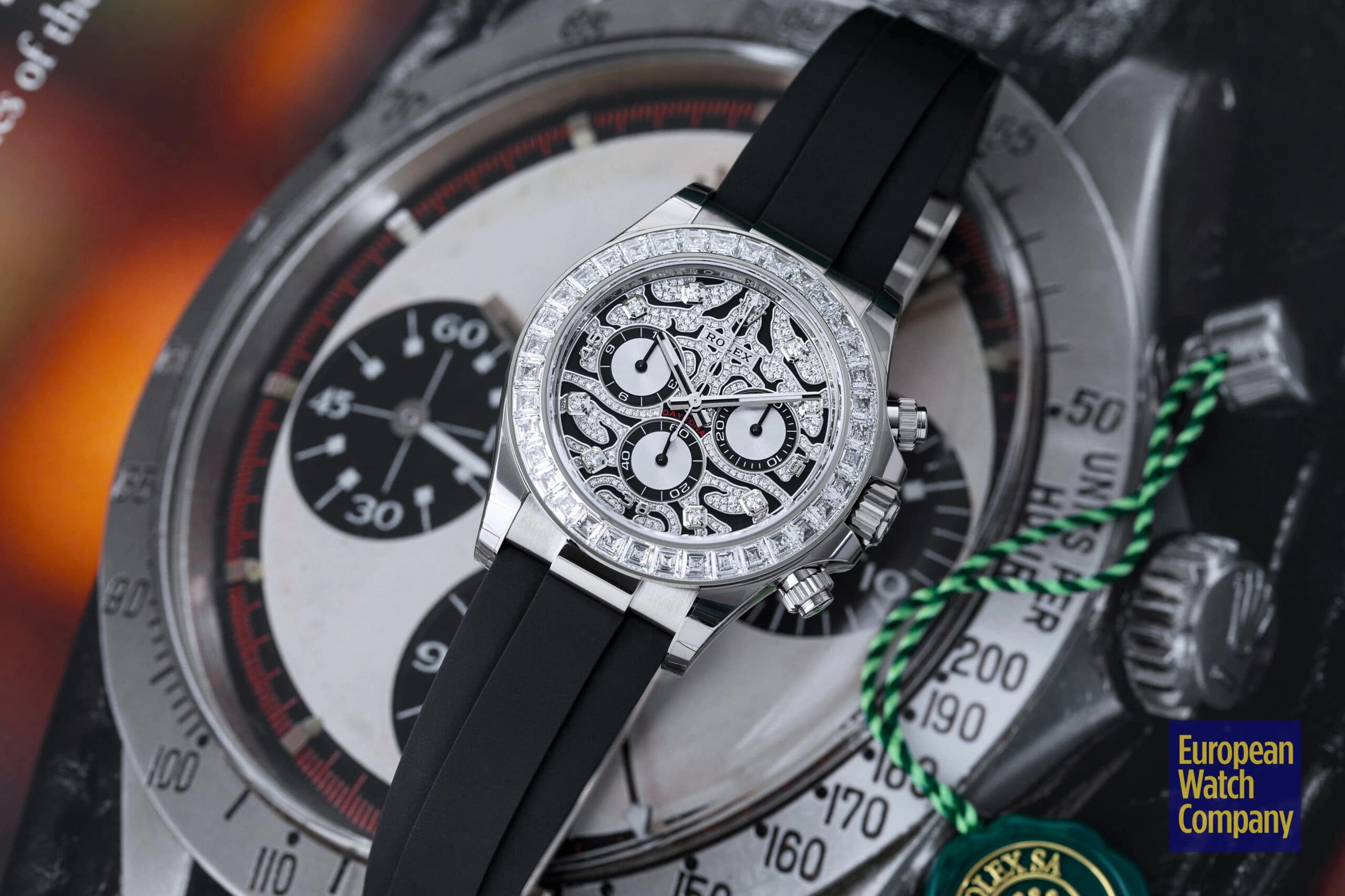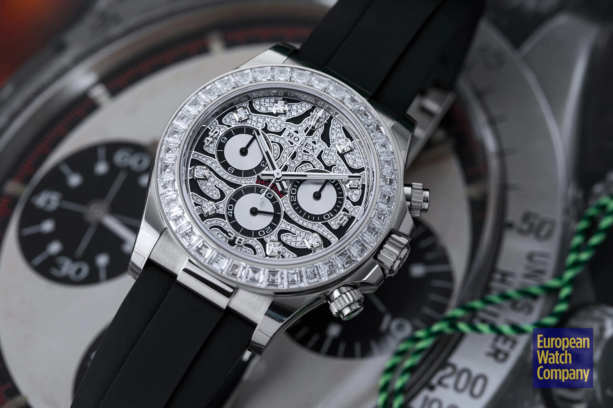 Although it was officially launched in 2021, the history of the reference 116589TBR technically starts in 2019, when Rolex unveiled its yellow gold counterpart (ref. 116588TBR) and first debuted the “Eye of the Tiger'' design for the Daytona collection. With that in mind, Rolex’s history of producing ultra-lavish and in-your-face Daytona watches inspired by big jungle cats significantly pre-dates the various “Eye of the Tiger'' models. The 2004 release of the “Leopard” Daytona ref. 116598SACO — with its leopard print dial and matching leather strap — is typically the first model that comes to mind whenever someone thinks of feline-inspired, gem-set Daytonas.