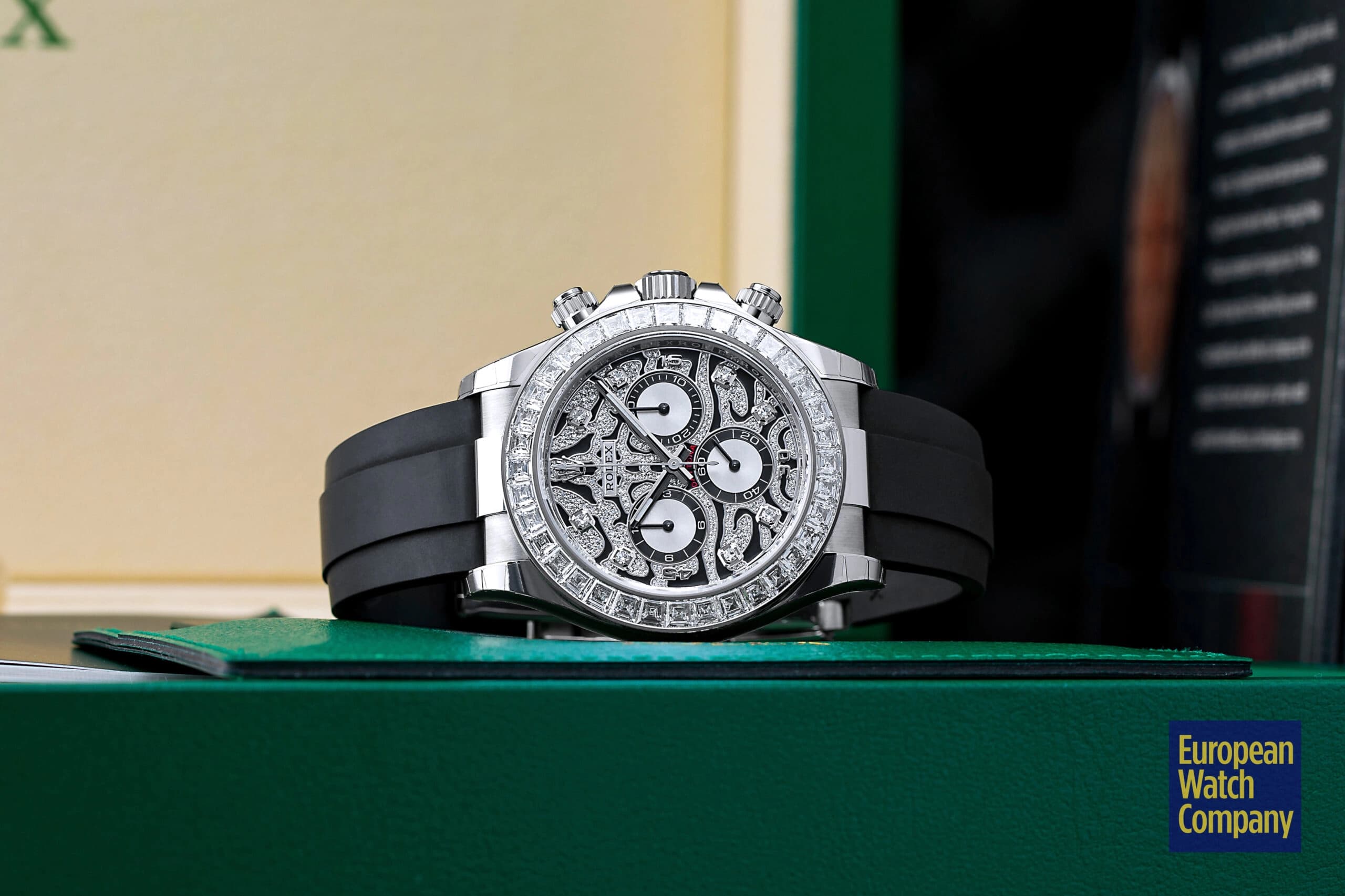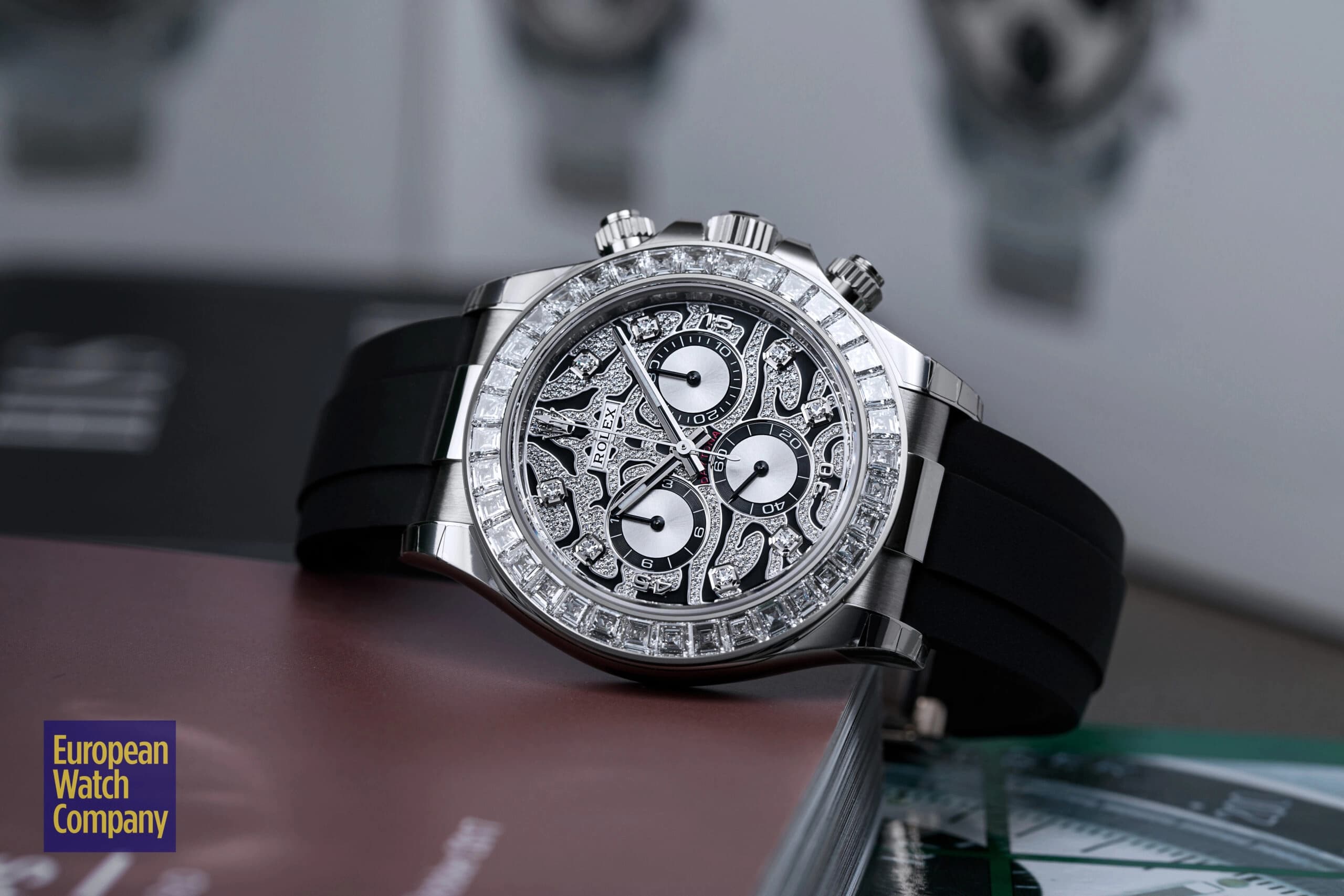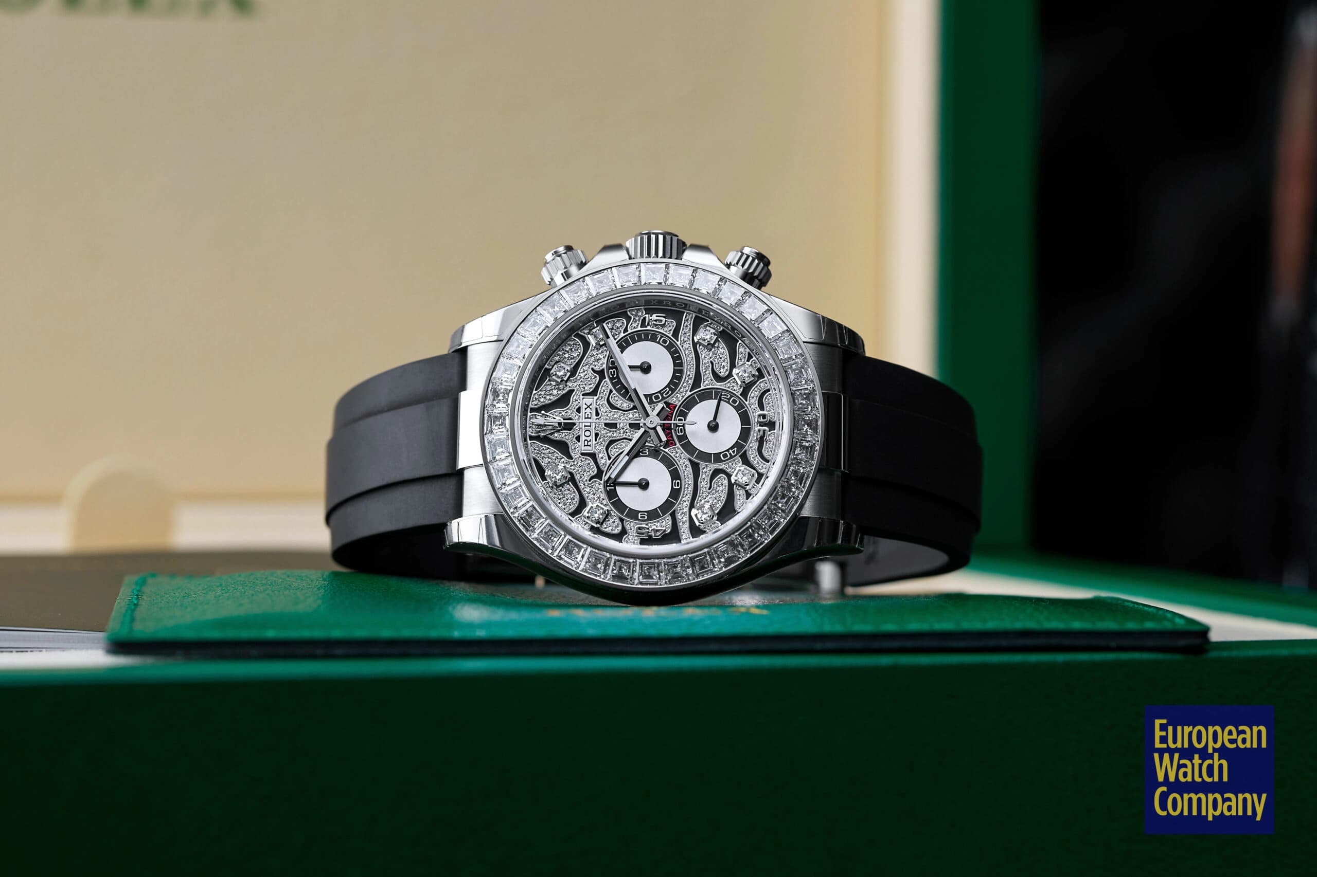 Although it was officially launched in 2021, the history of the reference 116589TBR technically starts in 2019, when Rolex unveiled its yellow gold counterpart (ref. 116588TBR) and first debuted the “Eye of the Tiger'' design for the Daytona collection. With that in mind, Rolex’s history of producing ultra-lavish and in-your-face Daytona watches inspired by big jungle cats significantly pre-dates the various “Eye of the Tiger'' models. The 2004 release of the “Leopard” Daytona ref. 116598SACO — with its leopard print dial and matching leather strap — is typically the first model that comes to mind whenever someone thinks of feline-inspired, gem-set Daytonas.