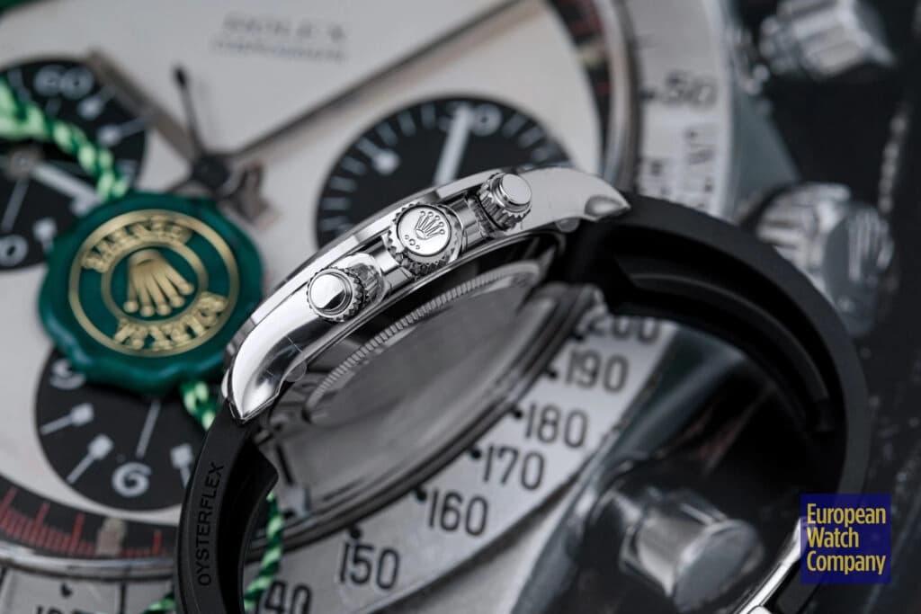 Although the reference 116589TBR “Eye of the Tiger” is anything but your normal everyday Rolex, it is still a Daytona at its core, and it therefore features the same fan-favorite Oyster case that measures 40mm in diameter by 12.5mm thick, with 20mm wide lugs and a flat sapphire crystal protecting its dial. Similarly, just like other current-production Daytona models, the ref. 116589TBR features a Triplock crown, a solid caseback, and a pair of screw-down chronograph pushers, which collectively help provide it with 100 meters of water resistance, despite its overtly lavish appearance. Additionally, just like other solid gold Rolex Daytona watches that are fitted with Oysterflex bracelets, the ref. 116589TBR “Eye of the Tiger” features small lug-hoods that play the role of end-links and fill the gap between the edge of the case and where the bracelet attaches to the lugs.
