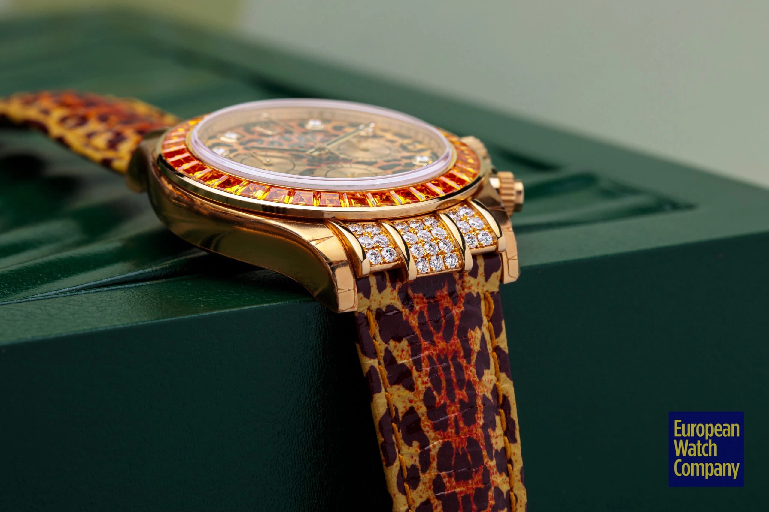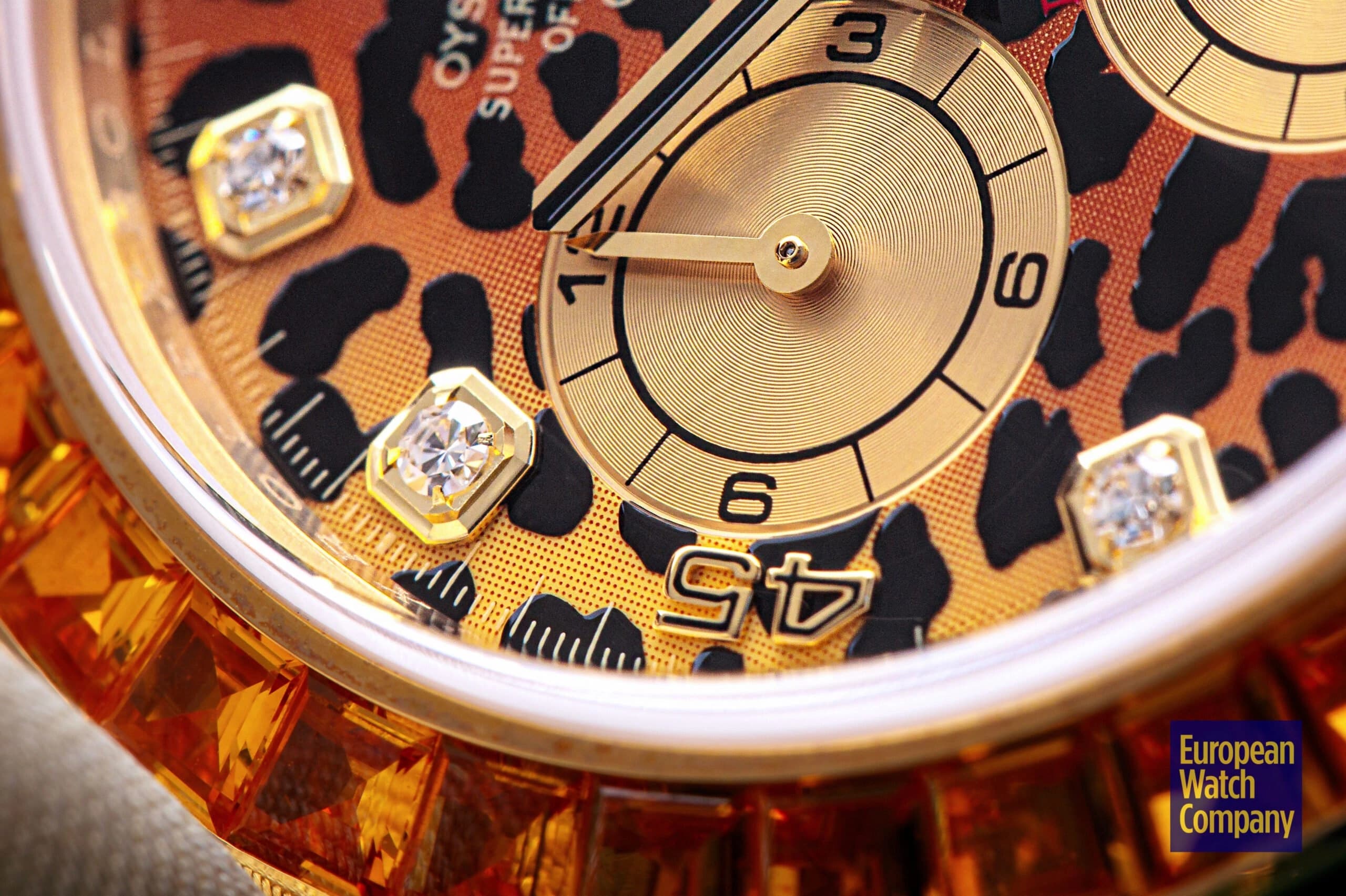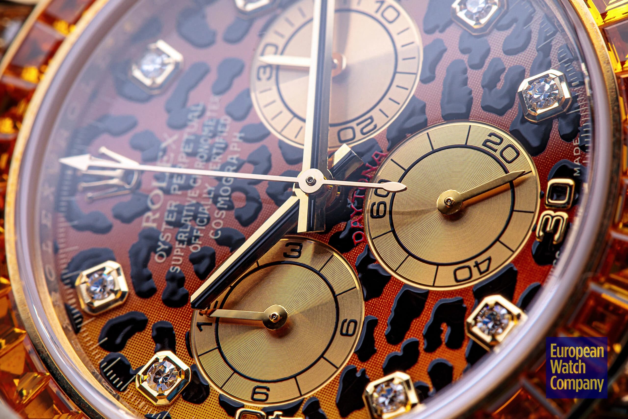 Let’s begin with the simple specs before getting into the outrageous decor. The Daytona Leopard comes in a 40mm 18k gold case that’s 12mm thick, 50.6mm lug-to-lug, and has 20mm lugs. The watch is water resistant to 100m thanks to the gold screwdown pushers and screwdown Triplock crown on the 3 o'clock side. Aside from the screwdown caseback, the entire watch is polished. The watch features a sapphire crystal over the dial and is surrounded by a bezel set with 36 baguette-cut cognac sapphires in place of the traditional tachymeter scale.