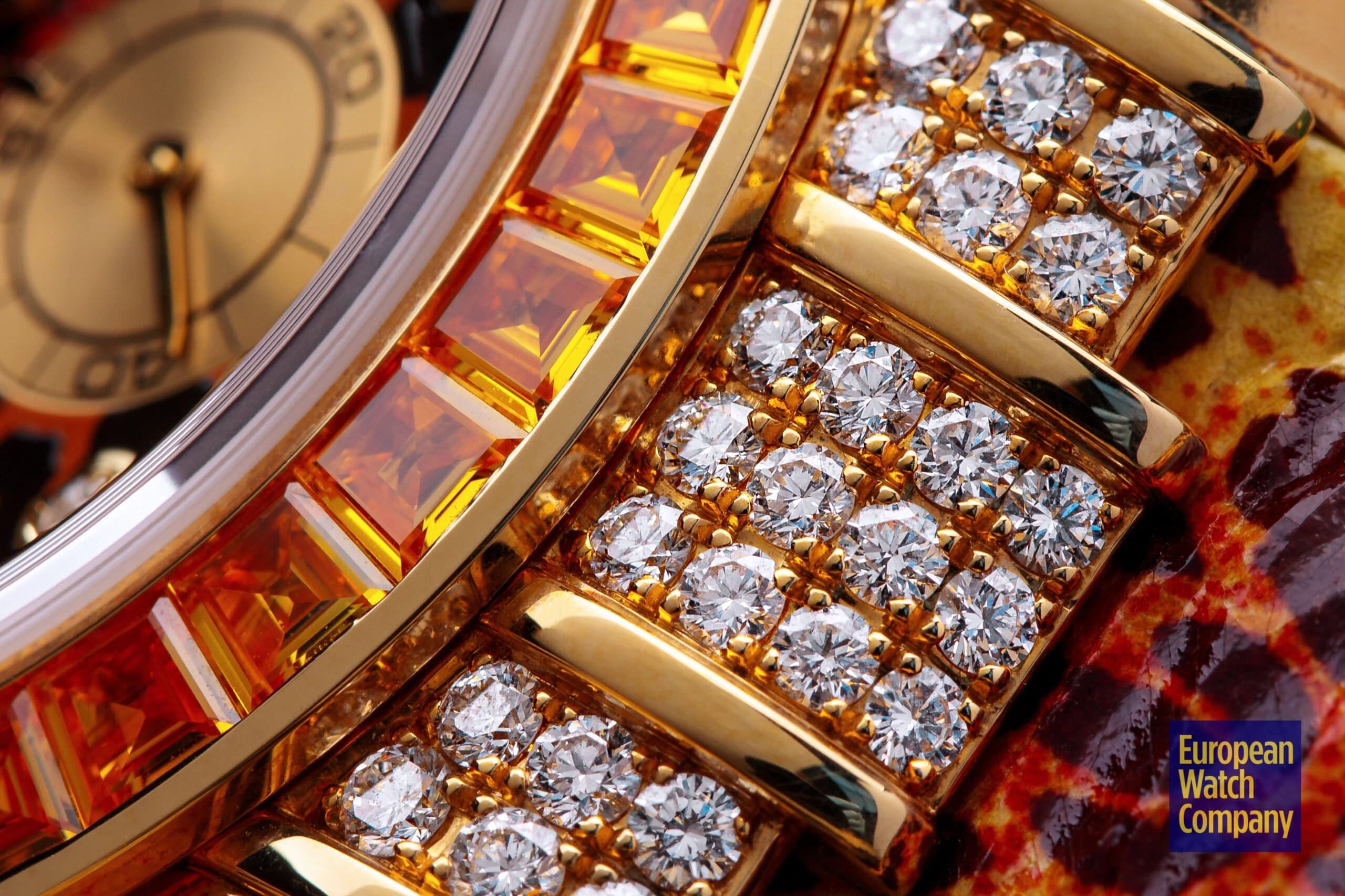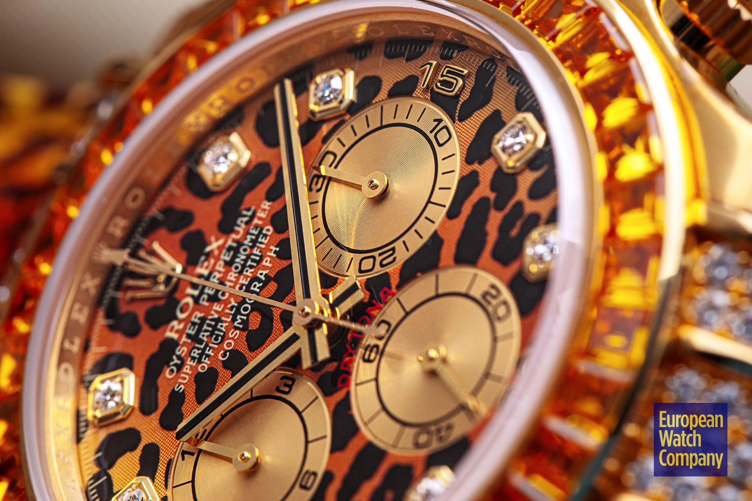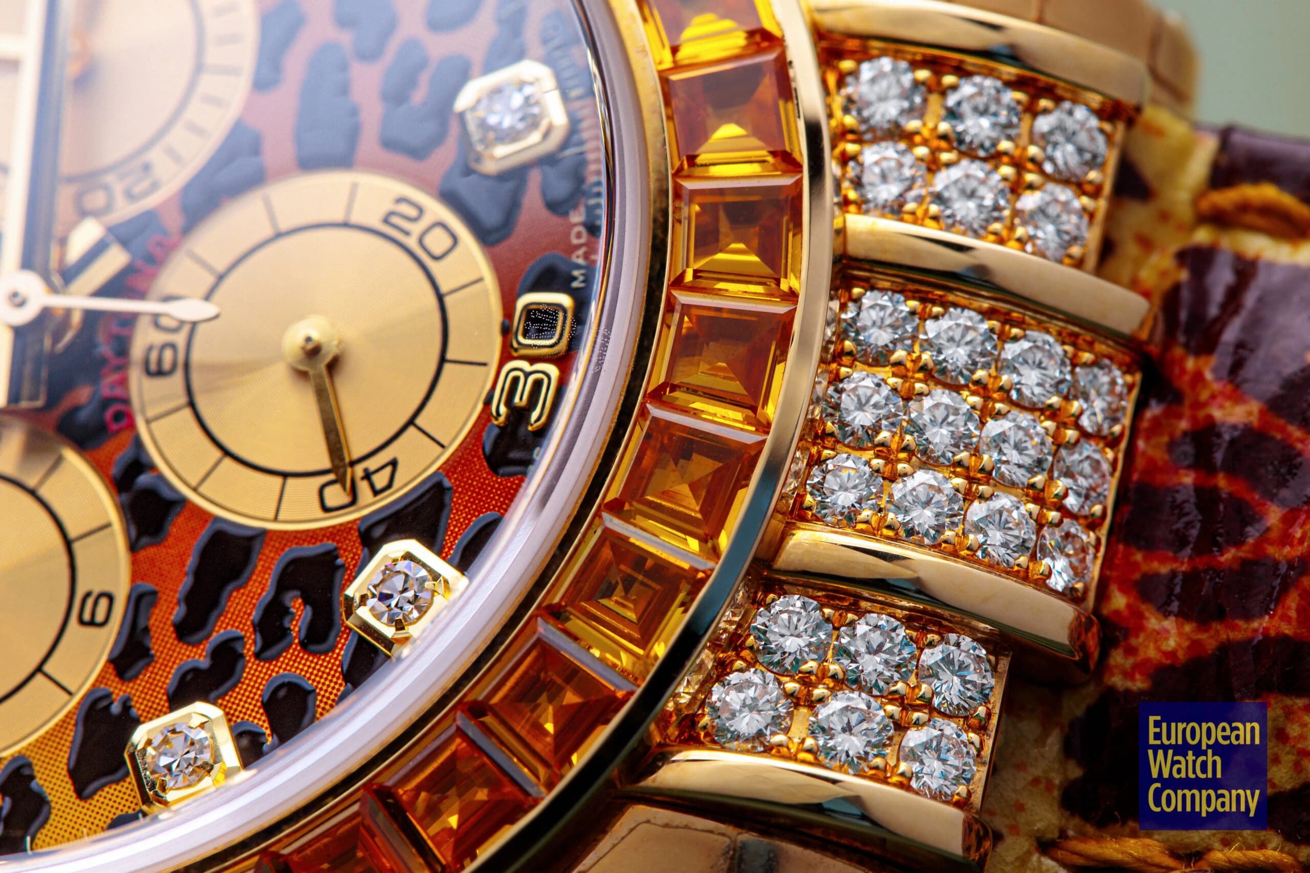 Let’s begin with the simple specs before getting into the outrageous decor. The Daytona Leopard comes in a 40mm 18k gold case that’s 12mm thick, 50.6mm lug-to-lug, and has 20mm lugs. The watch is water resistant to 100m thanks to the gold screwdown pushers and screwdown Triplock crown on the 3 o'clock side. Aside from the screwdown caseback, the entire watch is polished. The watch features a sapphire crystal over the dial and is surrounded by a bezel set with 36 baguette-cut cognac sapphires in place of the traditional tachymeter scale.
