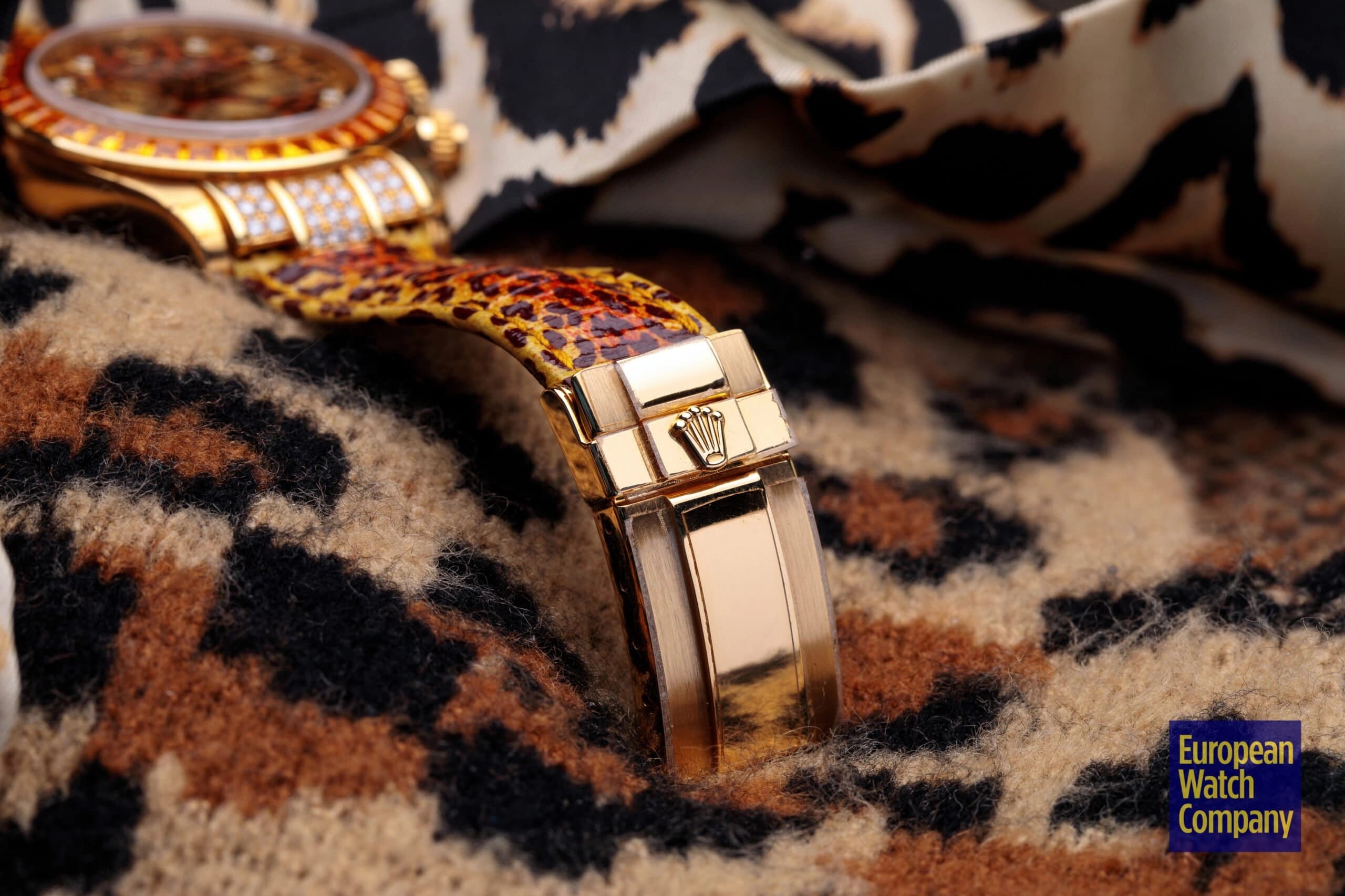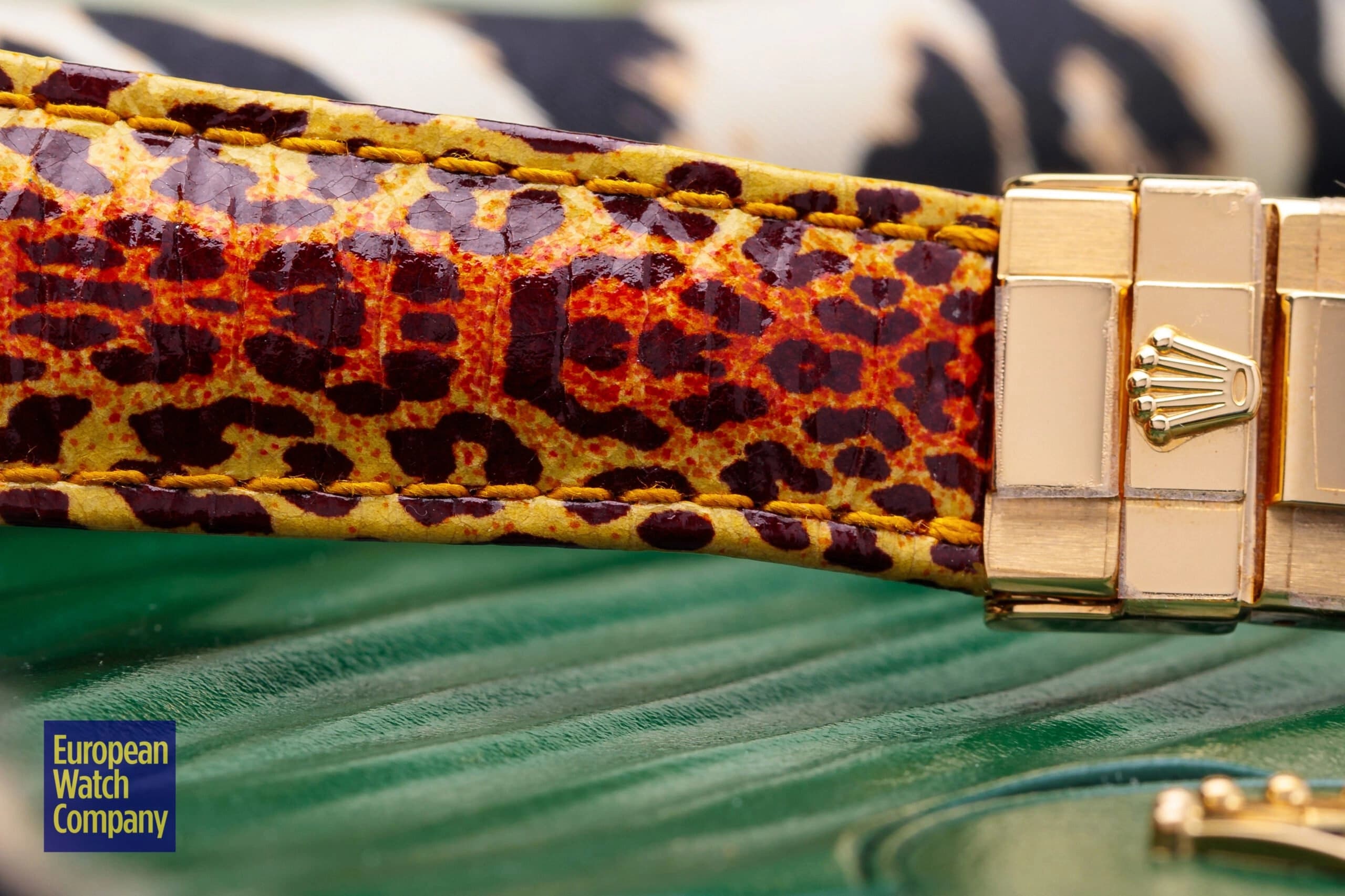 You may have read the description of the dial and thought, “That’s what makes this watch so crazy.” You’re entitled to your thoughts, but that one is wrong. What makes the 116598 SACO so crazy is the strap and its endlinks. First, Daytona’s rarely come on anything other than a bracelet (recent Oysterflex options being the exceptions), so finding this on a leather strap at all is jarring. However, it's not just a leather strap, it’s a leopard print leather strap that matches the dial. Taking it a step (or several) further are the endlinks: each is set with 24 diamonds, segmented 6-12-6 by gold dividers and mimicking, if you will, a leopard’s claw. It’s the leopard print and the claw-like endlinks that elevate this watch from intriguing to extravagant. For what it’s worth, the strap has a solid gold deployant Oysterclasp.