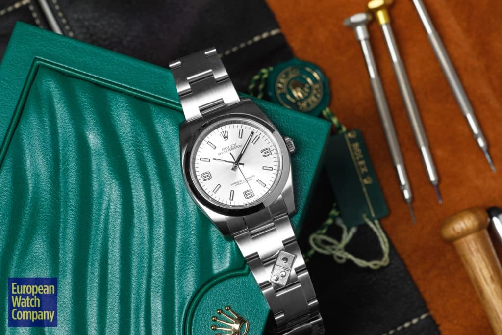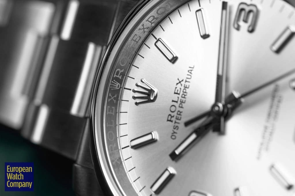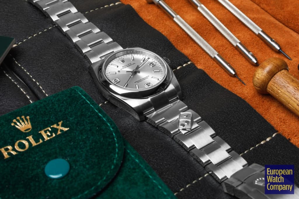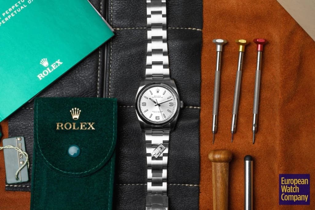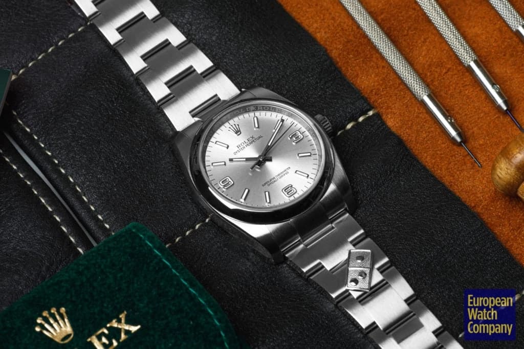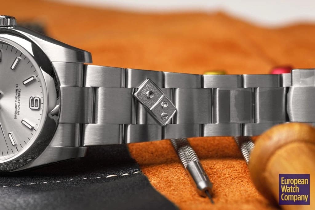 The 904L stainless steel case and bracelet are both in the Oyster style and are primarily brushed with just enough polished accents to keep the watch from being too casual. With its domed bezel and classic Oyster profile, the watch has a simple but timeless design. The case has a screw-down crown and is water-resistant to 100 meters. The modern case and Oyster bracelet will take anything you can throw at them and likely easily outlast you. While the Oyster Perpetual case design is excellent and its bracelet among the best on the market, they're standard issue for any Oyster Perpetual, and this Oyster Perpetual is anything but standard.