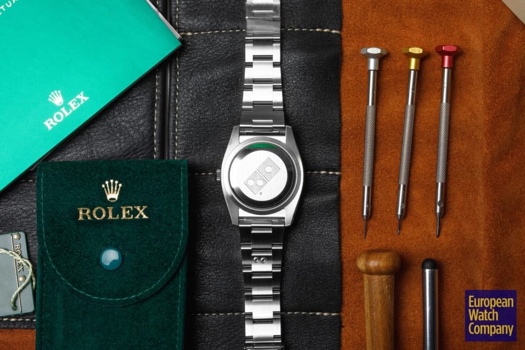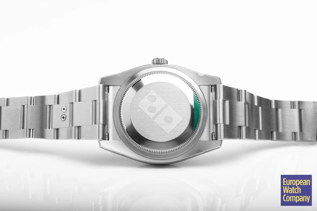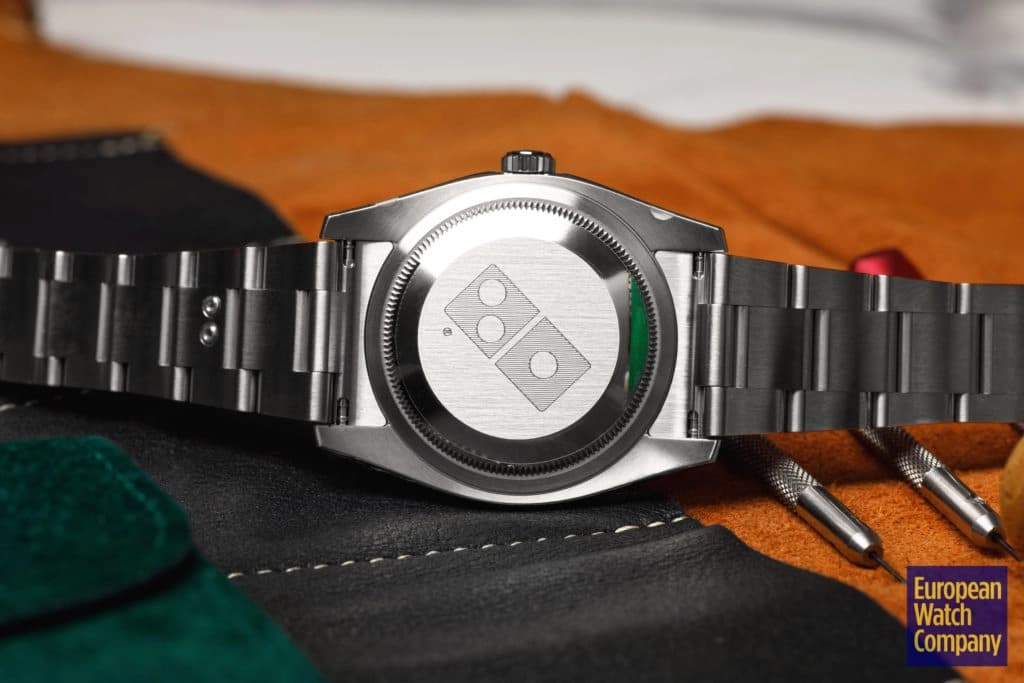 Obviously, what sets this watch apart is the metal-applied Domino's logo on the bracelet and the more subtle but equally cool engraved Domino's logo on the caseback. These two features instantly set this watch apart from anything else in the Rolex line-up. The metal badge is fixed directly to the bracelet, and while noticeable, it doesn't directly call attention to itself. The caseback engraving logo is simple and matches the one on the bracelet. When looking at older Domino's examples with the full-color logo on the dial, I could see some thinking it's too cheesy or loud. But that's not the case with this example. The co-branding is well done and very cohesive. There's no part of it that feels like an afterthought.